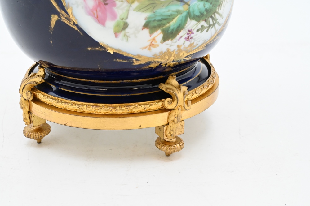 Lot 60: French Porcelain Cache Pot, royal blue having painted romantic scene on bronze base, height 8 1/8 inches.