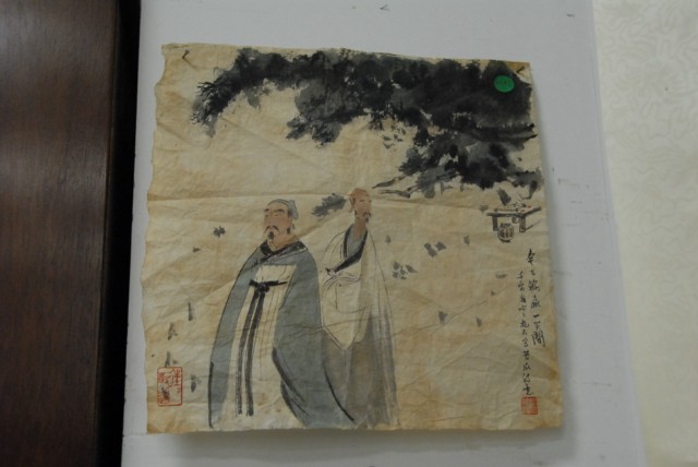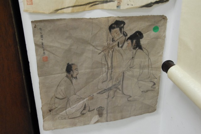 Group of 3 watercolor on tissue pape, 2 landscapes with scholars and one of two girls with scholar