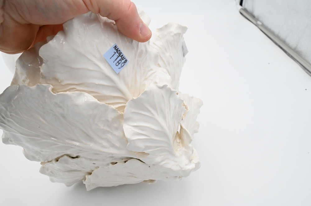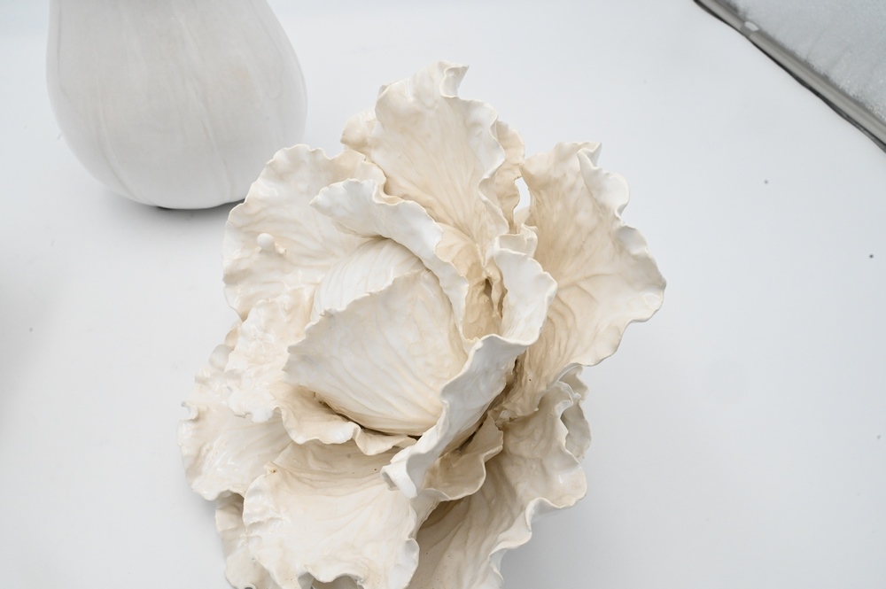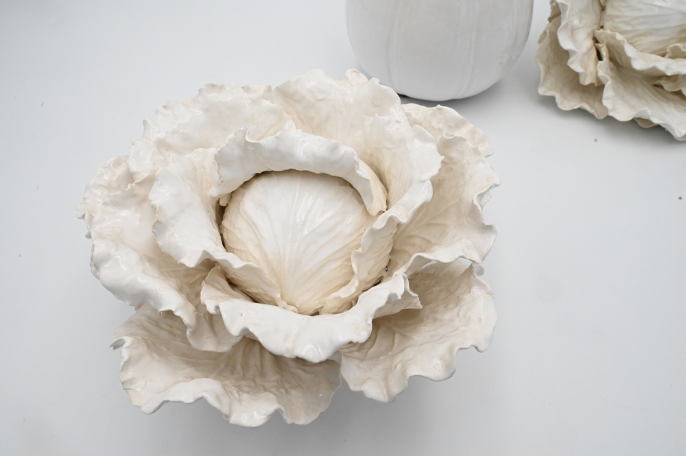 Lot 60: Jean-Paul Gourdon (b. 1956), white glazed ceramic cabbage along with another white glazed cabbage that is unsigned (repaired), and a…