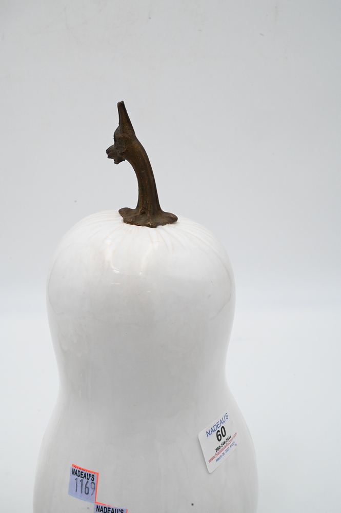 Jean-Paul Gourdon (b. 1956), white glazed ceramic cabbage along with another white glazed cabbage that is unsigned (repaired), and an eggplant with bronze stem signed on bottom, height 13 inches.