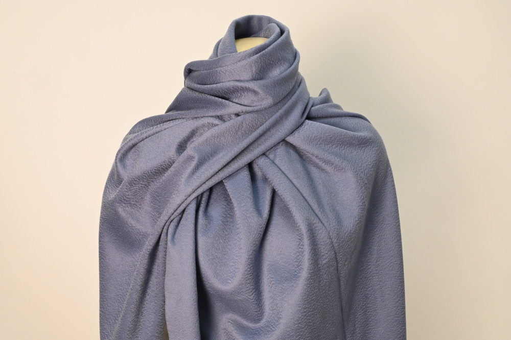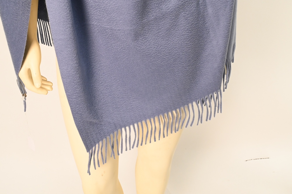 Lot 60: Loro Piana Fringed Cashmere Shawl, periwinkle, one size, in excellent condition, original price $1,225, 30″ x 84″ including fringe.