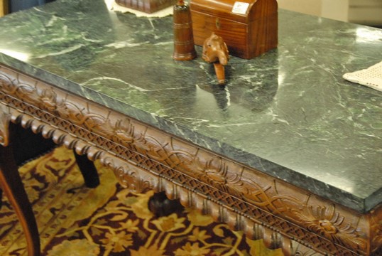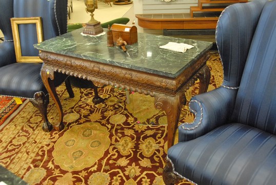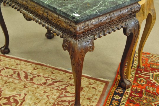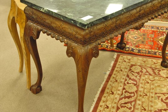 Lot 60: Pair of Century Furniture Co. marble top hall table with ball and claw feet signed The Sutton Collection, ht. 34 1/2in., wd. 50 1/2i…