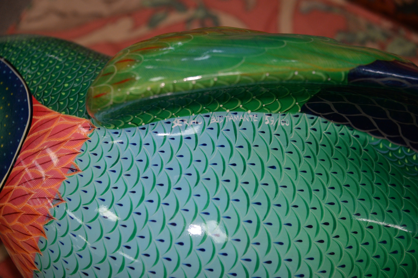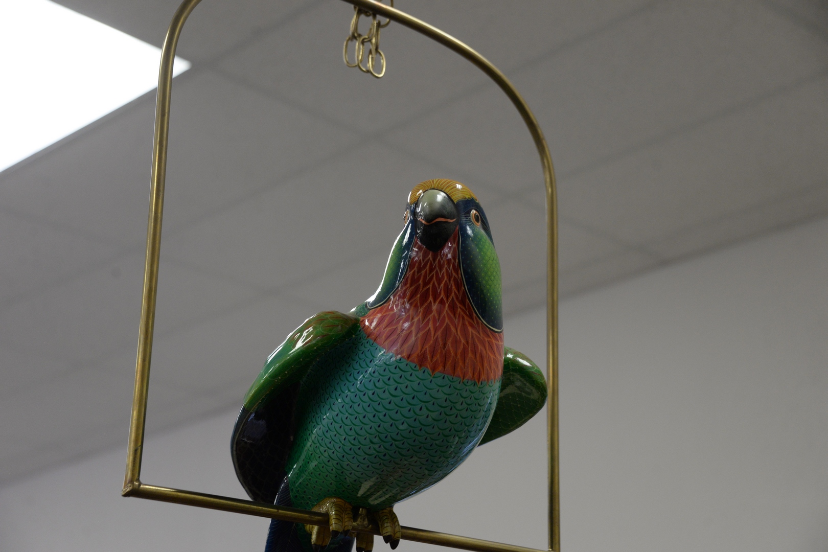 Sergio Bustamante (Mexican, b. 1949), parrot on a swing, papier mache, signed and editioned under the wing, “Sergio Bustamante, 59/100”, height 25 inches, width 11 1/2 inches, depth 9 inches. Provenance: Estate of James Wadhams.