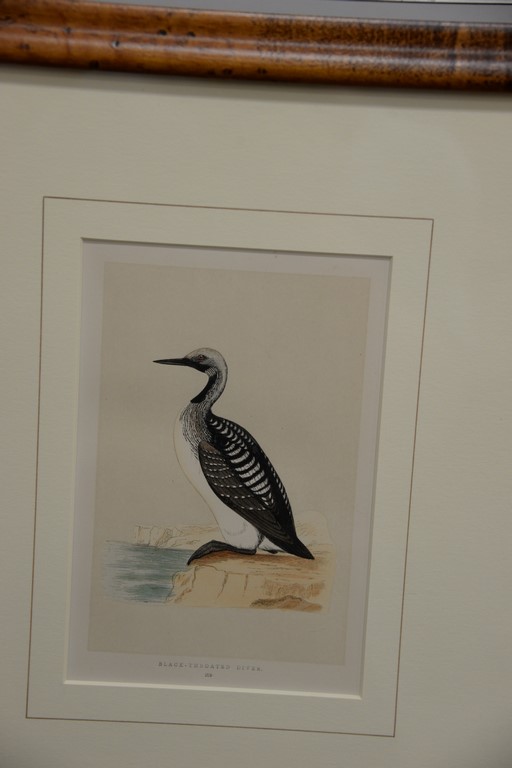 Set of eight hand colored framed bird lithographs by Francis Orpen Morris from the History of British Birds to include Kingfisher, Bluebreast, Dartford Warbler, Linnet, Crested tit, Black-throated Diver, Night Heron, and Chaffinch. 8 x 5 1/2
