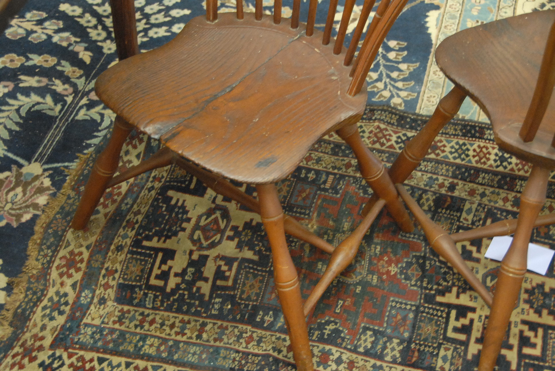 Set of five E. B. Tracy Windsor bow back side chairs with bamboo turned legs, signed on bottoms E. B. Tracy two seats split. seat ht. 4 15 1/2 in. & 1 16 in. Provenance: Property from the Estate of Elizabeth and Edward Wallace of The Tracy House in Meriden, Connecticut.