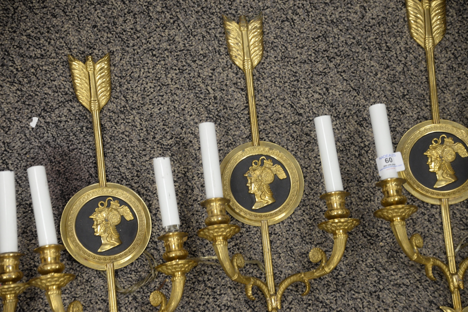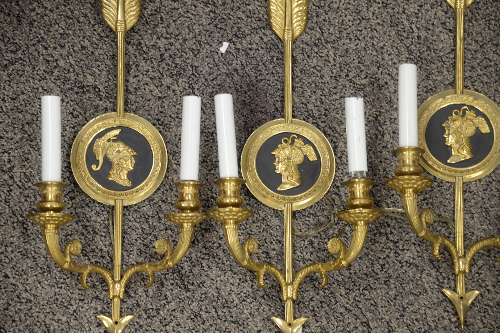 Lot 60: Set of Four Gilt Bronze Wall Sconces, each having two lights, body having an arrow form and each having an inset black panel of Zeus, height 19 1/4 inches, width 8 1/2 inches.