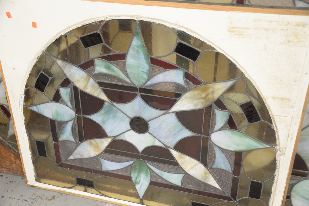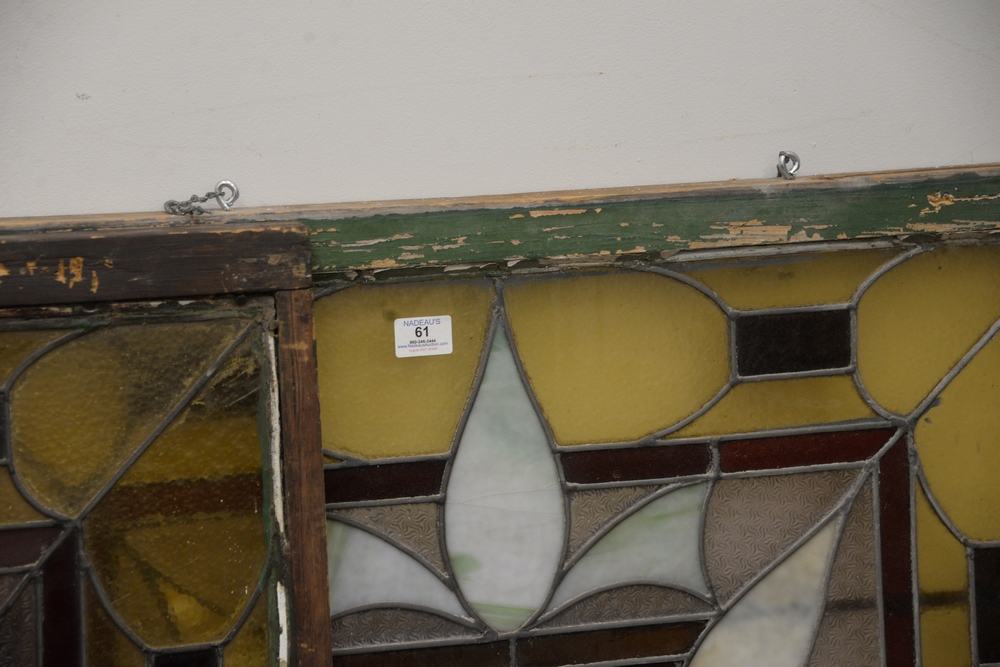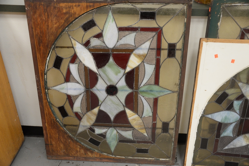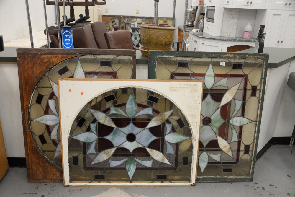 Lot 60: Set of Three Stained Glass Windows to include, a pair along with an arch shaped window, 37″ x 43 1/2″ and 35″ x 43″.
