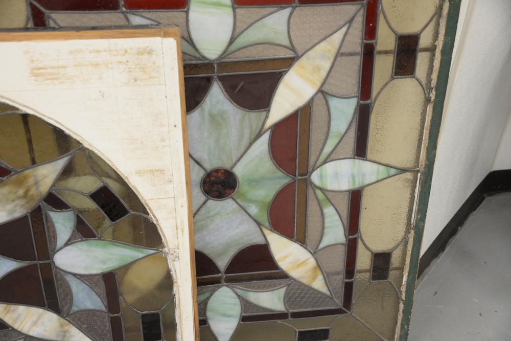 Set of Three Stained Glass Windows to include, a pair along with an arch shaped window, 37″ x 43 1/2″ and 35″ x 43″.