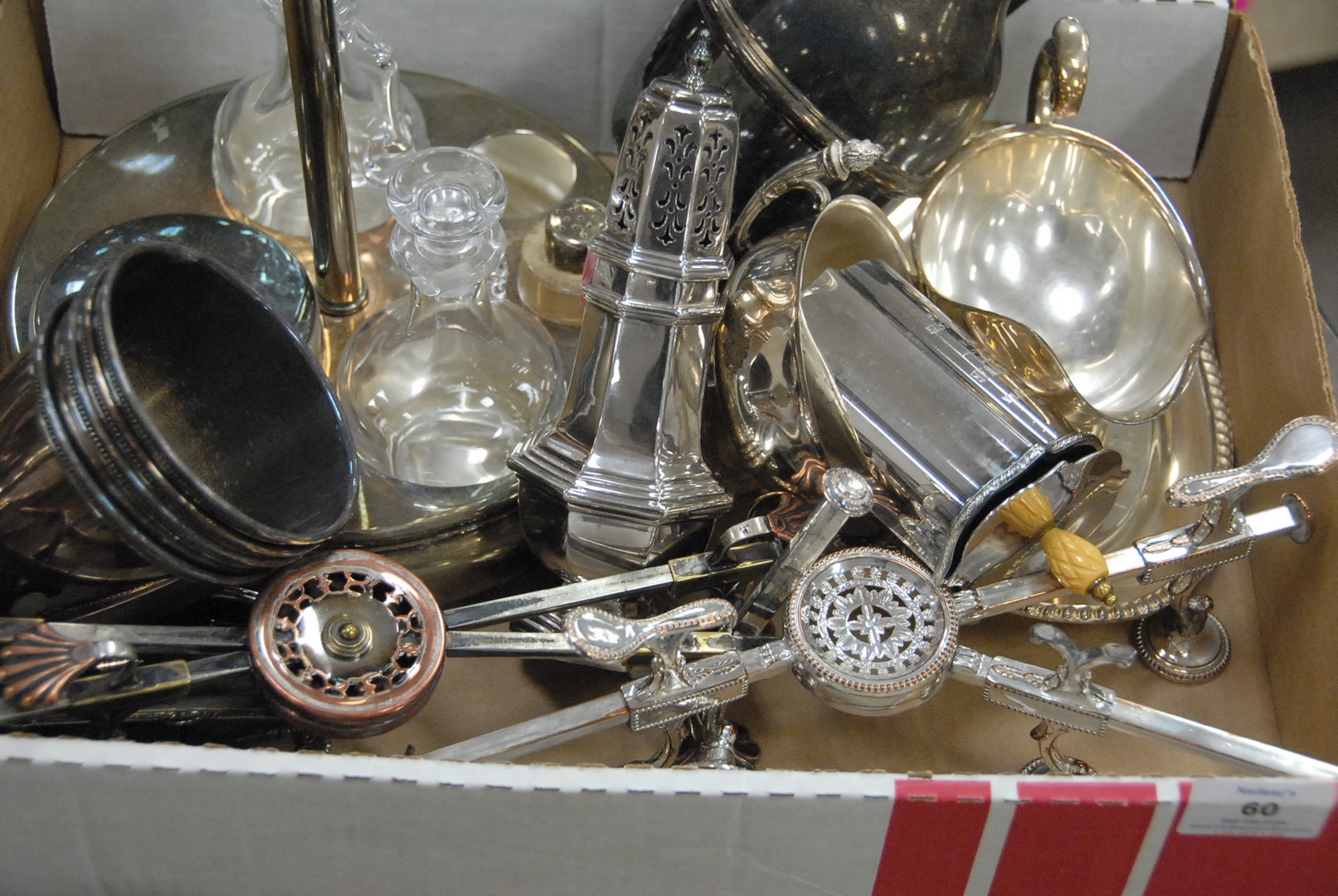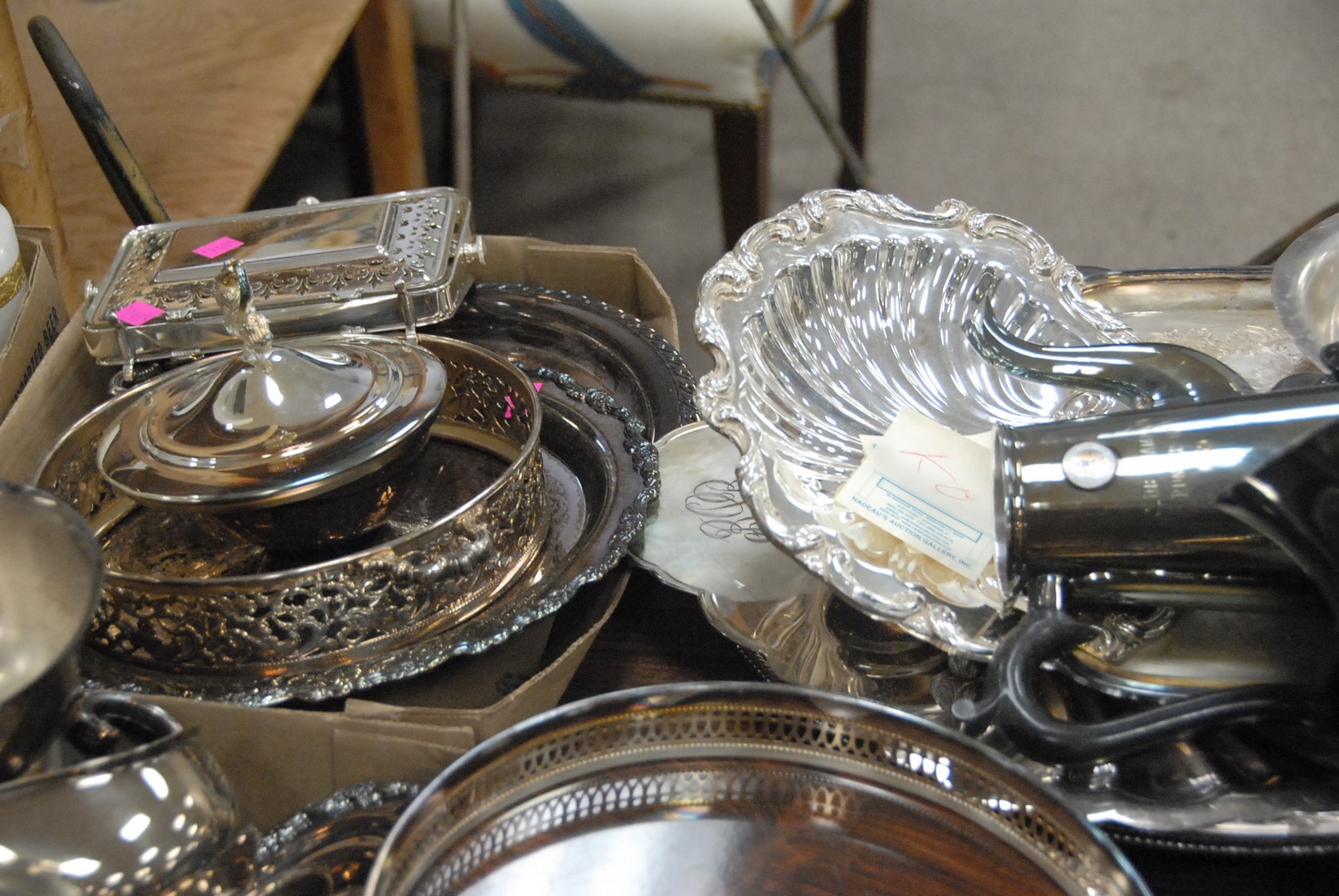 Lot 60: Three box lots including silverplate trays, vases, and serving pieces.