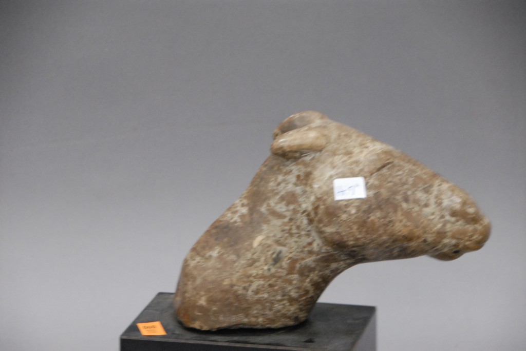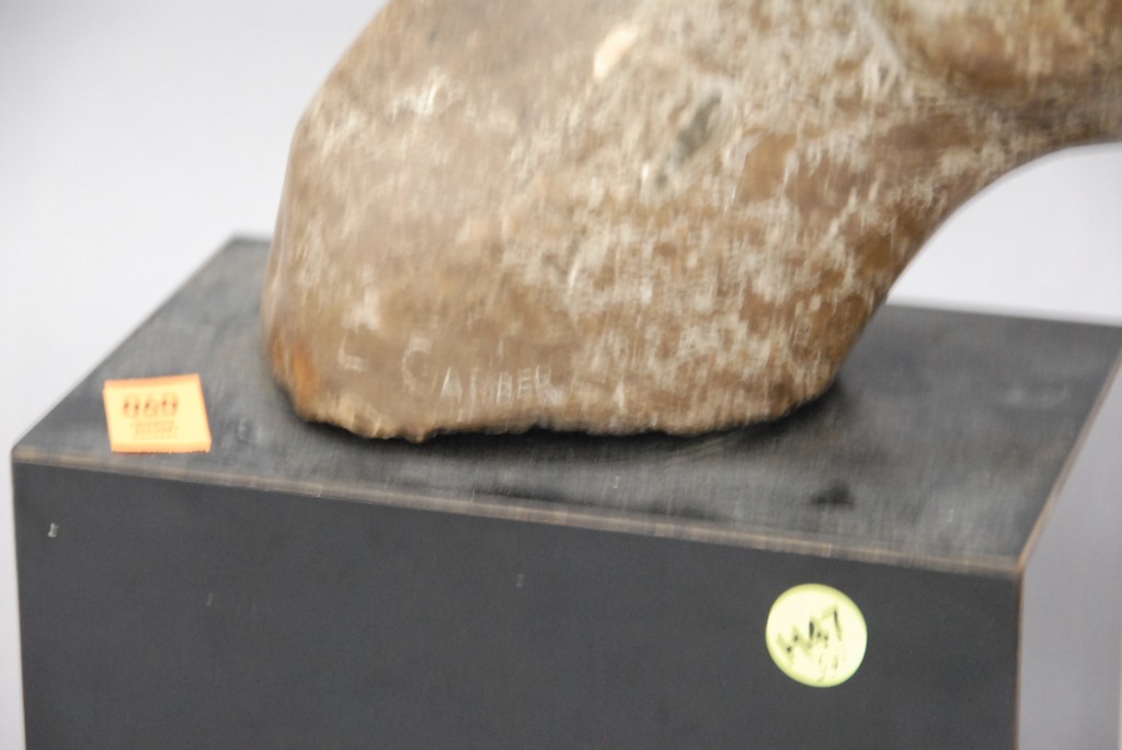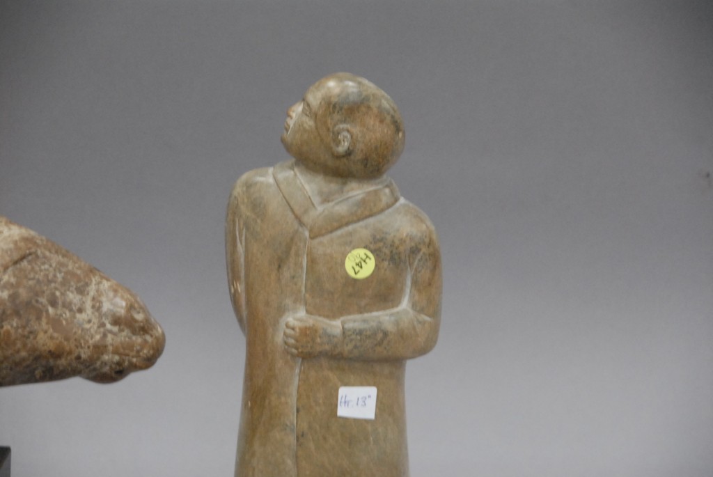 Two carved stone figures figure of a man in long coat signed Gerber and horse head.