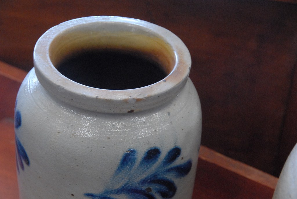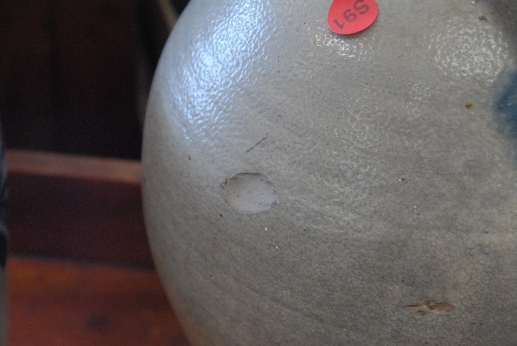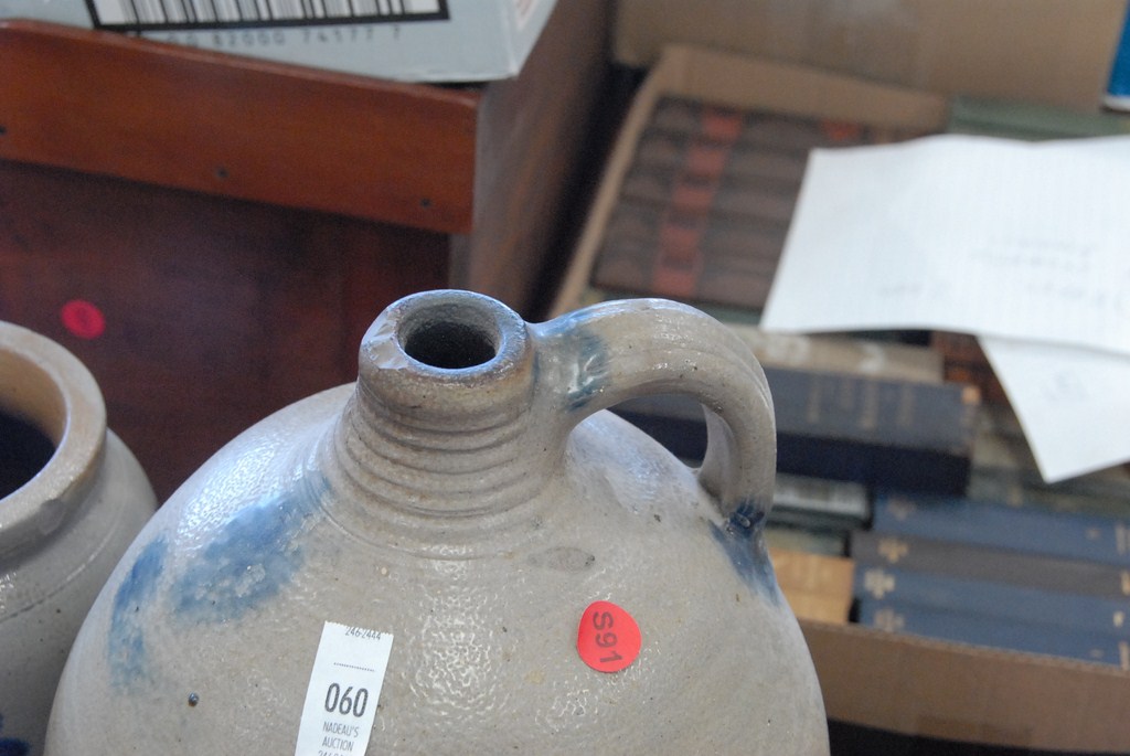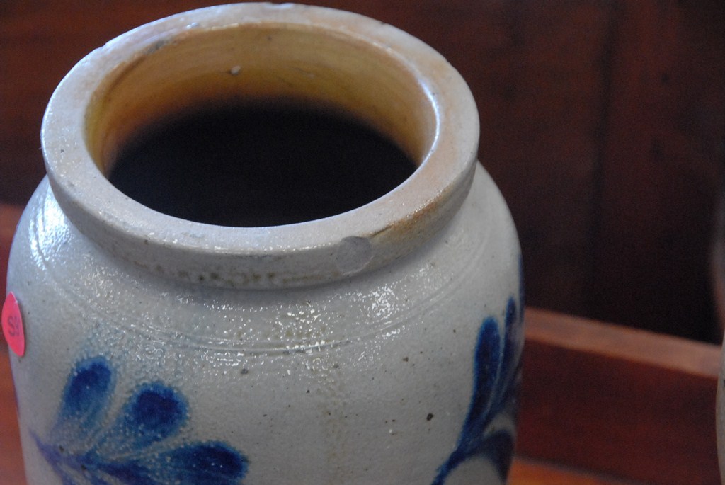 Two stoneware pieces jug and small crock with blue decoration.