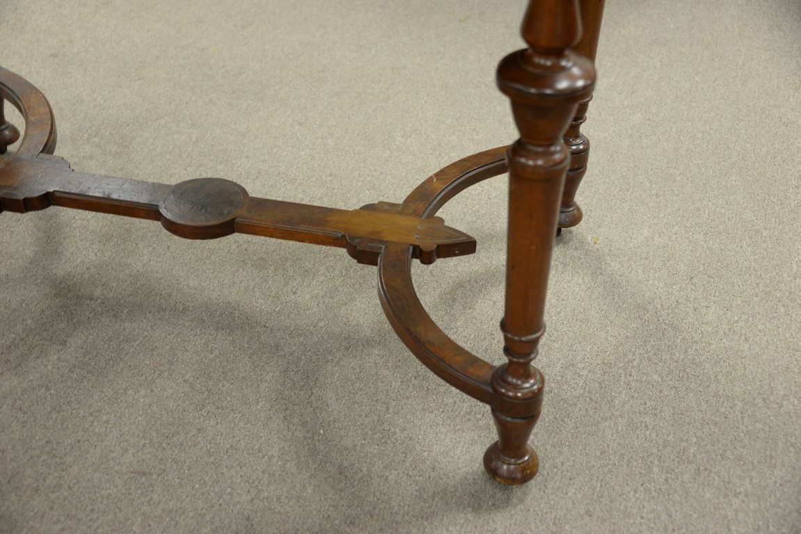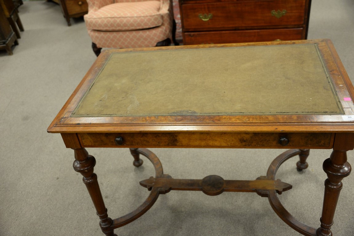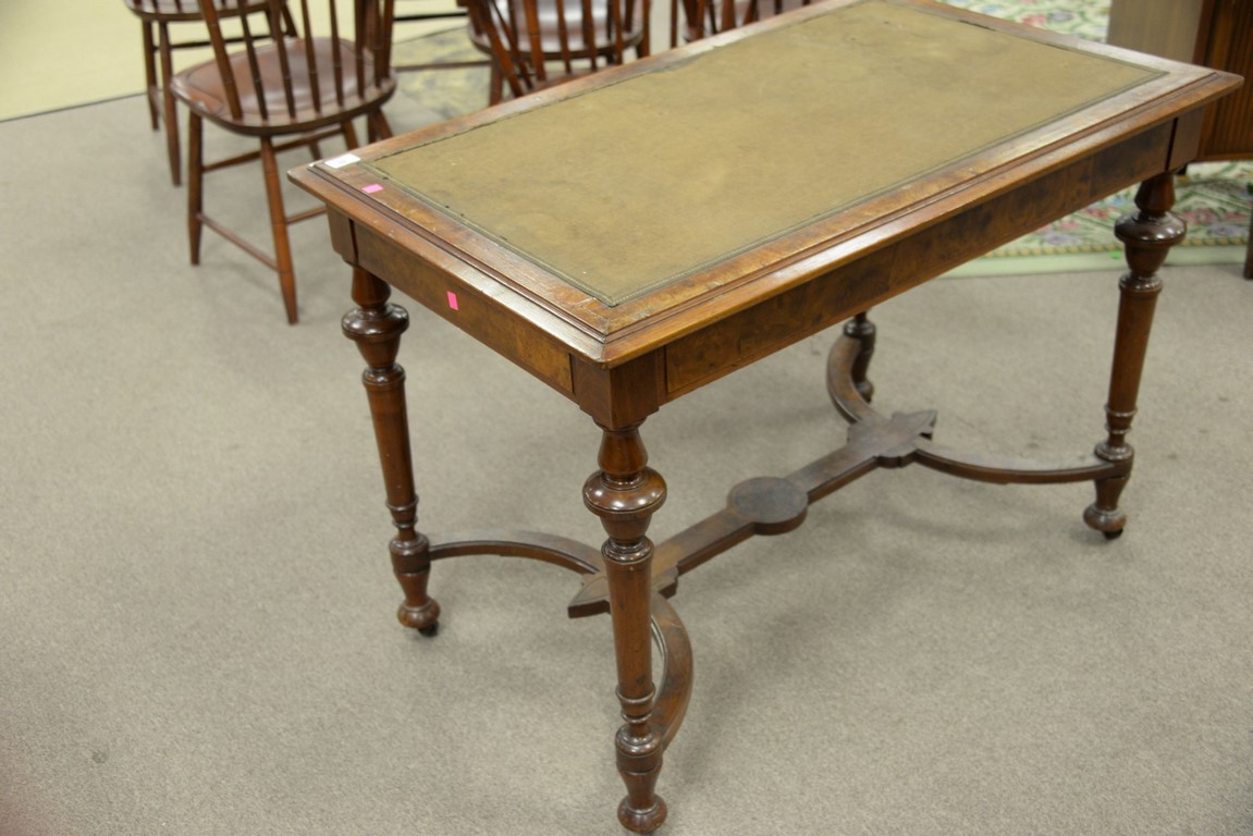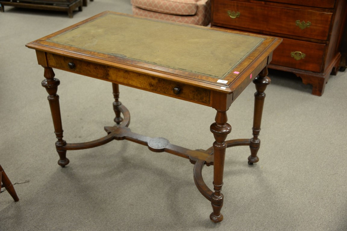 Victorian walnut and burl walnut writing table with felt top. ht. 30 in. wd. 42 in.