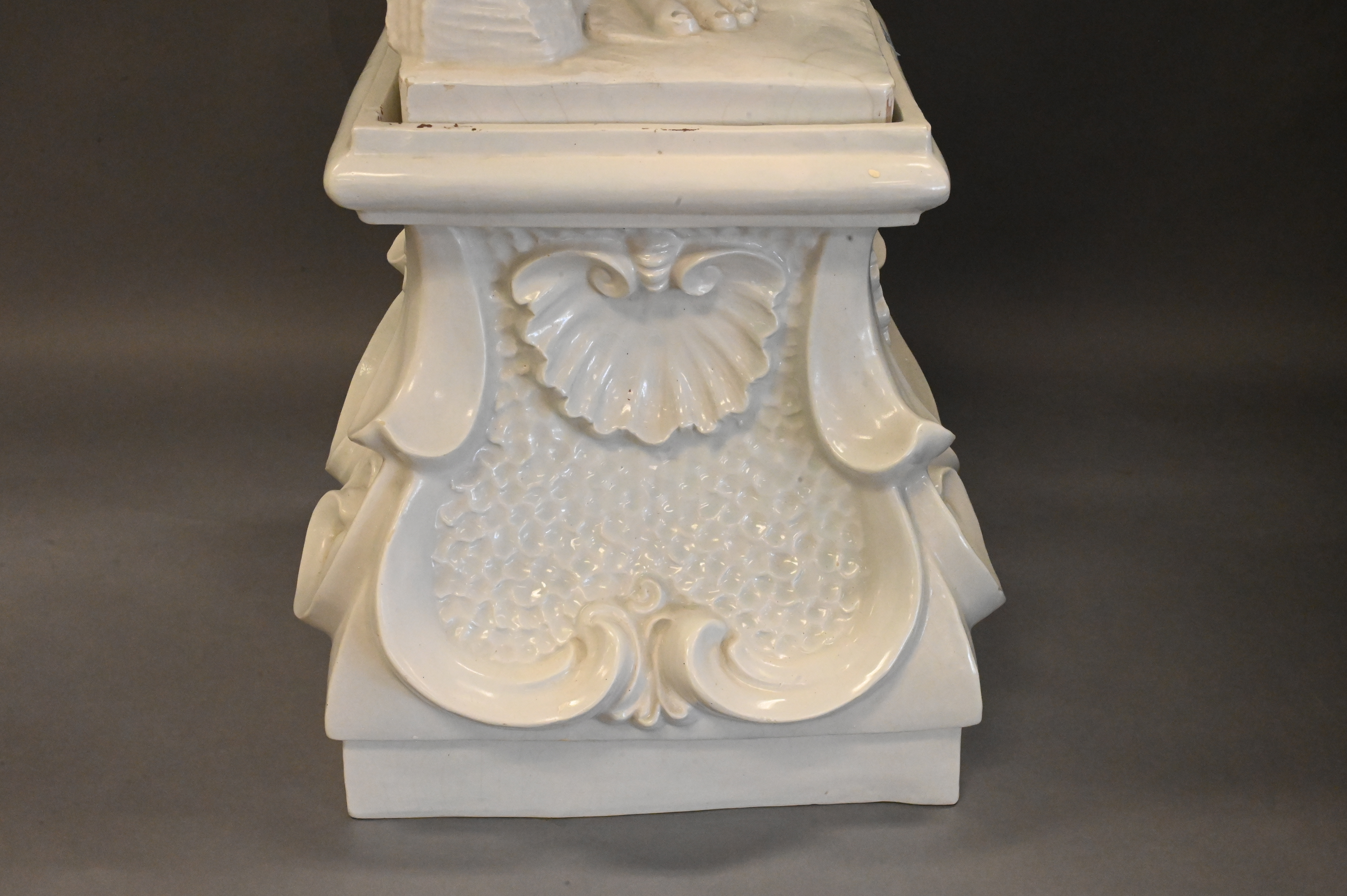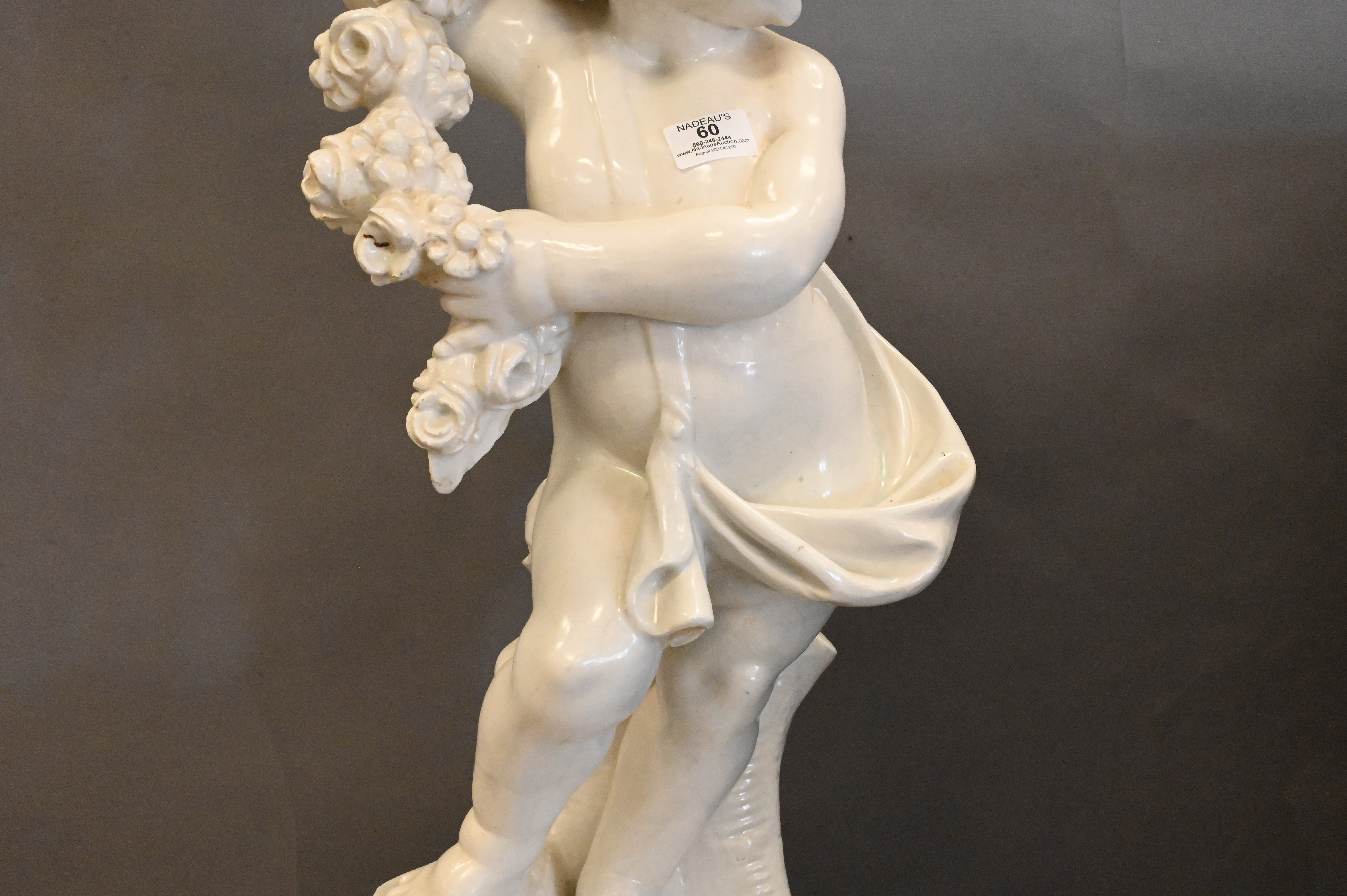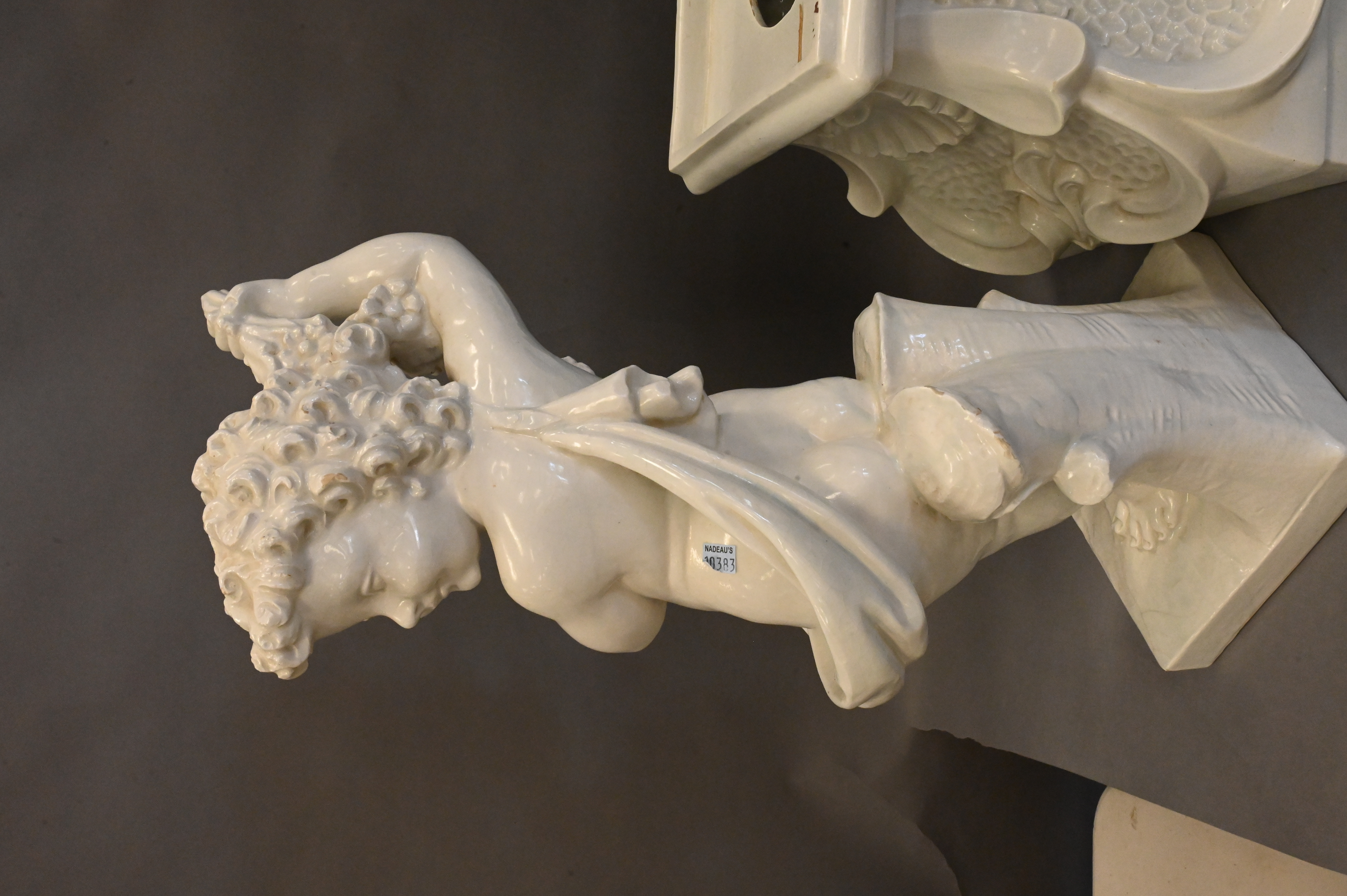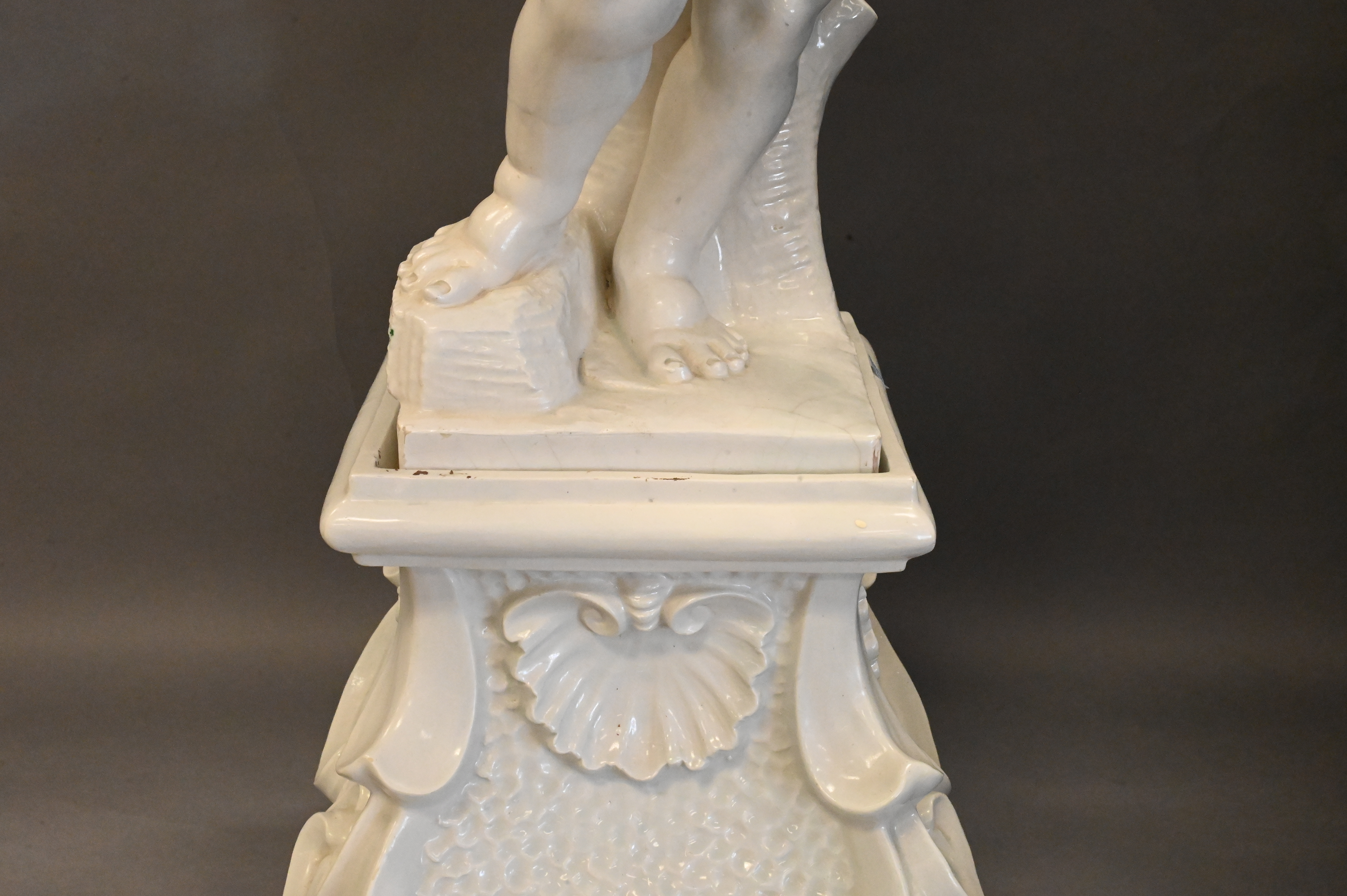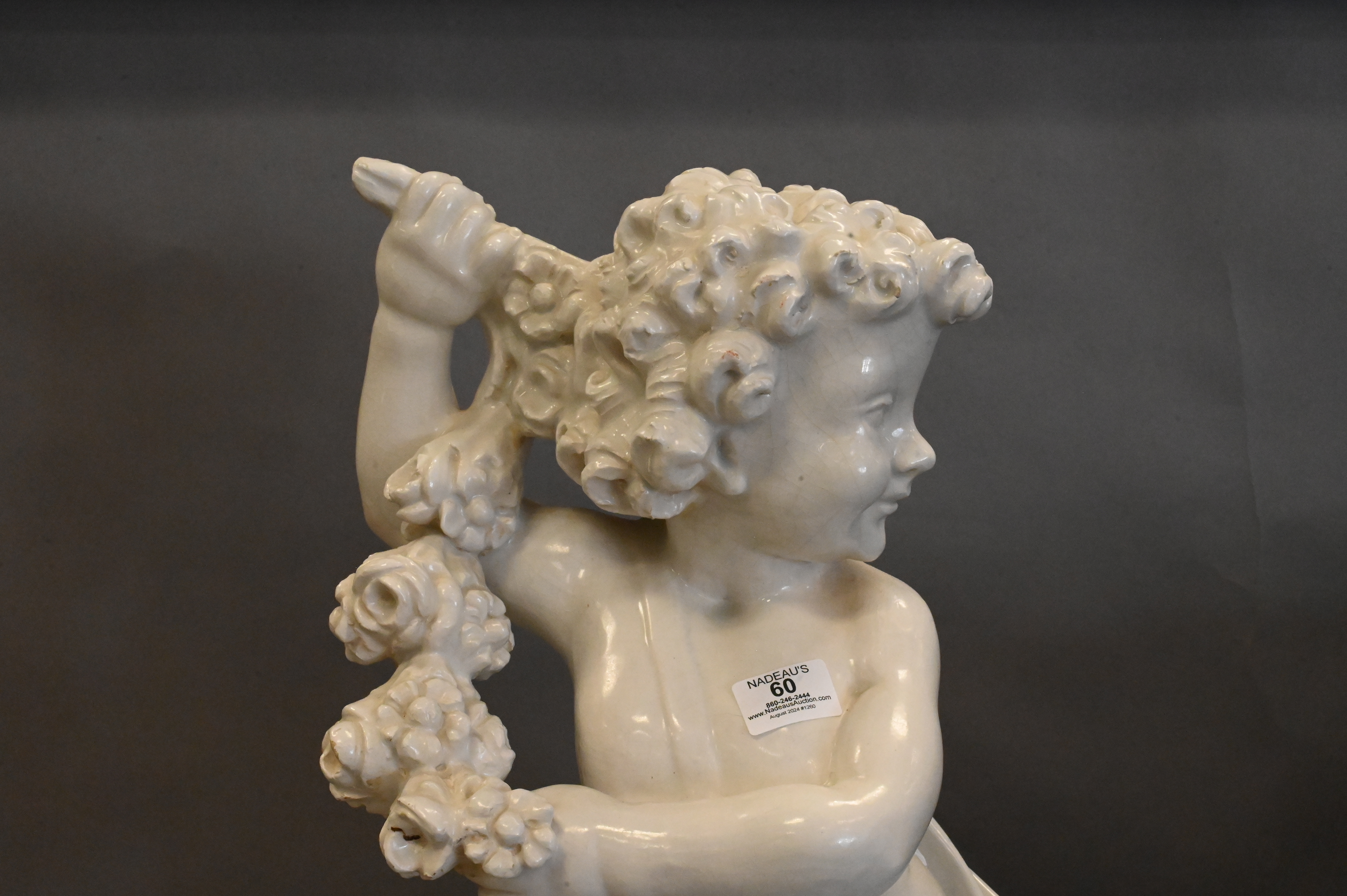 in two parts, featuring a cherub holding a garland of flowers, set on shell motif pedestal base
