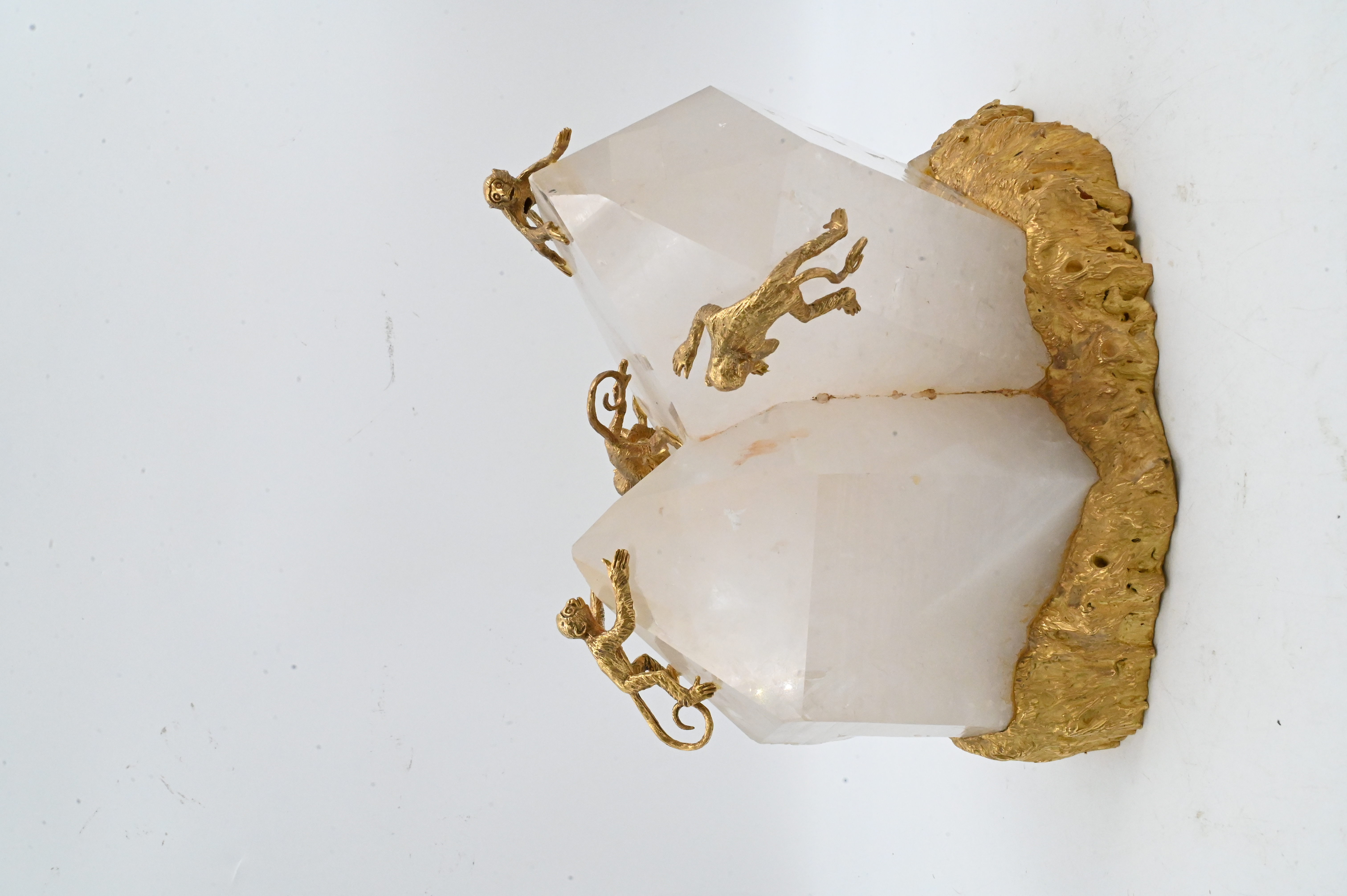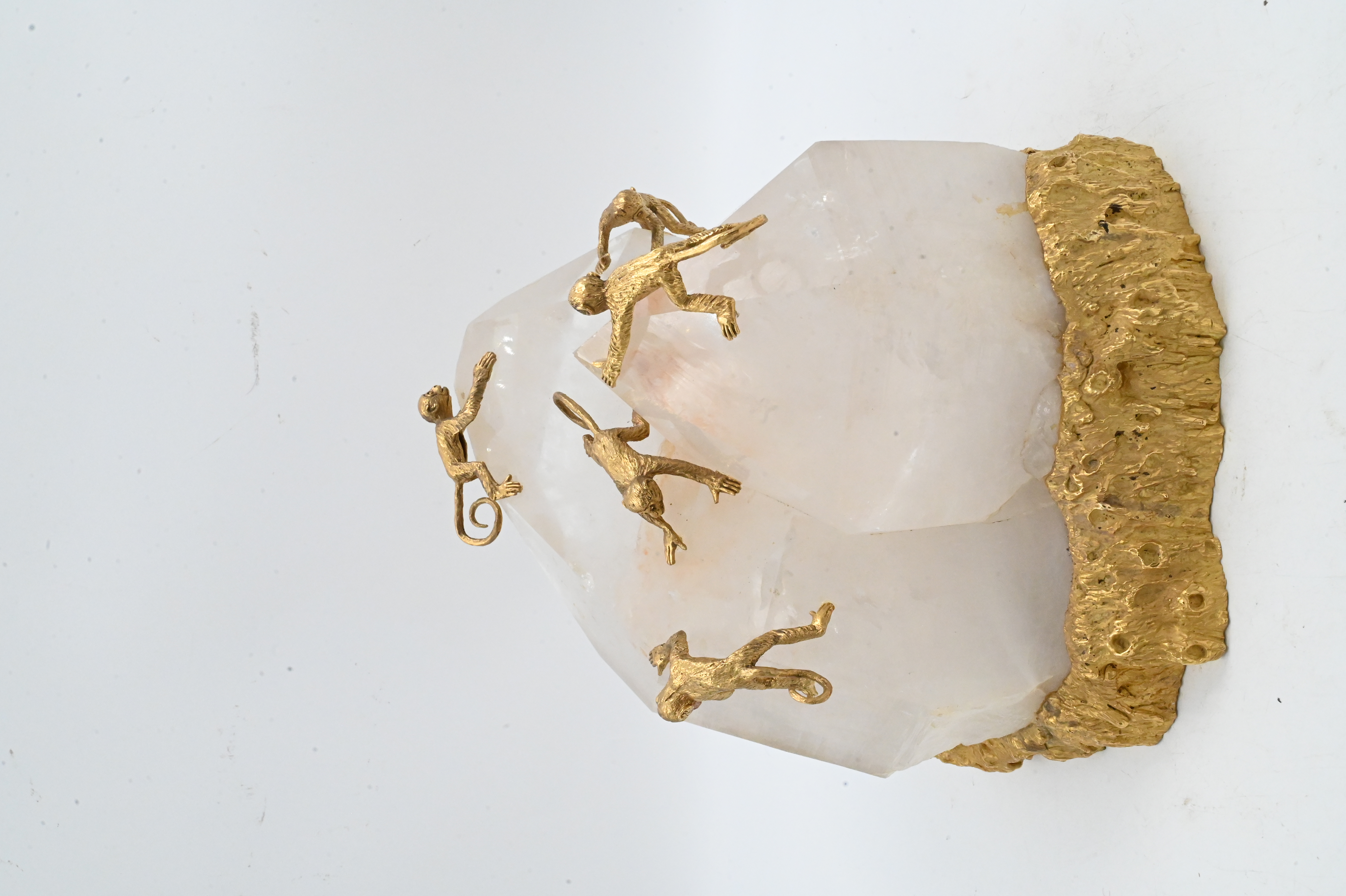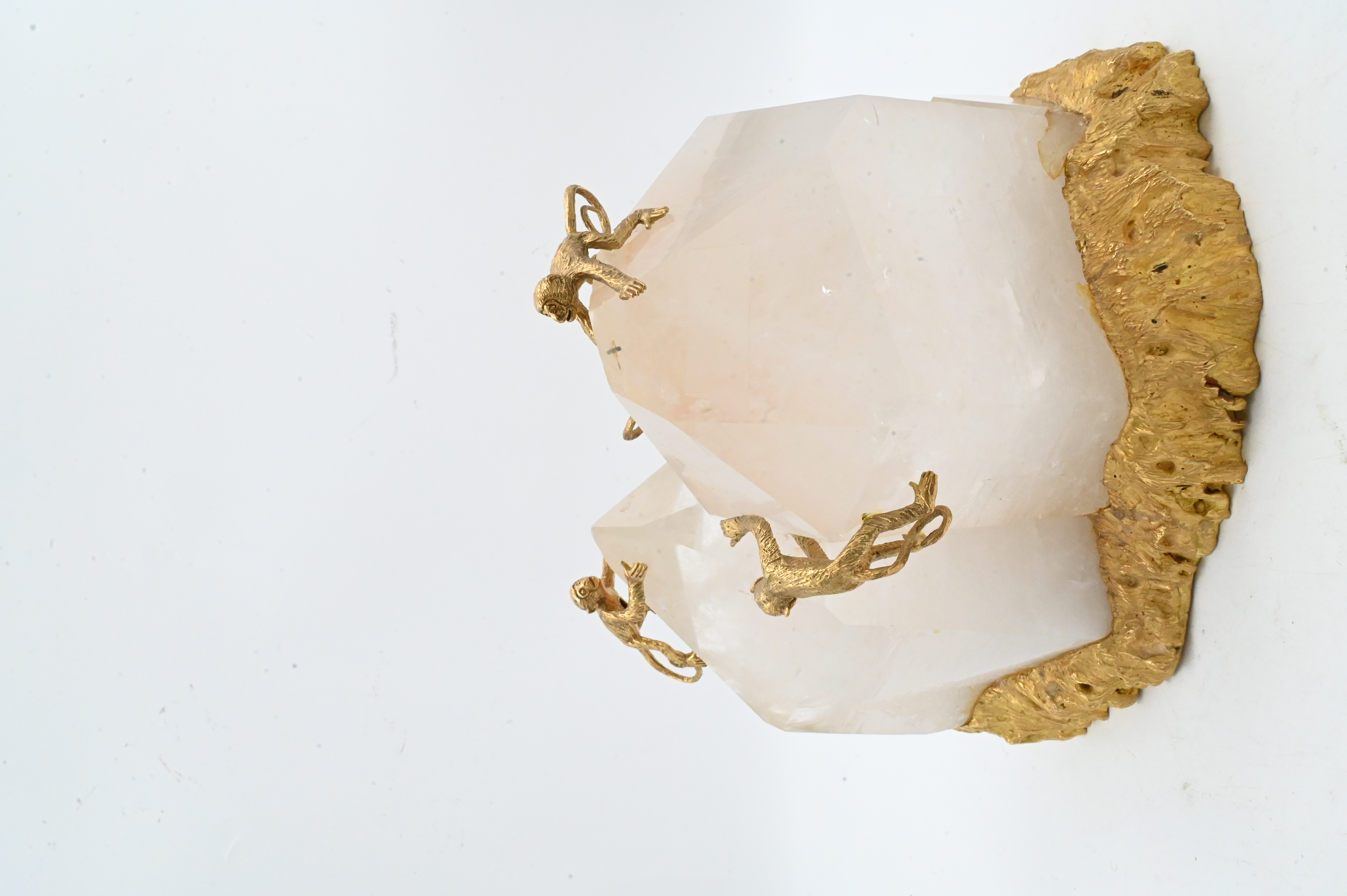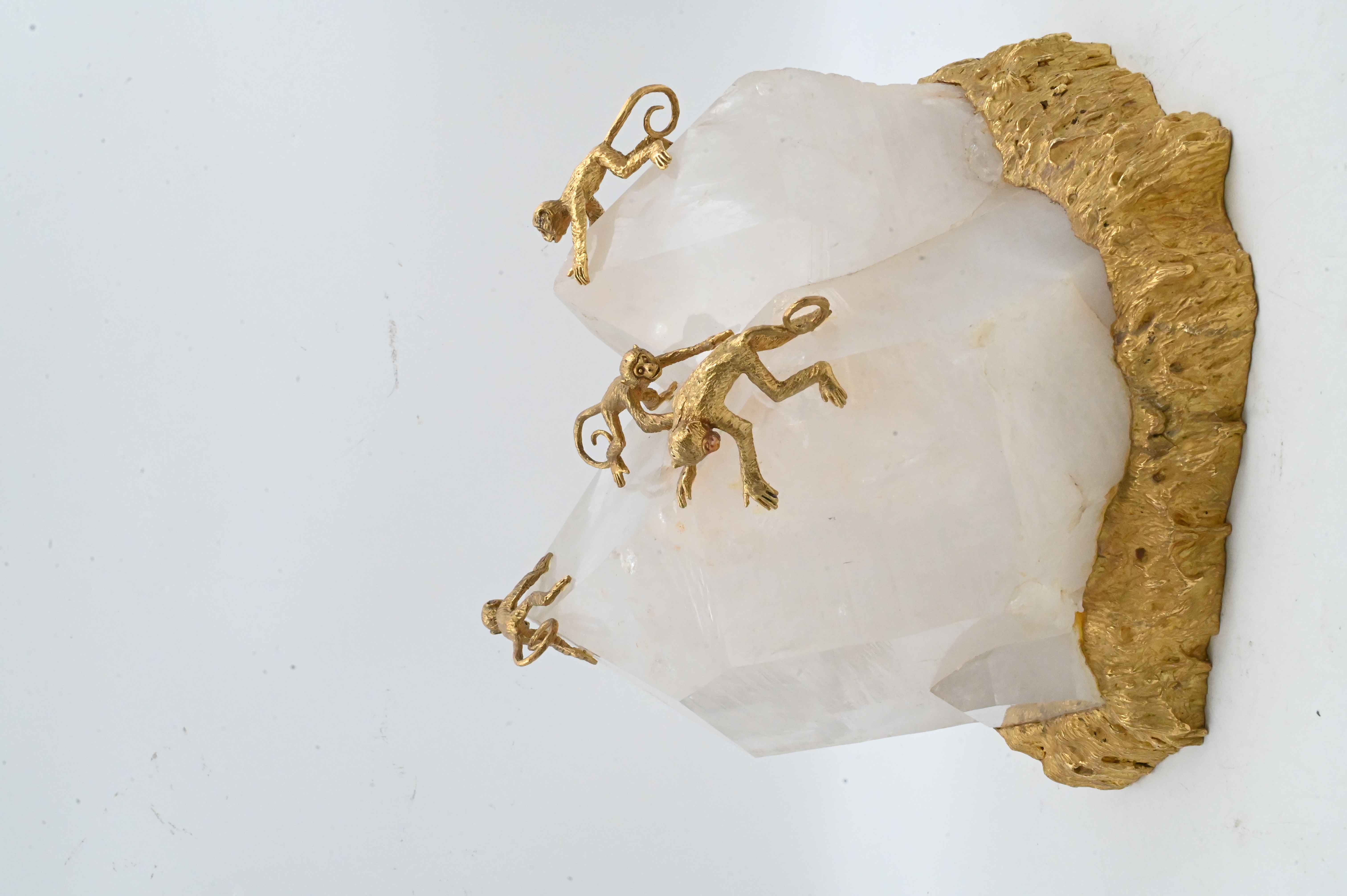 sculptural objet d’art by David Webb, featuring a large natural rock crystal cluster body mounted with five finely modeled 18K yellow gold monkeys, in playful climbing and reaching poses, raised on a textured 18K yellow gold base, signed David Webb
