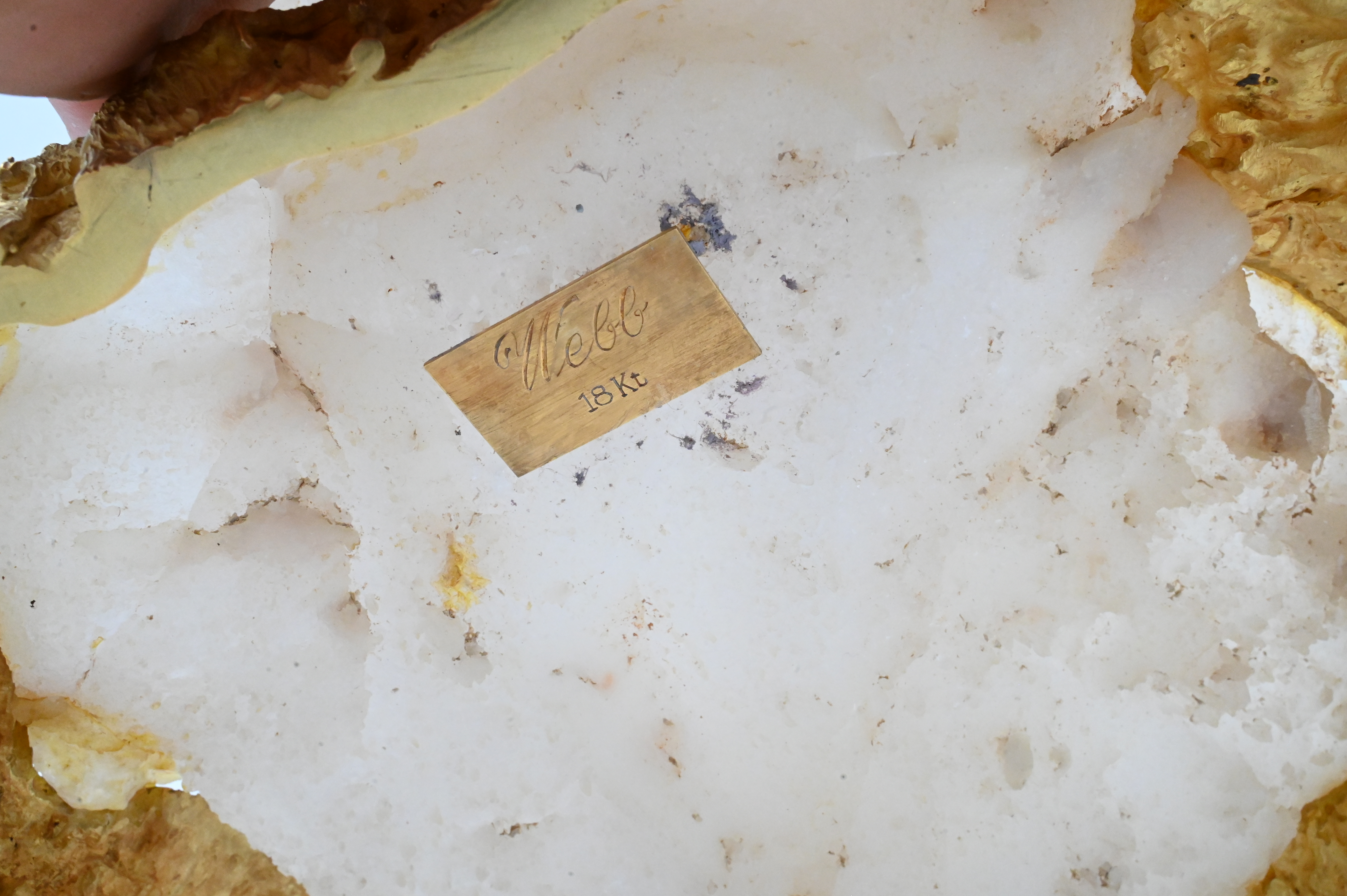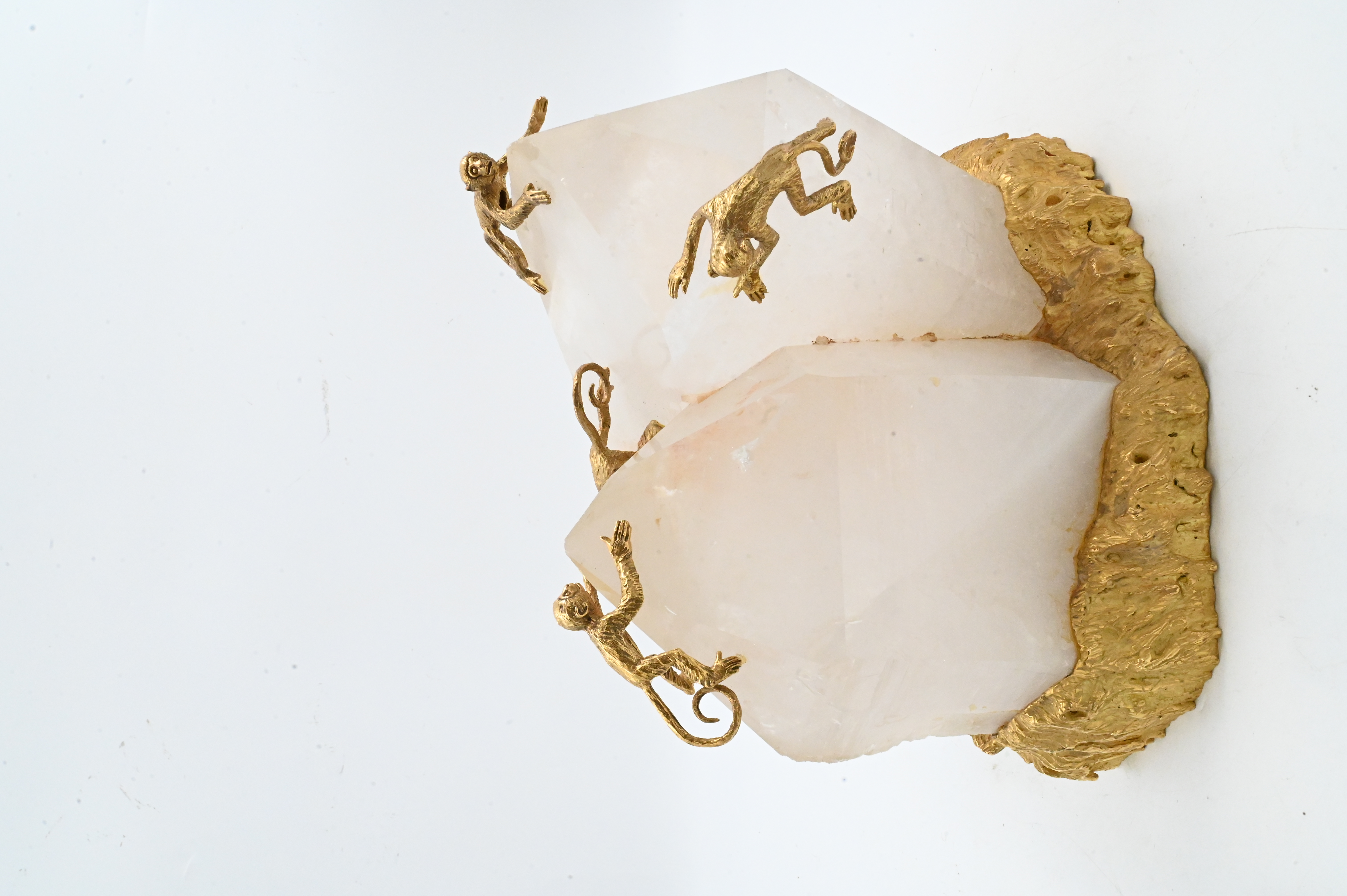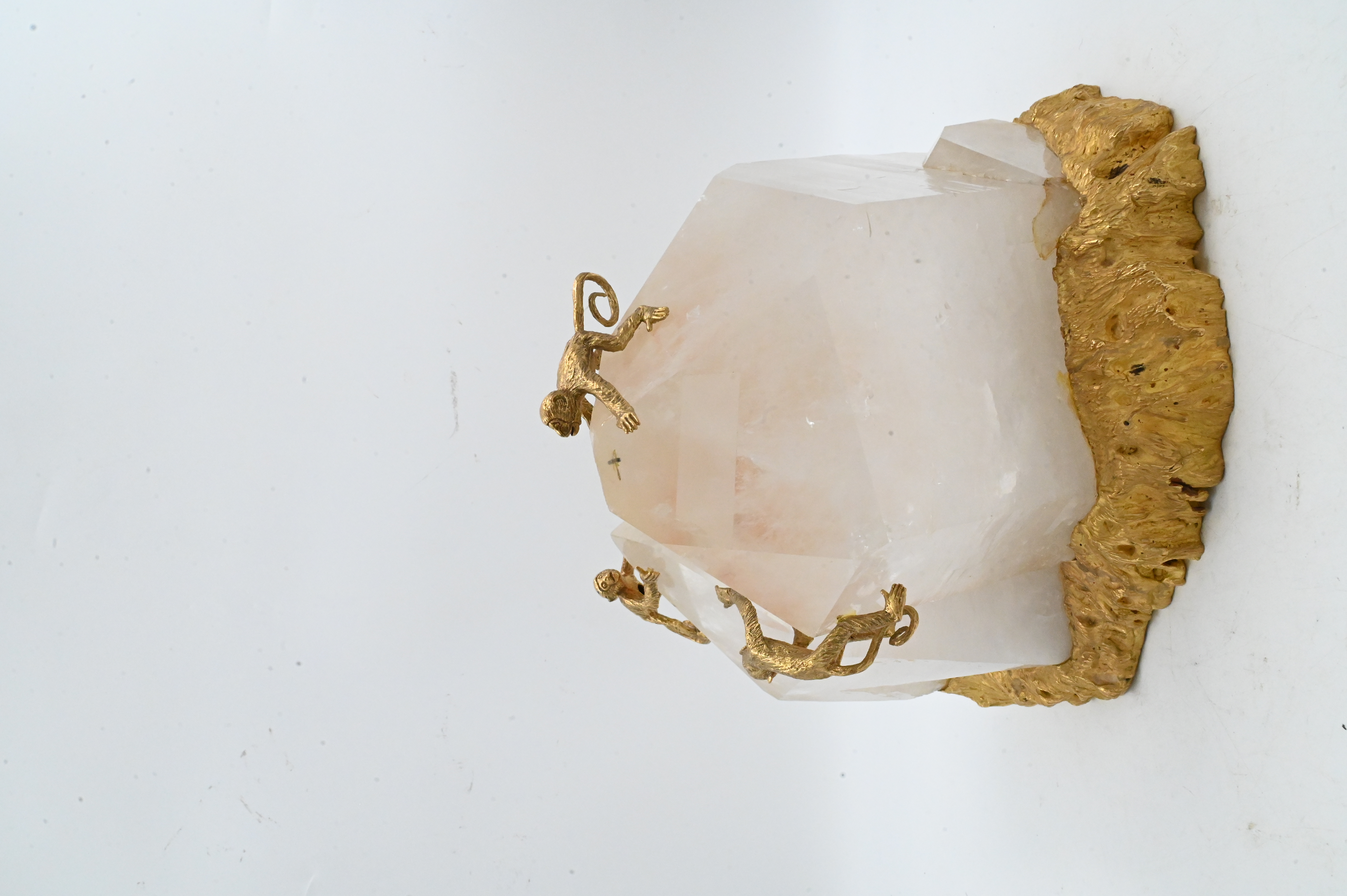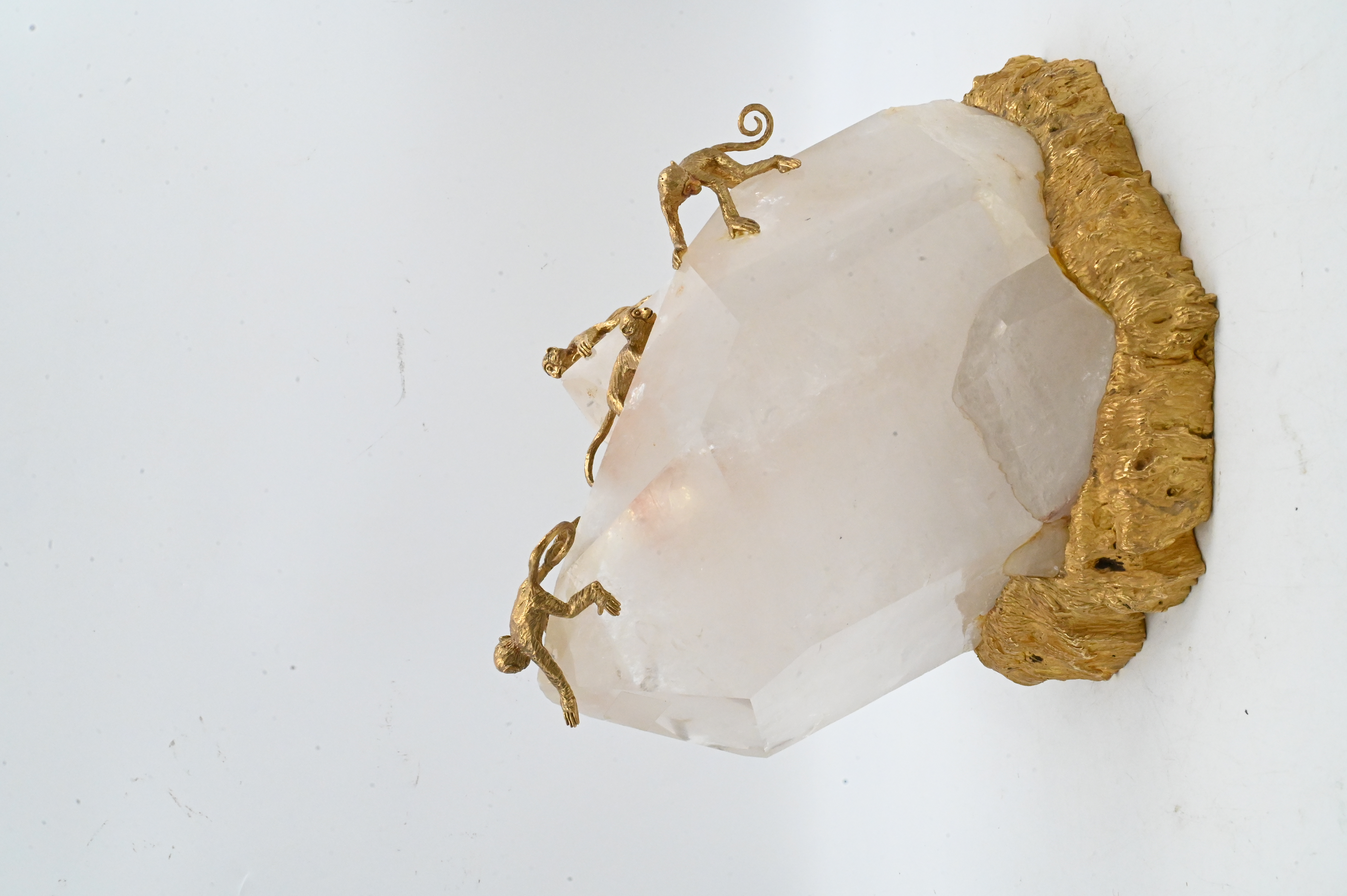 sculptural objet d’art by David Webb, featuring a large natural rock crystal cluster body mounted with five finely modeled 18K yellow gold monkeys, in playful climbing and reaching poses, raised on a textured 18K yellow gold base, signed David Webb