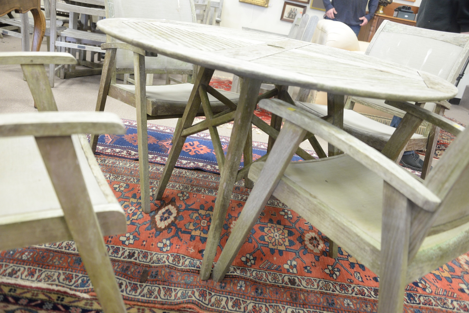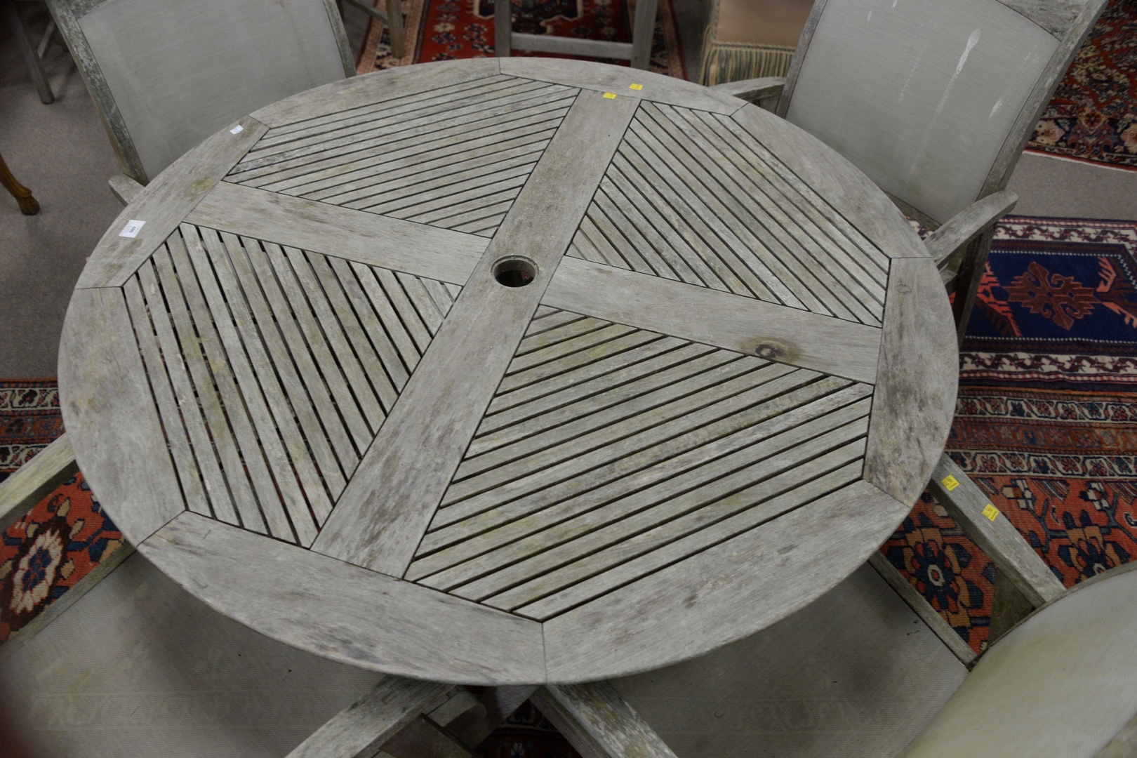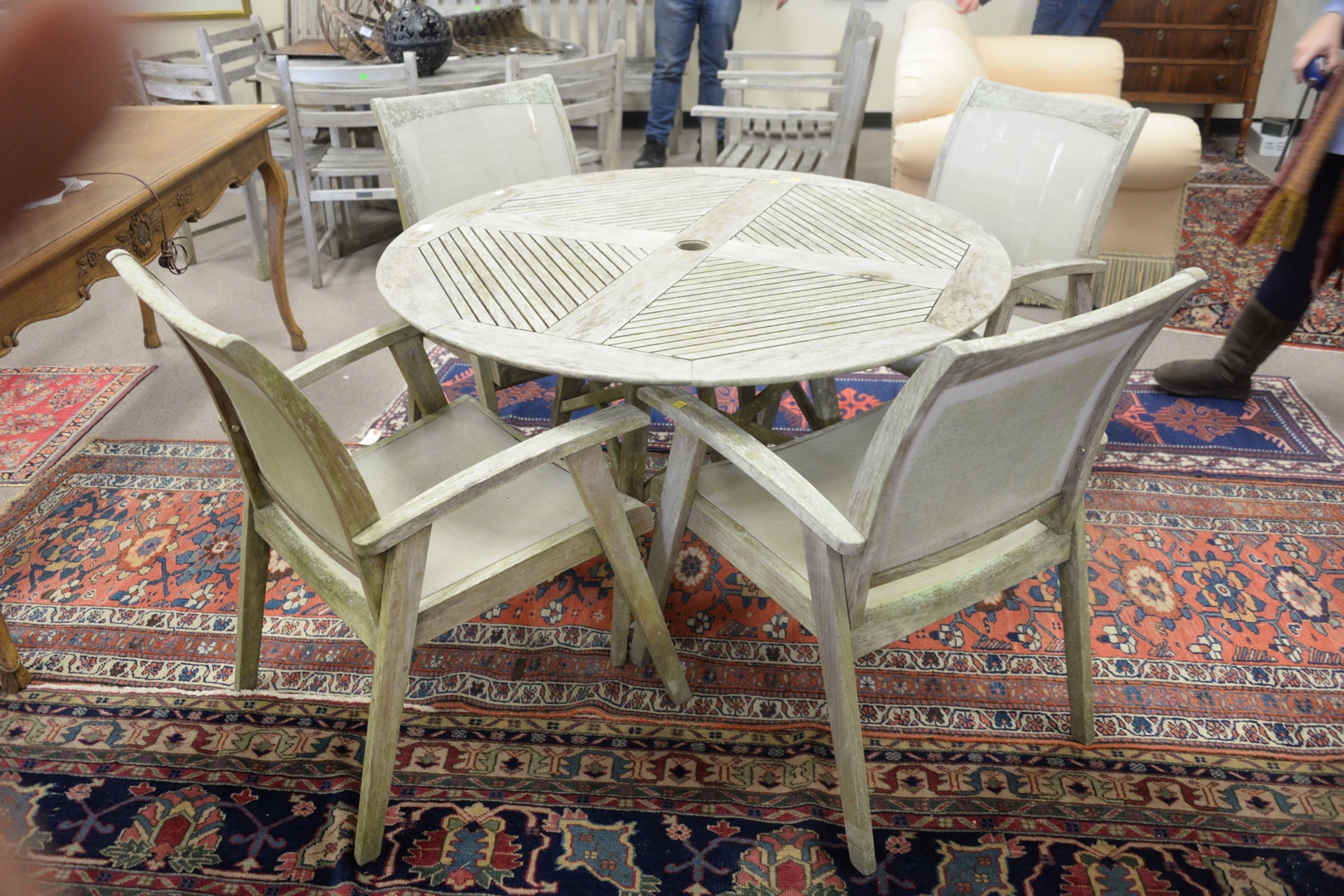 Lot 600: Five Piece Teak Outdoor Set round table along with four arm chairs with mesh back and seat height 29 inches, diameter 47 1/2 inches …