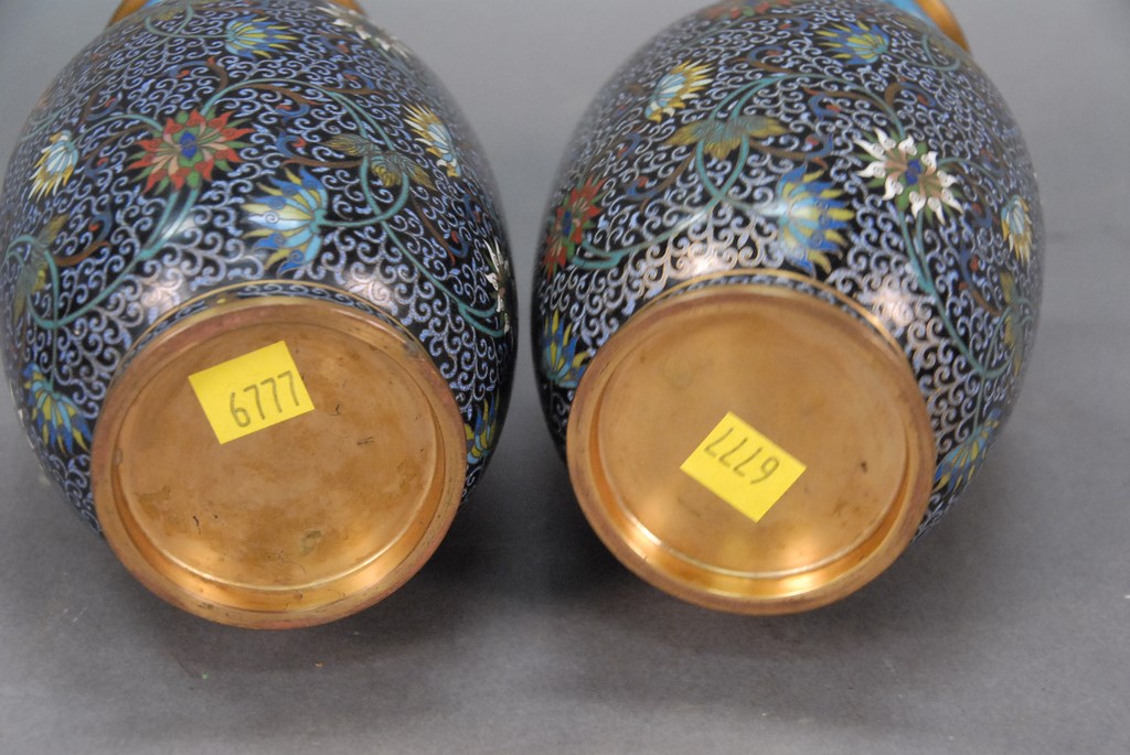Pair of cloisonn vases, cobalt blue background with various color flowers. ht. 8 1/2in.