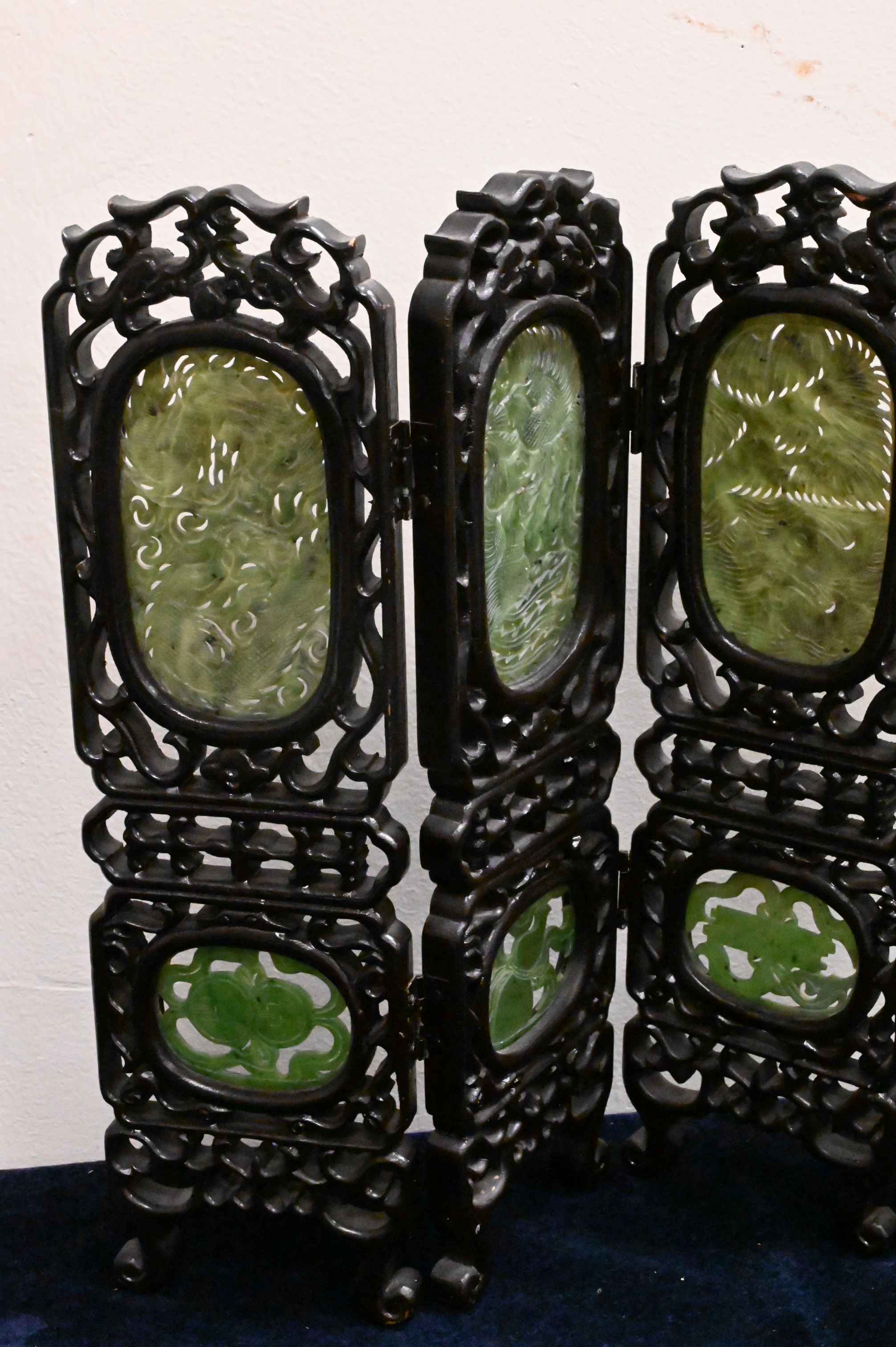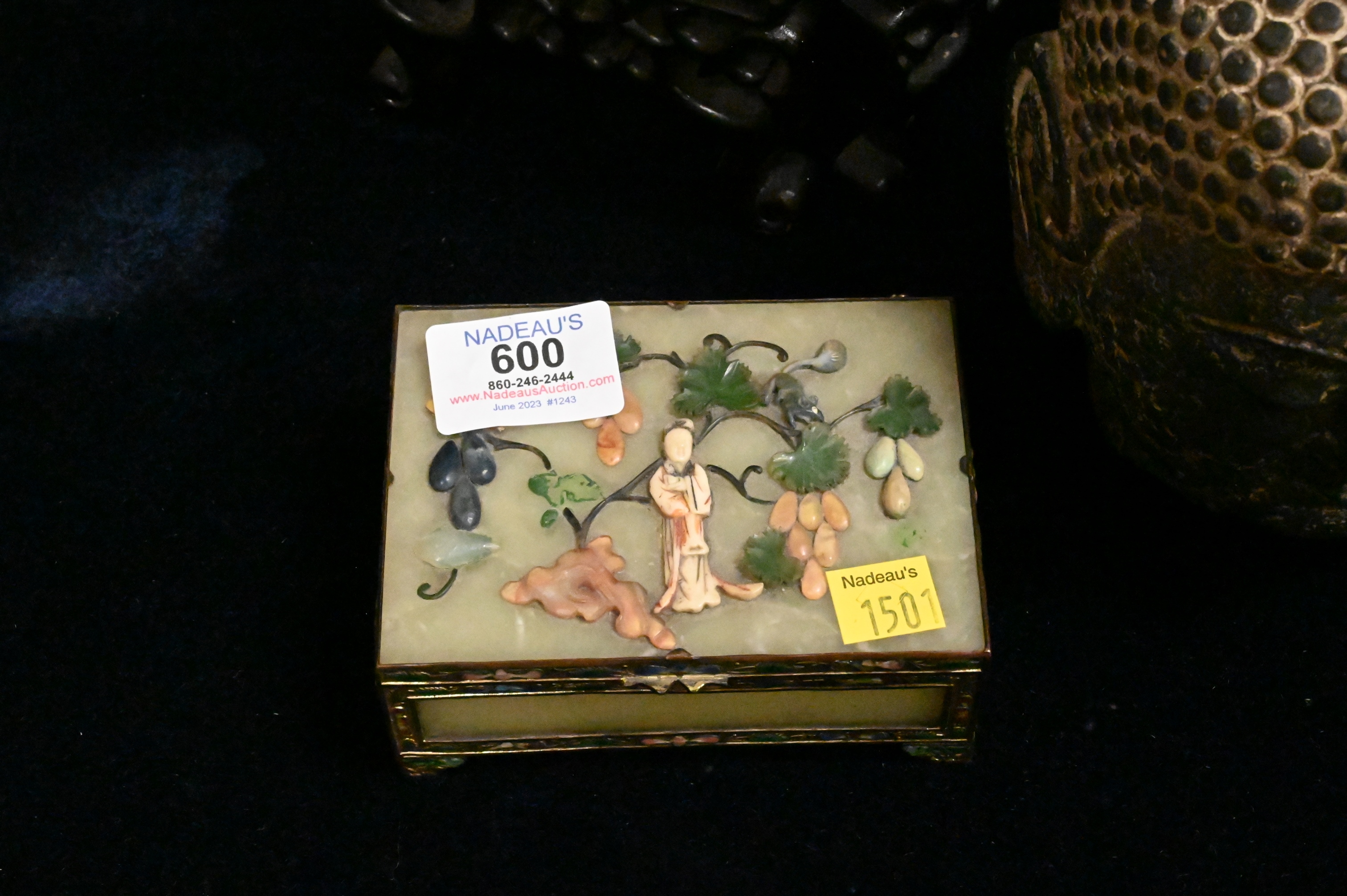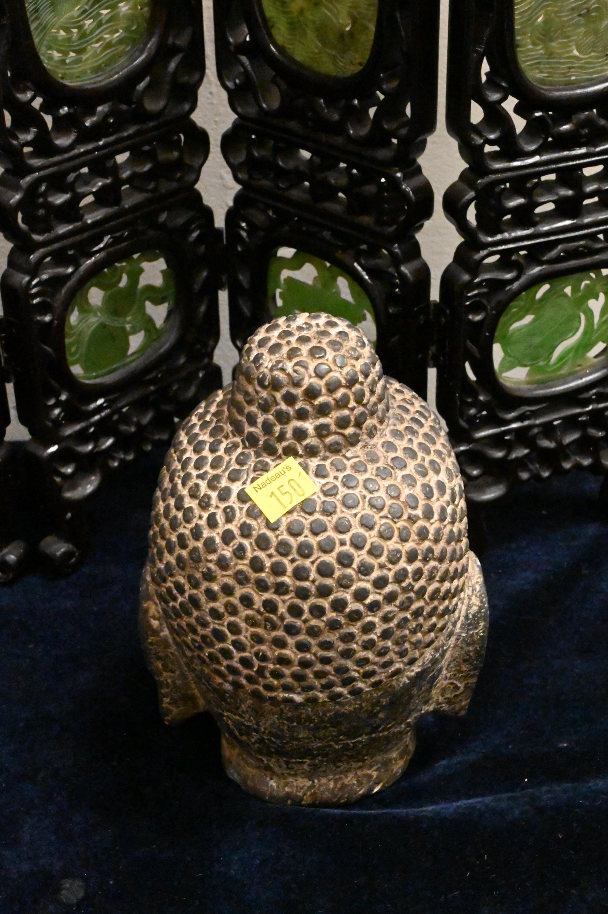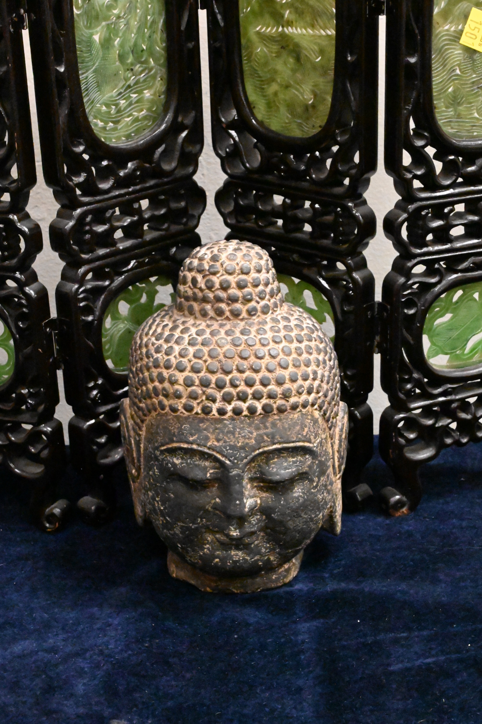 Three Piece Chinese Grouping, to include carved stone budha head (height 6 3/4 inches, green stone screen( height 16 inches), and a jade box