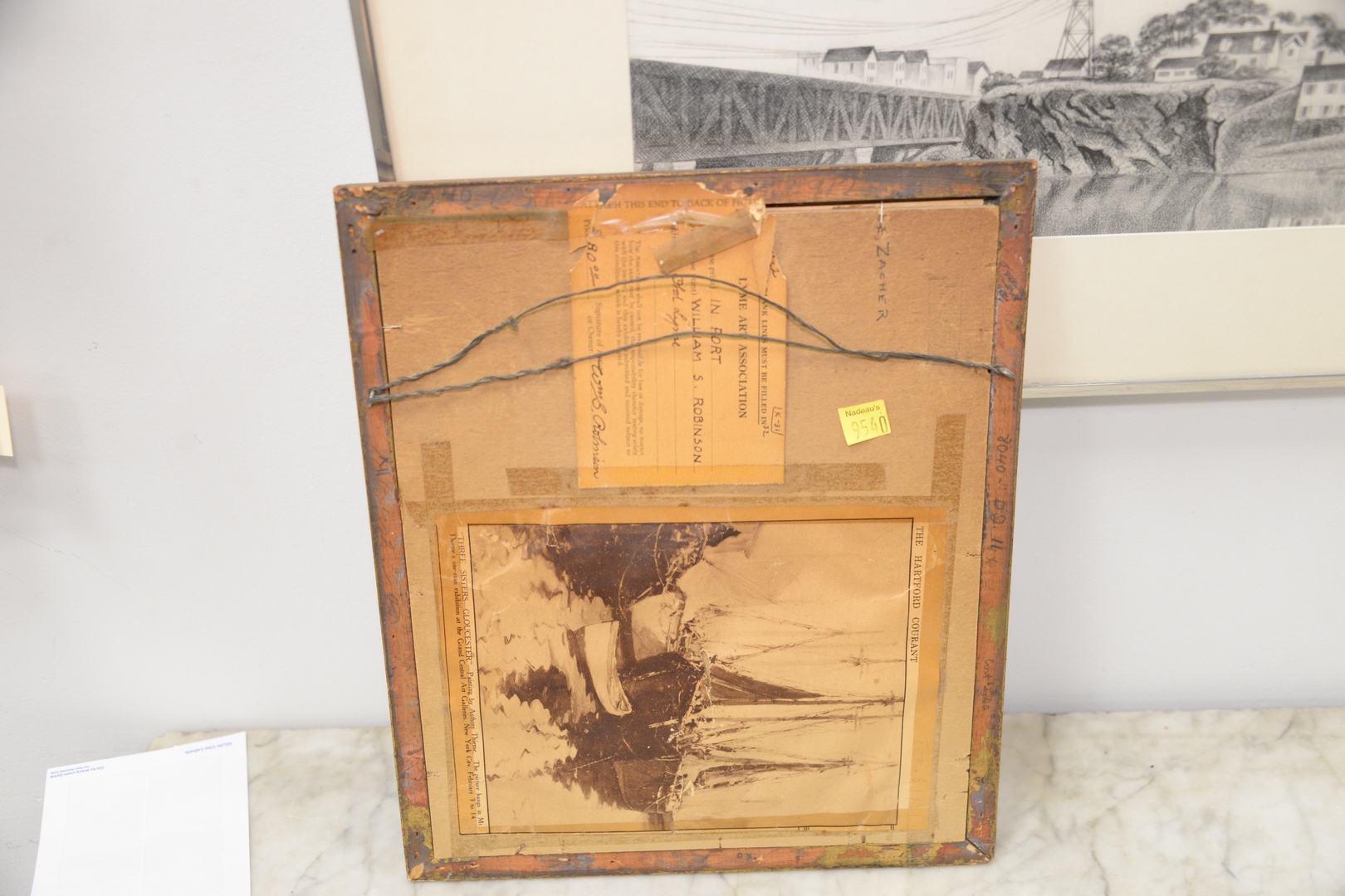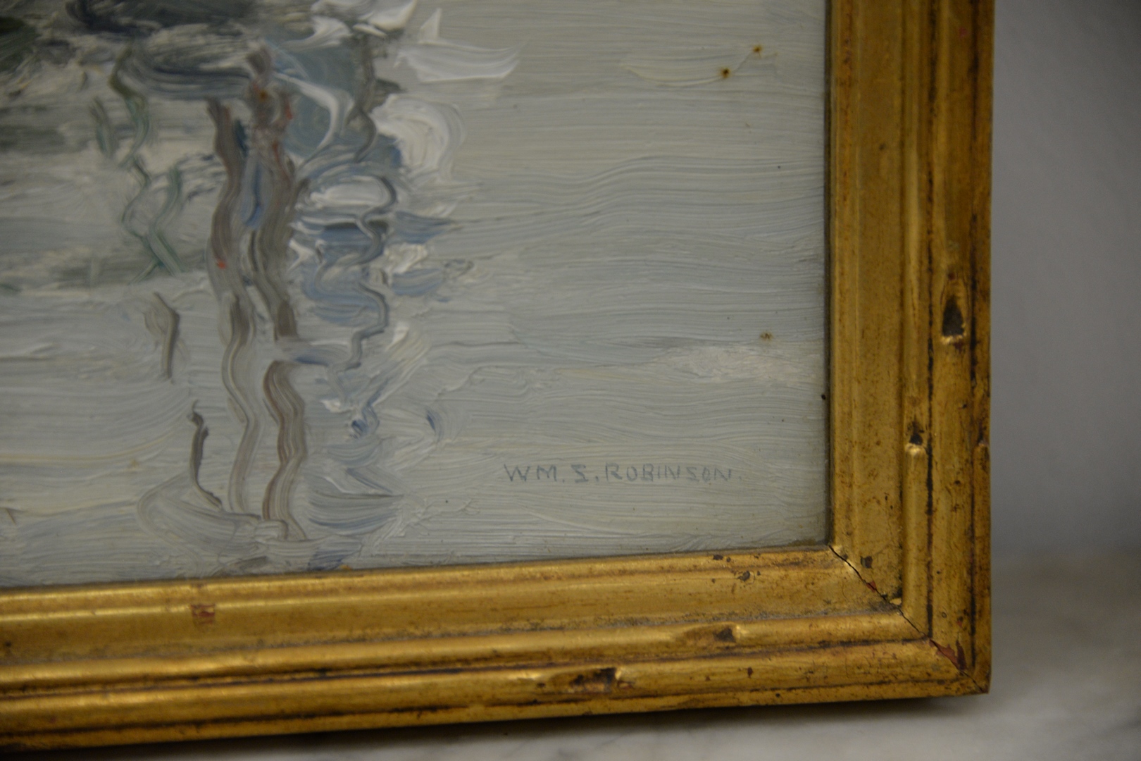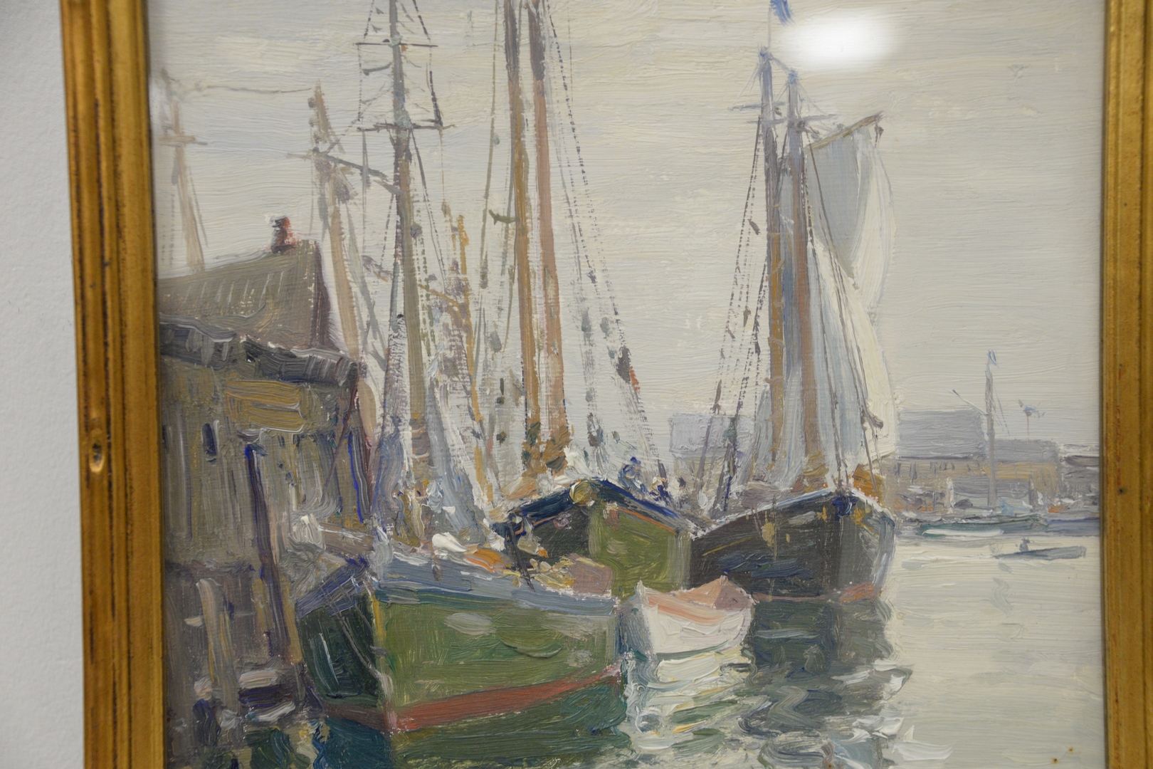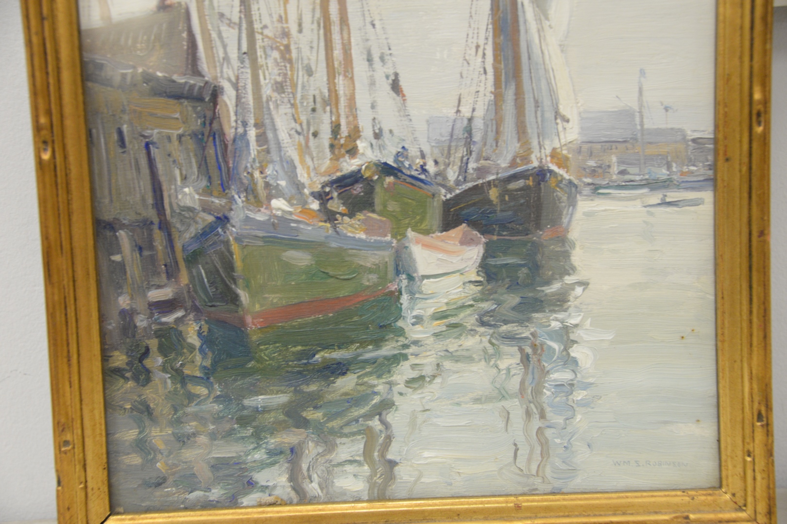 Lot 600: William Smith Robinson 1861 – 1945 In Port Gloucester Harbor Three Sisters oil on board signed Wm. S. Robinson lower right Lyme…