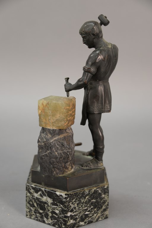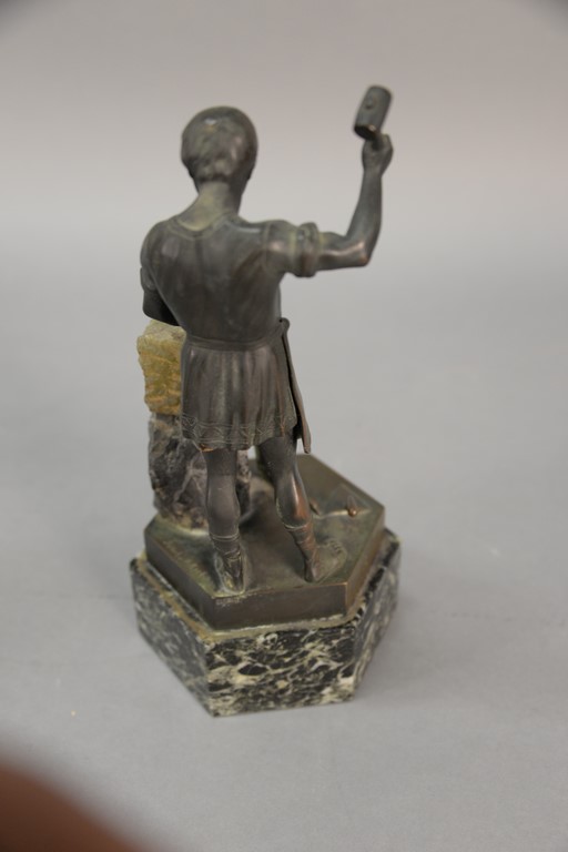 Hans Keck act 1900-1922 patinated bronze Sculptor figure of a classical sculptor on octagonal marble base signed at base: Putschu H. Heck German ht. 11 1/2in., wd. 5in.