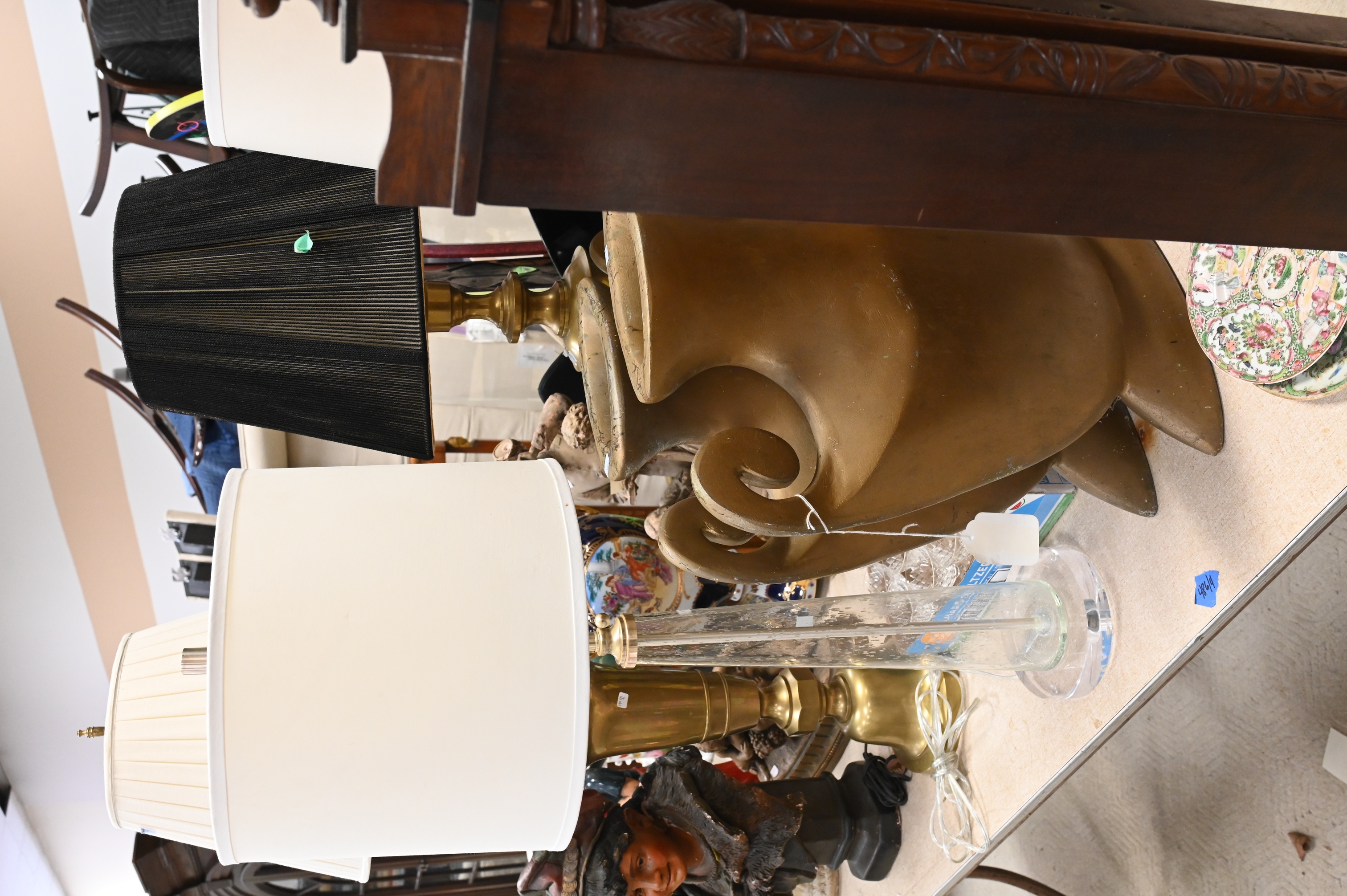 set of 12 cut glass stem wine glasses clear with diamond cut patterns, glass height 4 inches, group of six ornate vases to include large royal blue and gilt handled vase, two floral vases, one eastern mache, one glass oriental , one pedestal vase, tallest vase 25 inches, eight piece group of plaster figures to Include, John Rogers “Taking the Oath and Drawing Rations”, hidden vase, calendi Bacchic Putti Group, Austin Production “Sultry Awakening”, tallest figure 23 inches, as well as a group of five lamps to include pair of brass urn form lamps, pair of glass on lucite base lamps, along with brass lamp having four candelabra arms, tallest lamp 42 inches