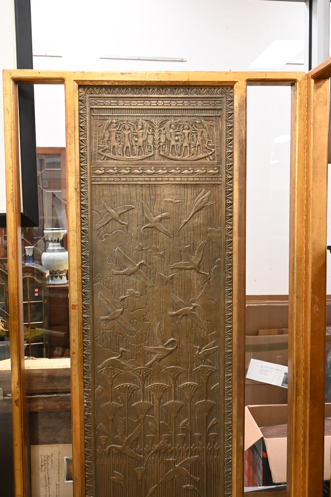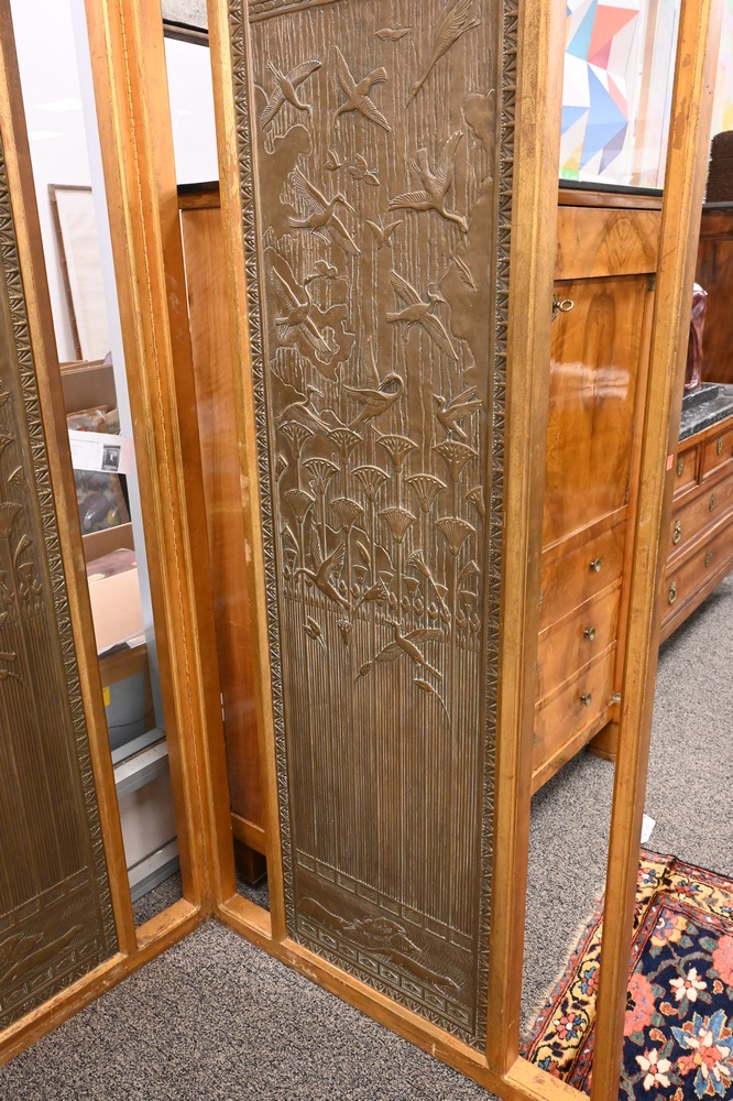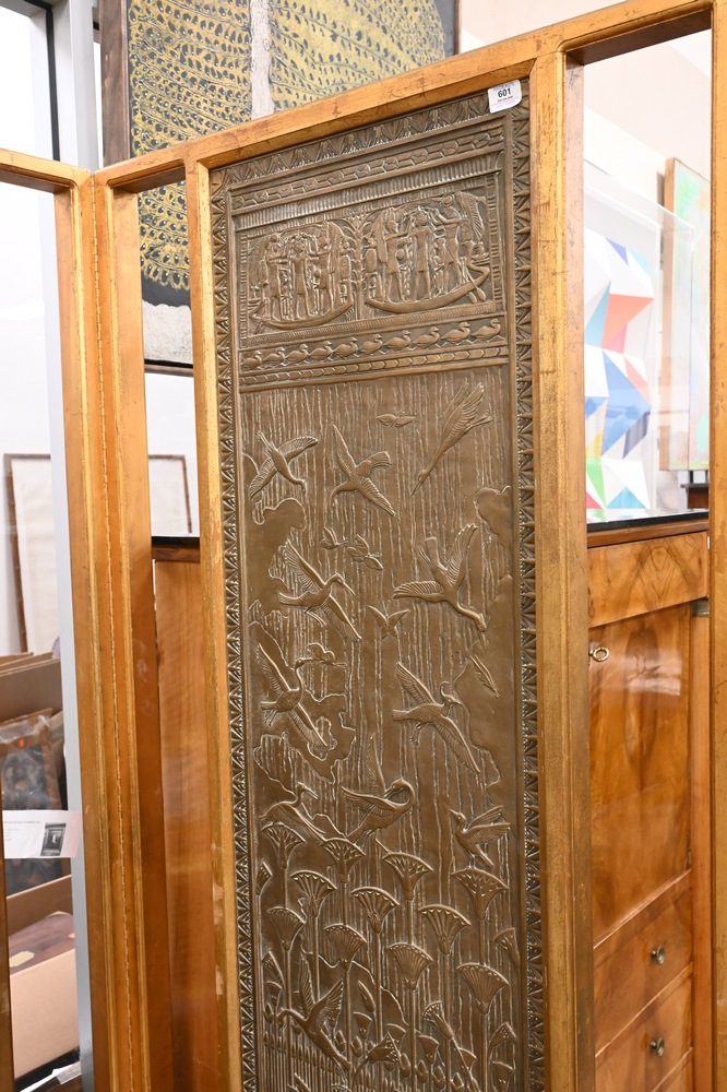 Lot 601: Pair of Large Art Deco Bronze Panels, made into a two fold screen, having Egyptian style relief depicting figures over flying cranes…