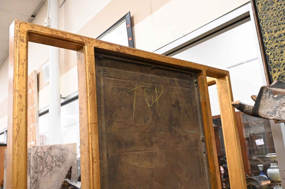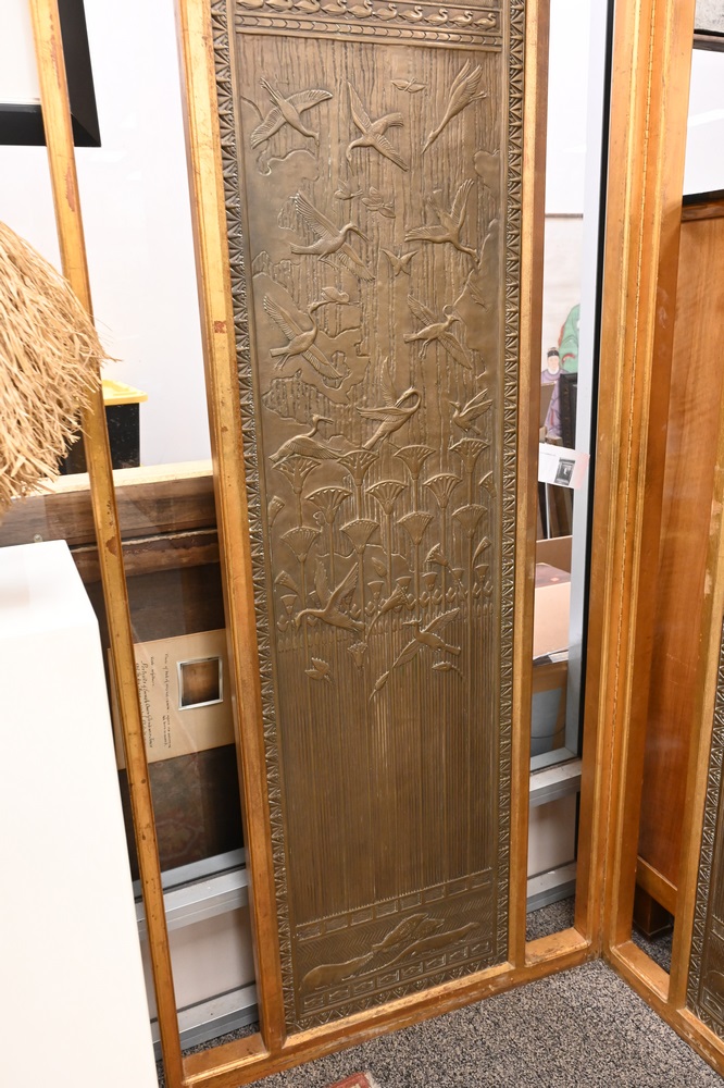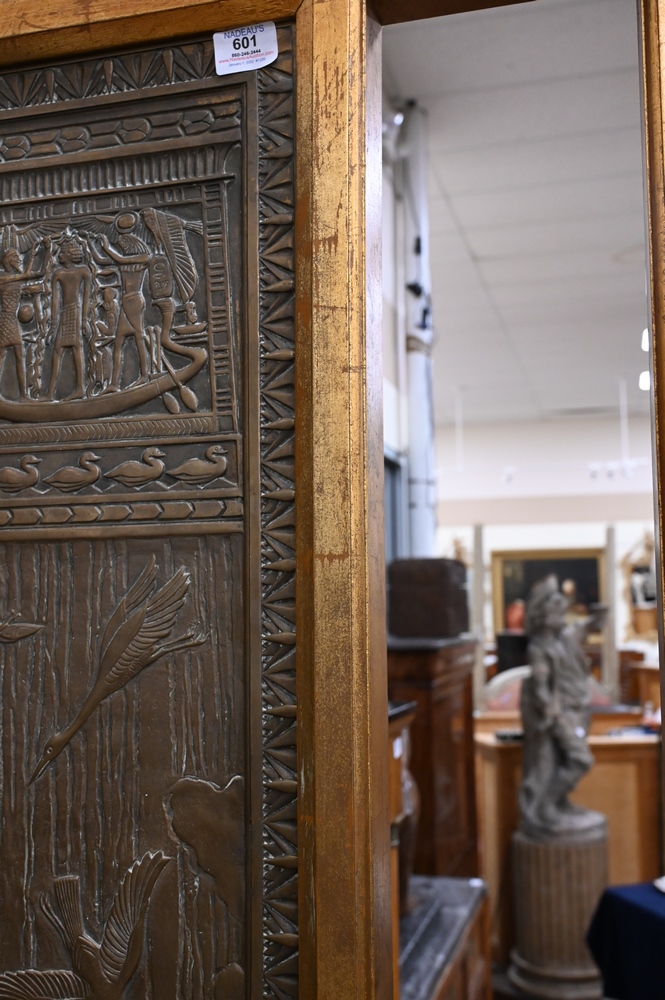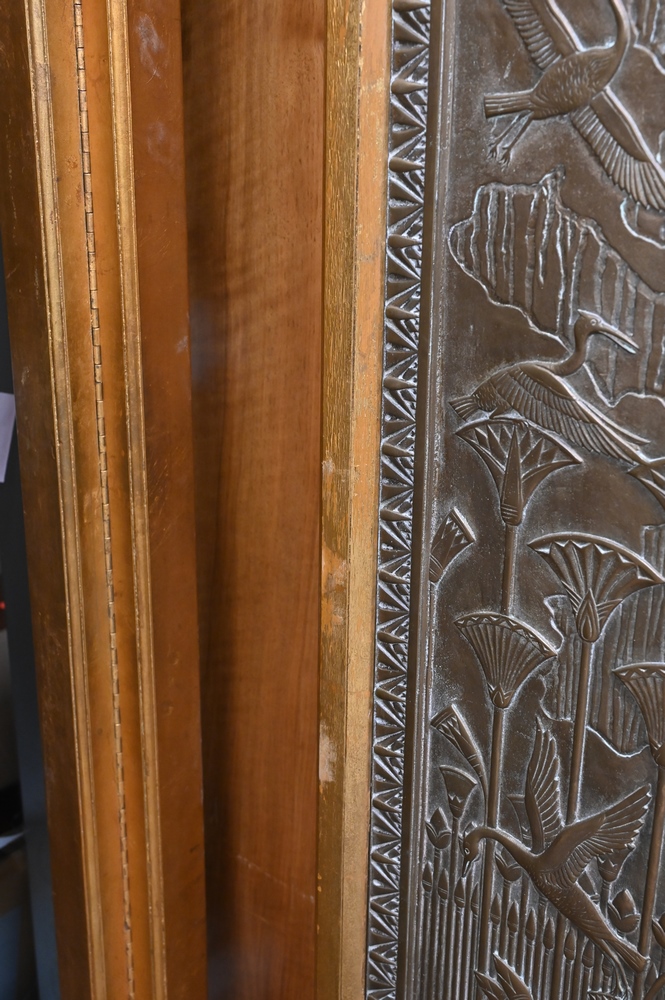 Pair of Large Art Deco Bronze Panels, made into a two fold screen, having Egyptian style relief depicting figures over flying cranes and animals, each bronze panel set in a gilt wood frame, bronze panel height 76 1/2 inches, width 18 1/4 inches, total height 81 inches, width 75 inches.