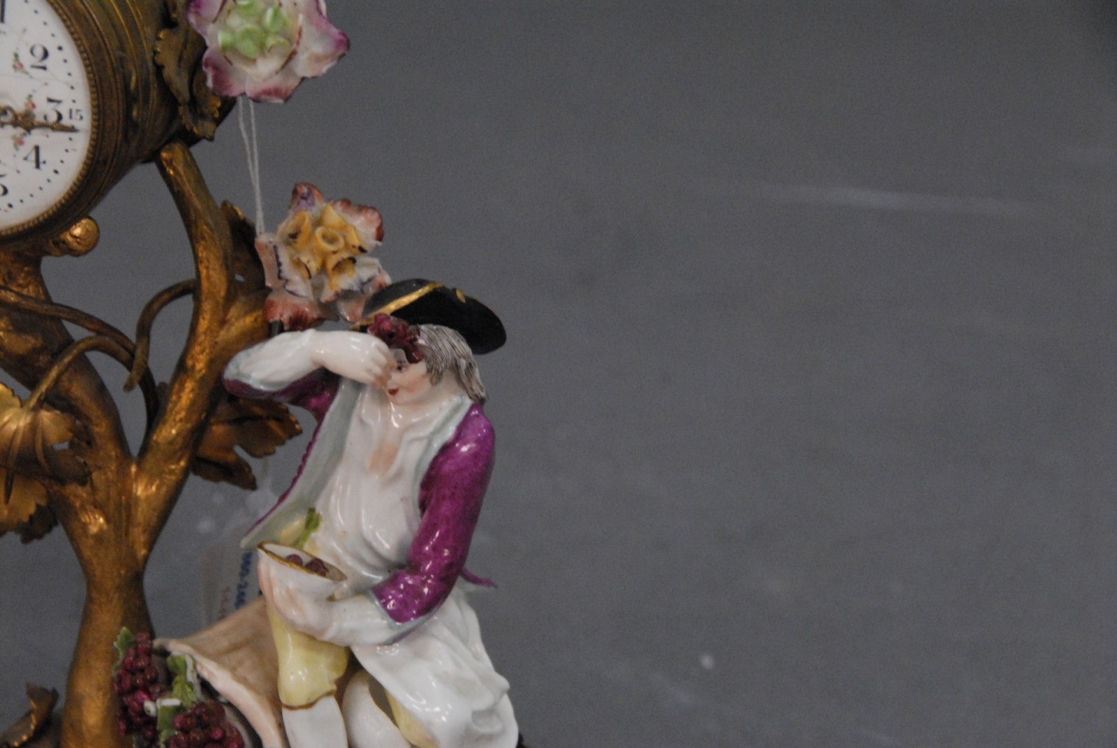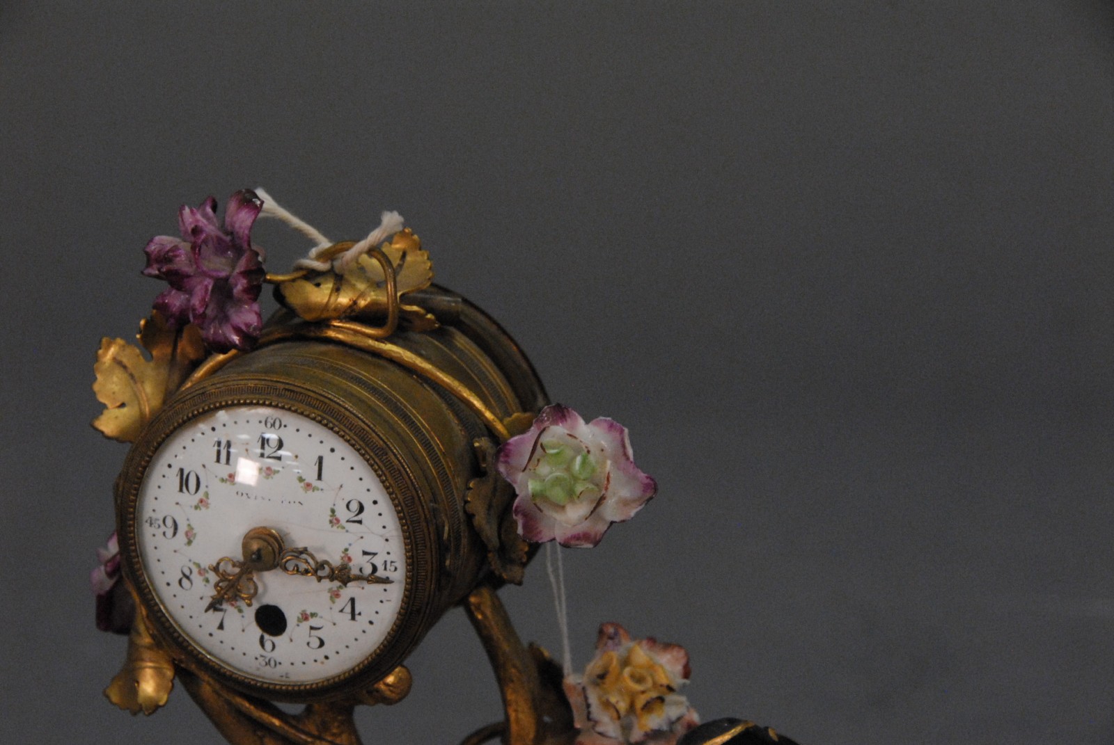 French bronze clock mounted with porcelain figure and flowers porcelain dial marked Ovington.
