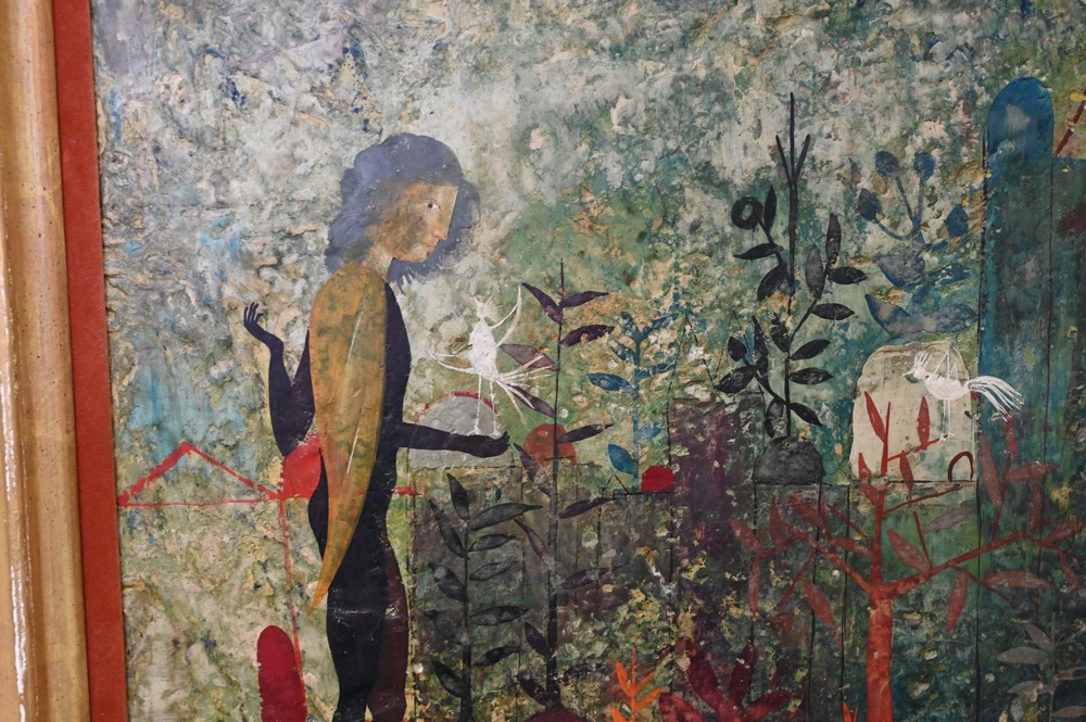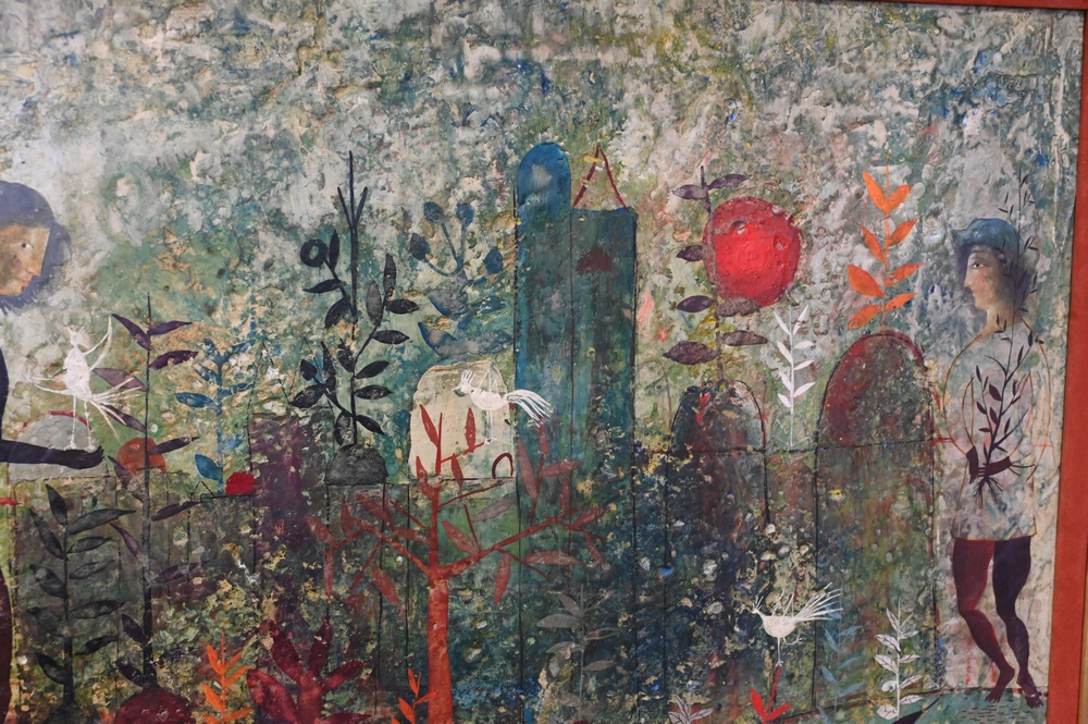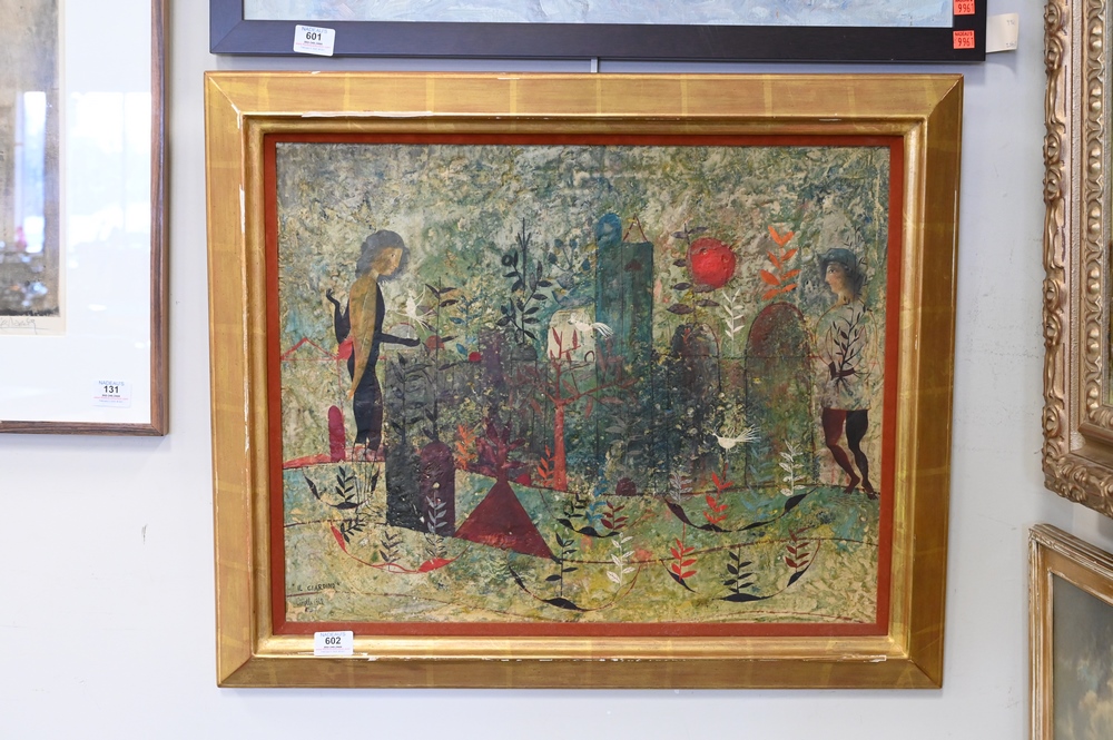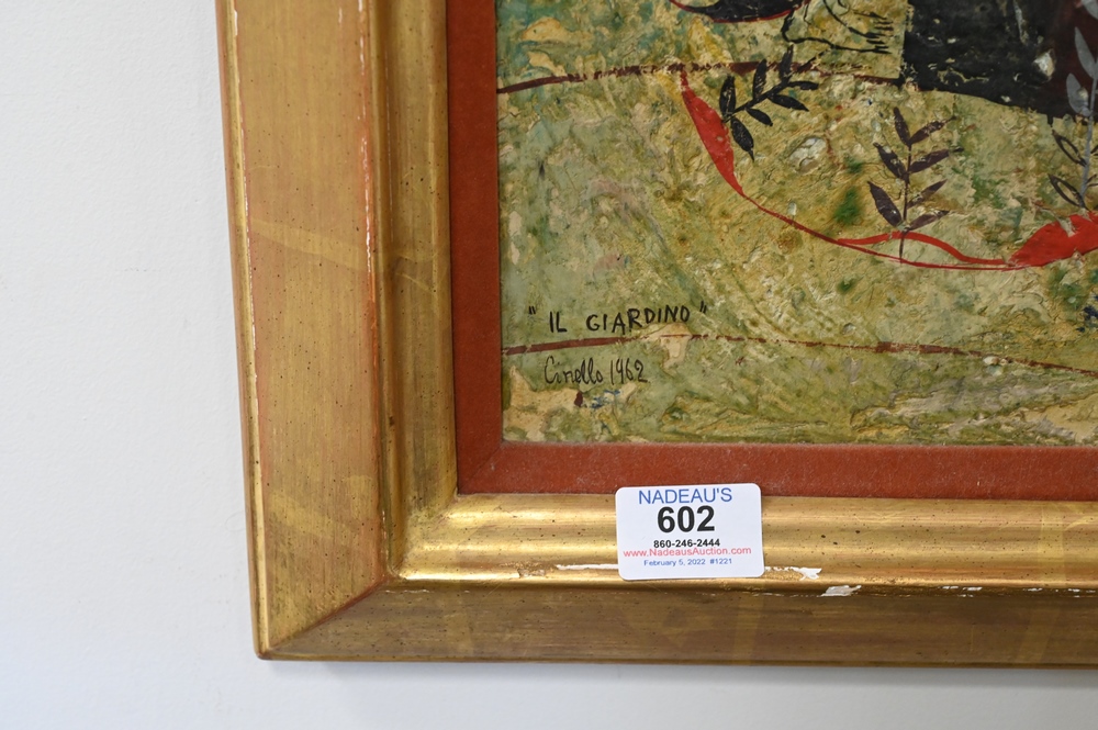 Lot 602: Losi Cinello (Italian, 1928-1982), Il Giardino, oil on plywood, signed, titled, and dated lower right Il Giardino Cinello 1962, Galleria Schneider stamp on verso, 19.25″ x 23.5″.
