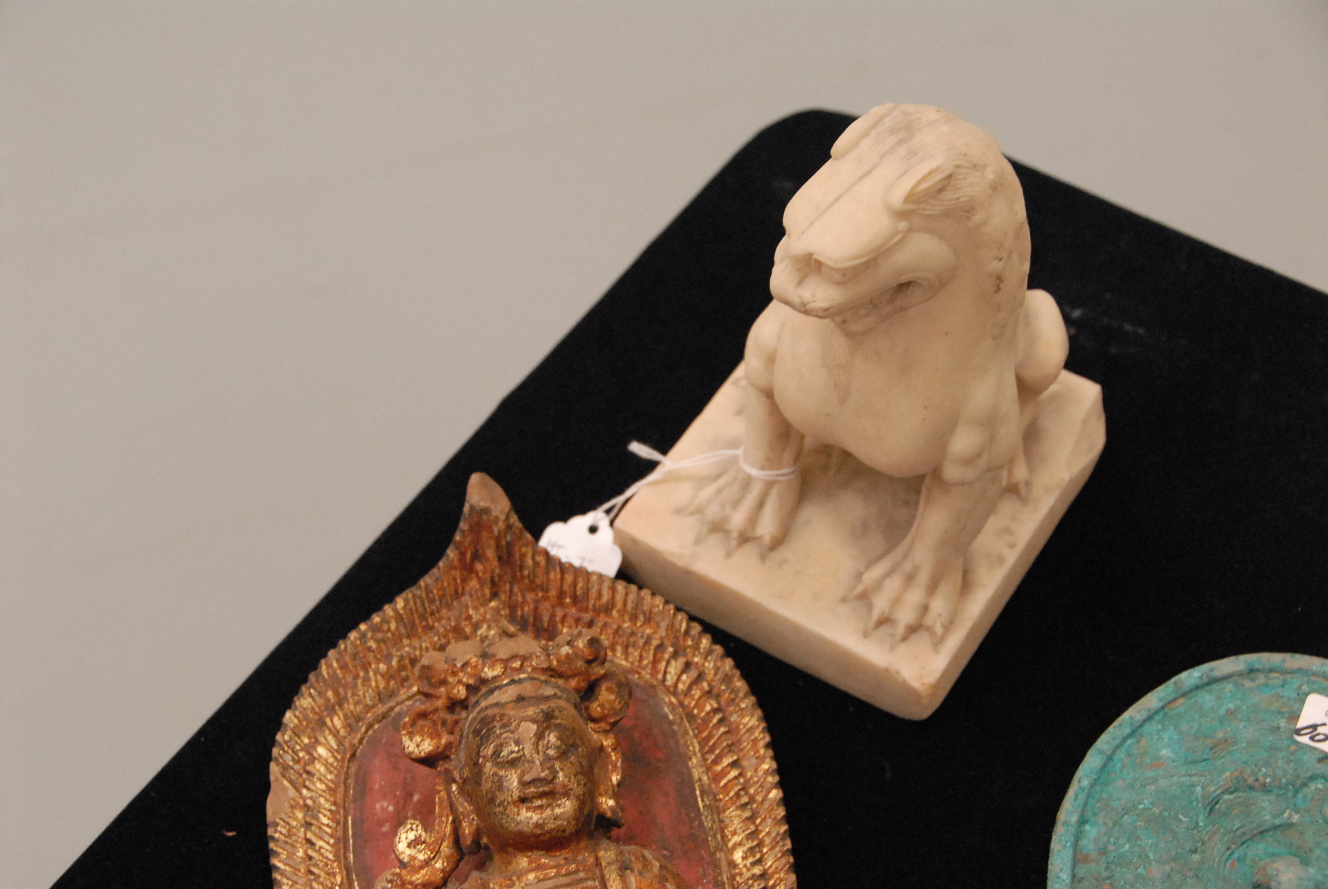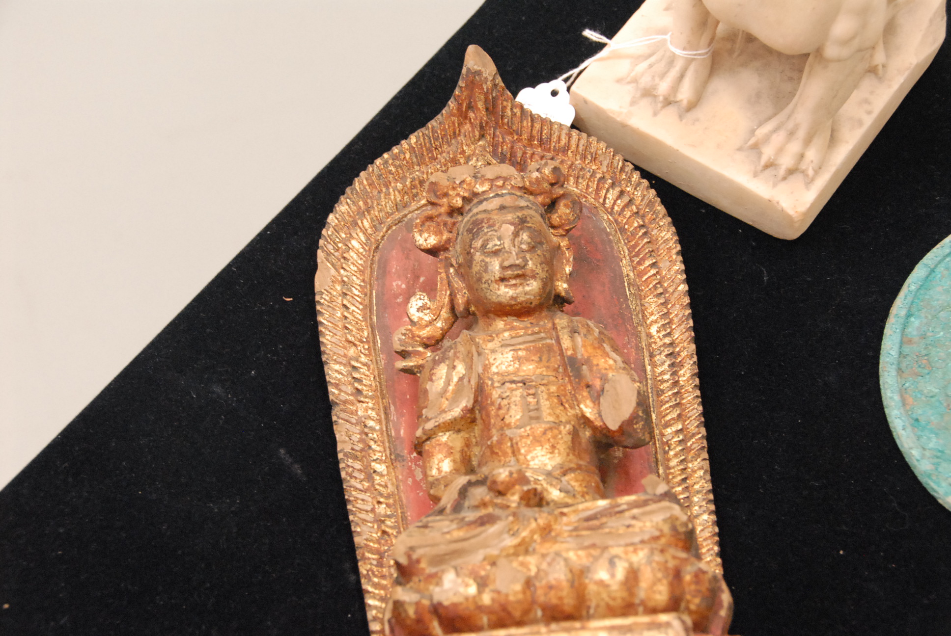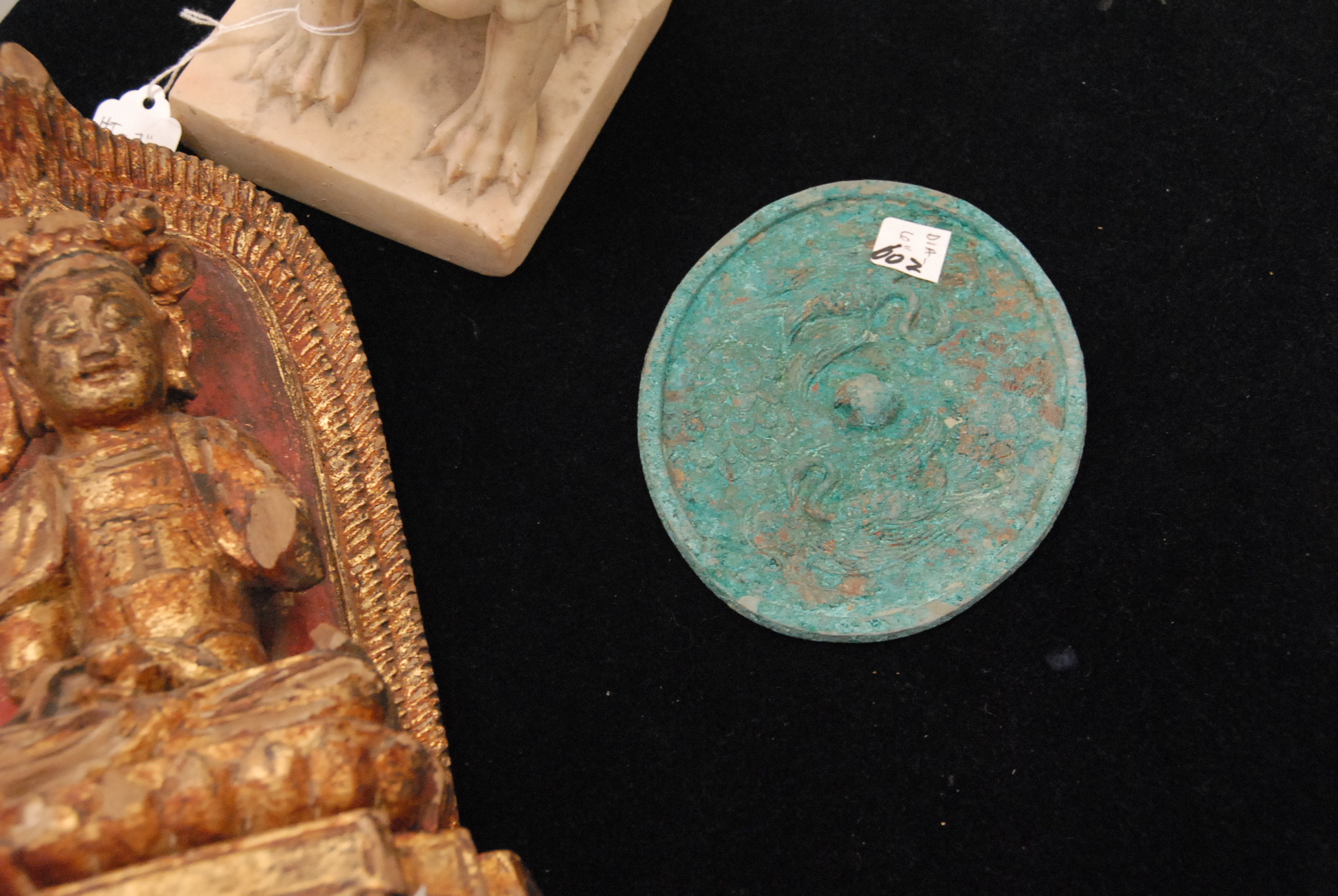 Three piece lot to include foo dog figure, bronze mirror, and gilt wood Buddah.