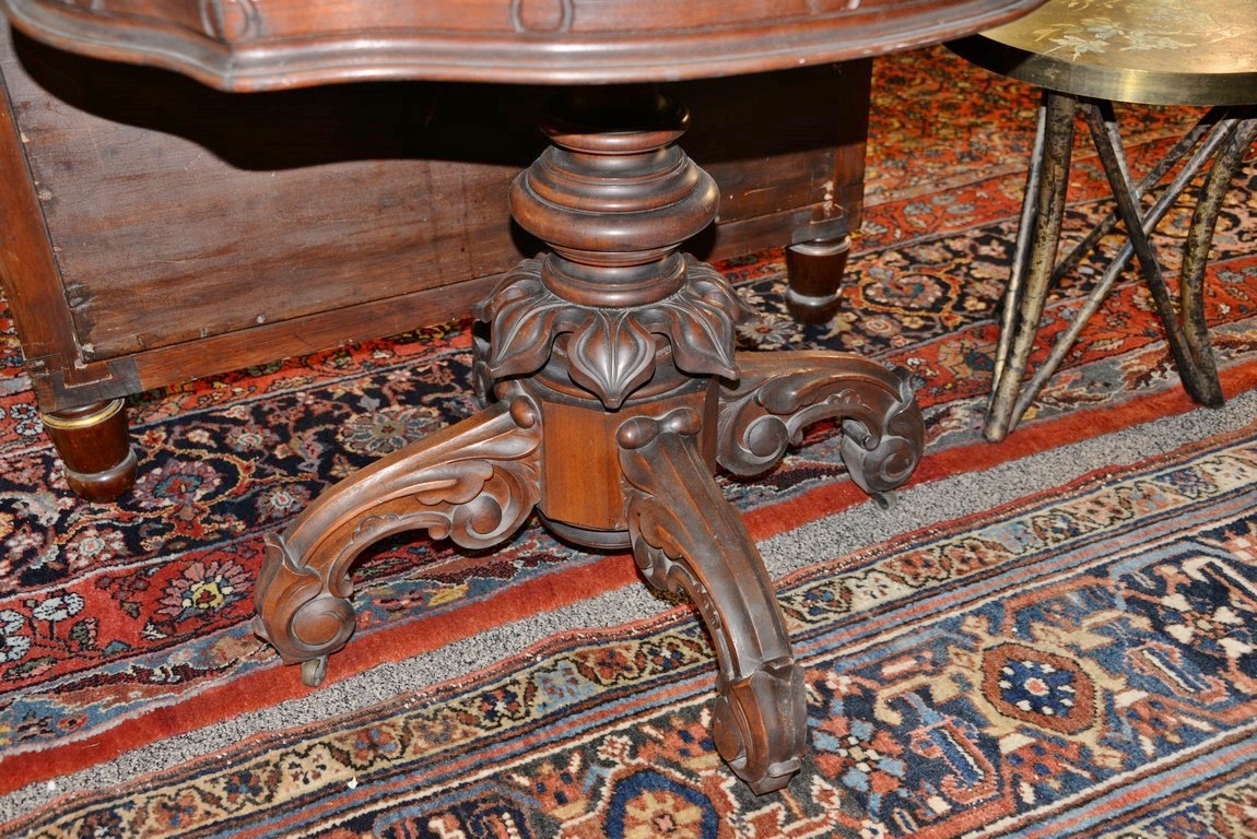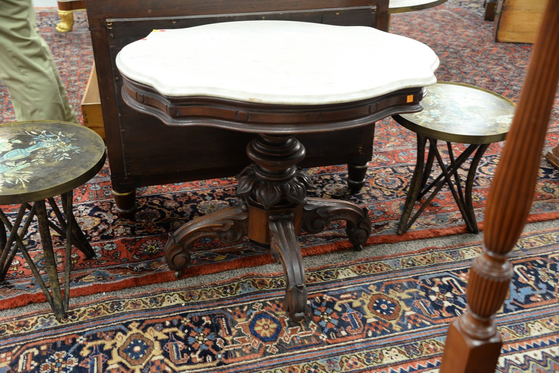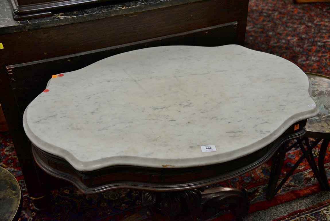 Lot 602: Victorian shaped marble top table on carved pedestal base set on four downswept members. ht. 30 in. top: 27 1/2 x 38
