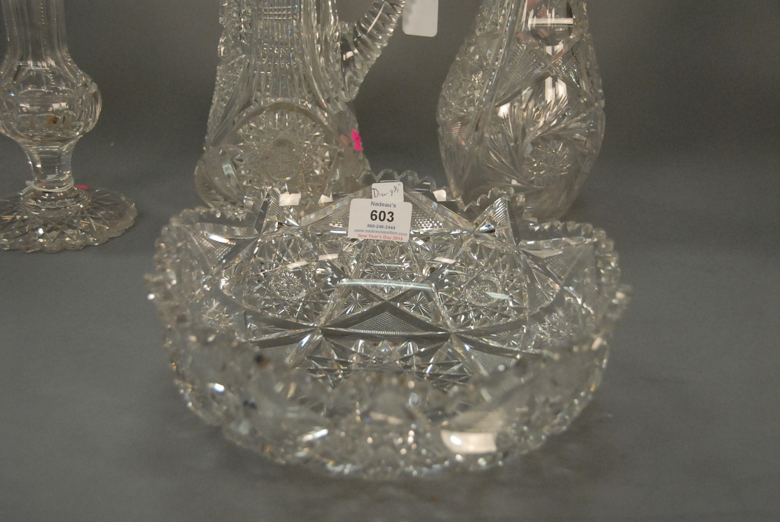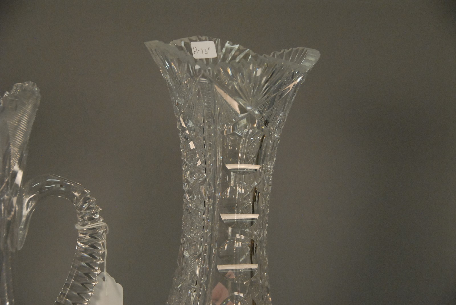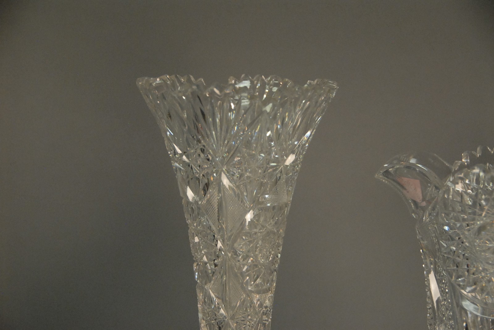 Four piece lot of cut glass including two vases, bowl, and pitcher.