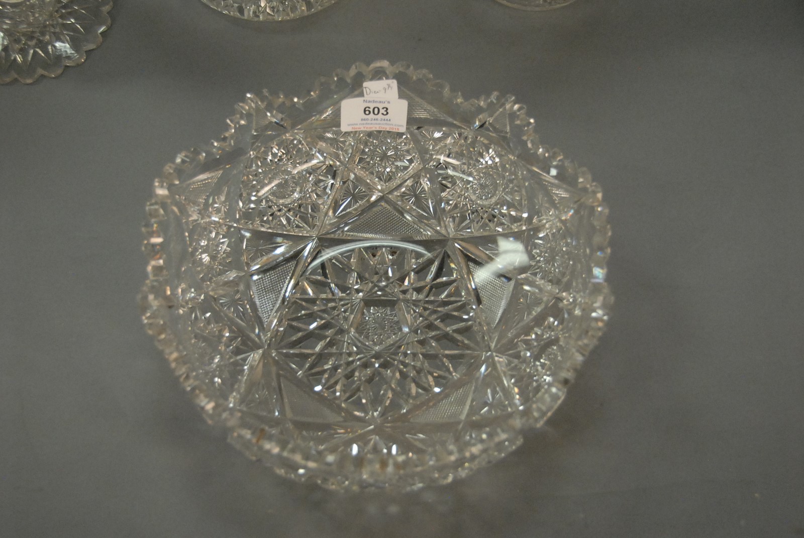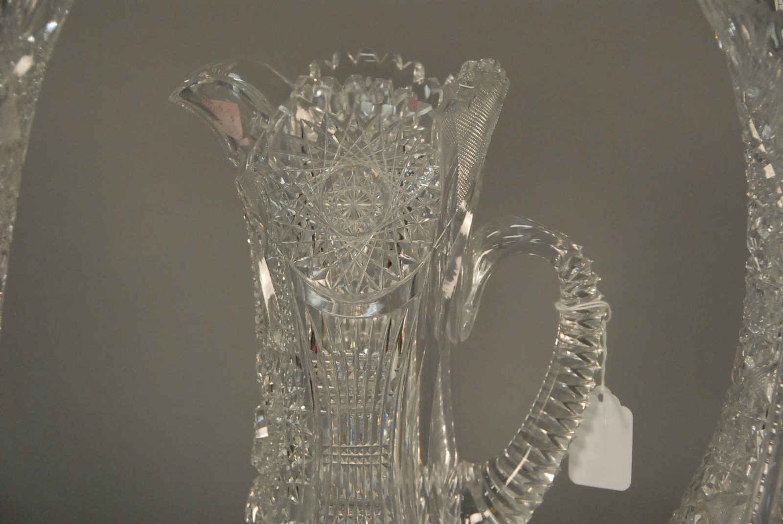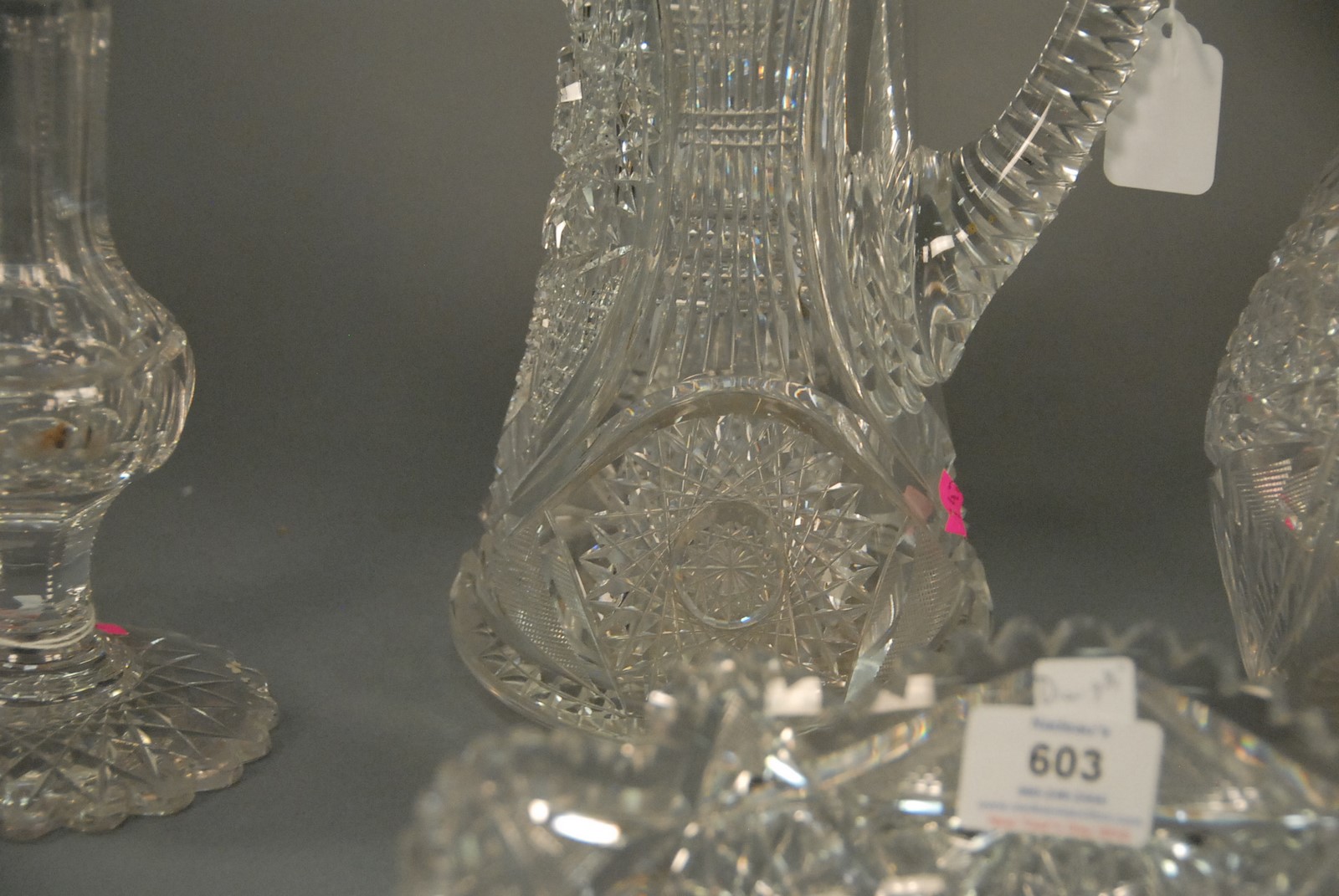 Four piece lot of cut glass including two vases, bowl, and pitcher.