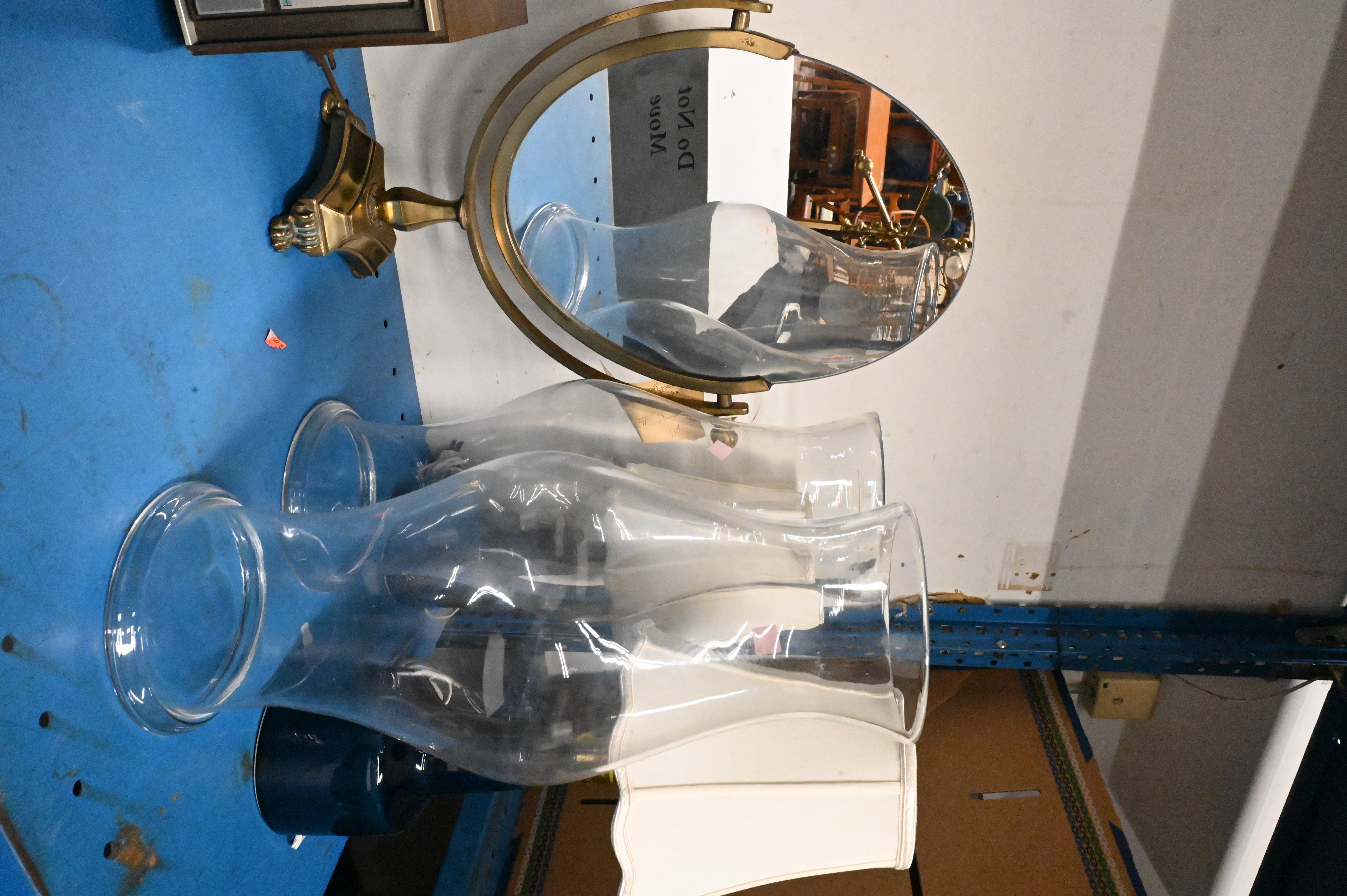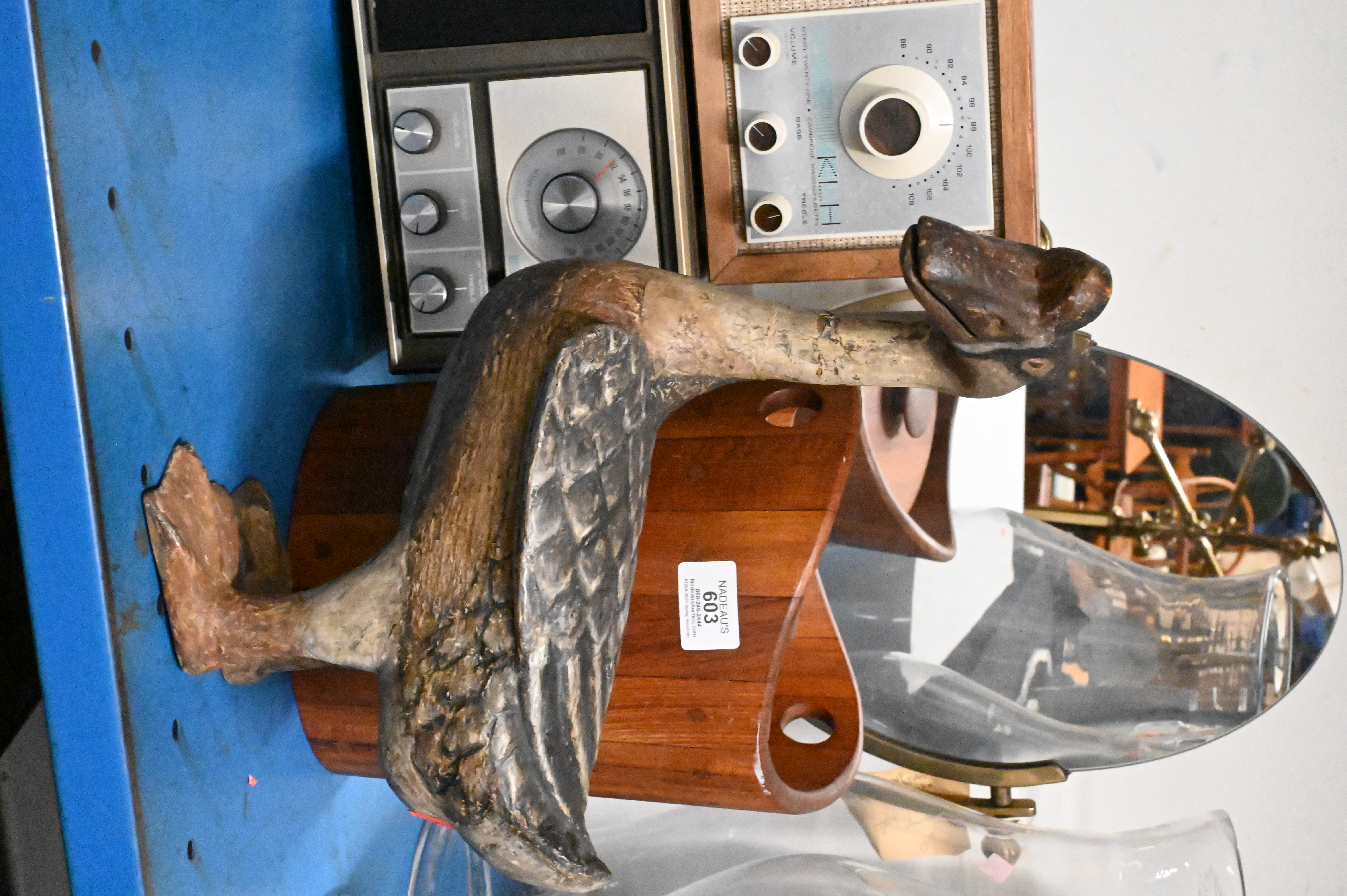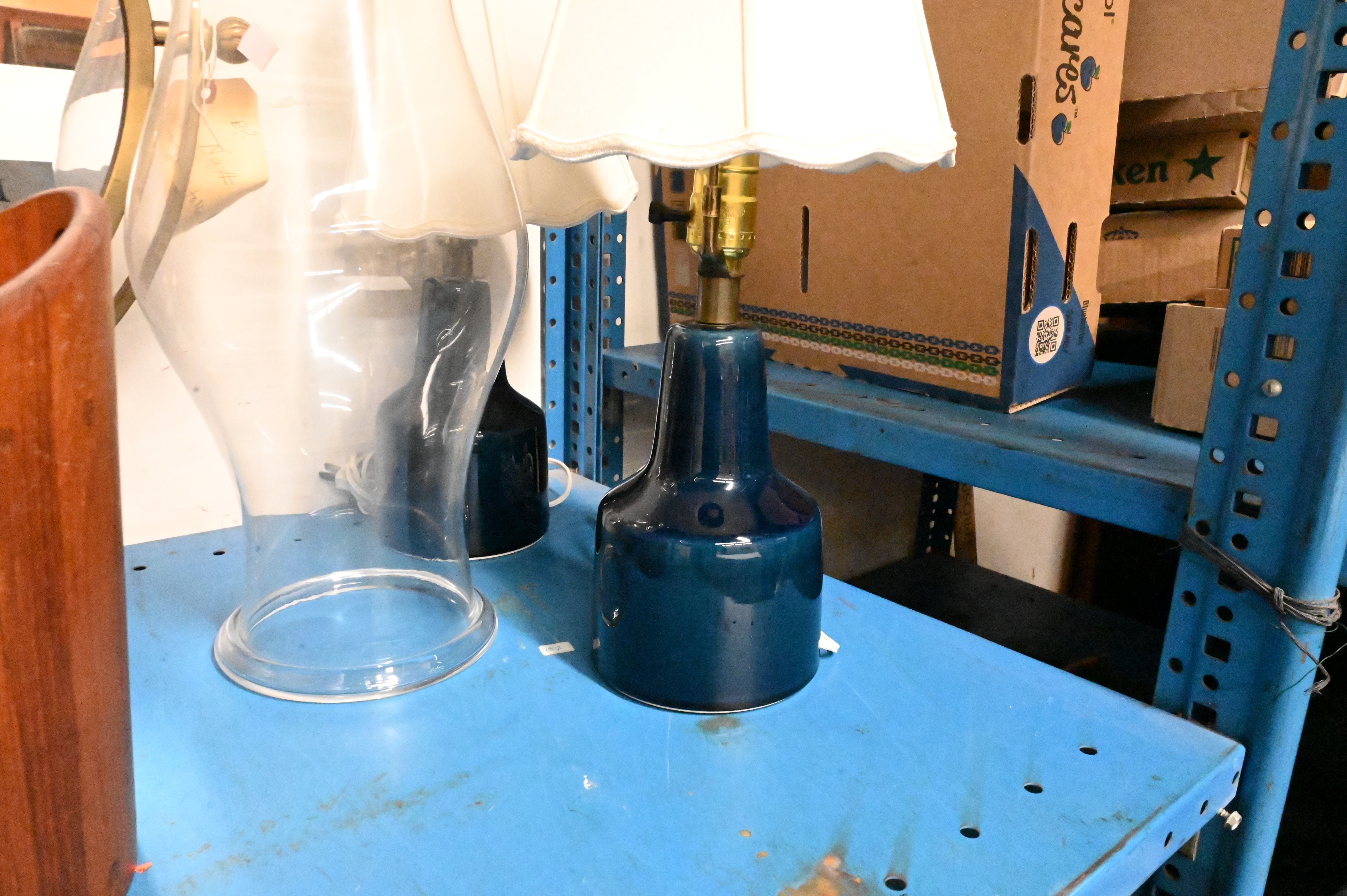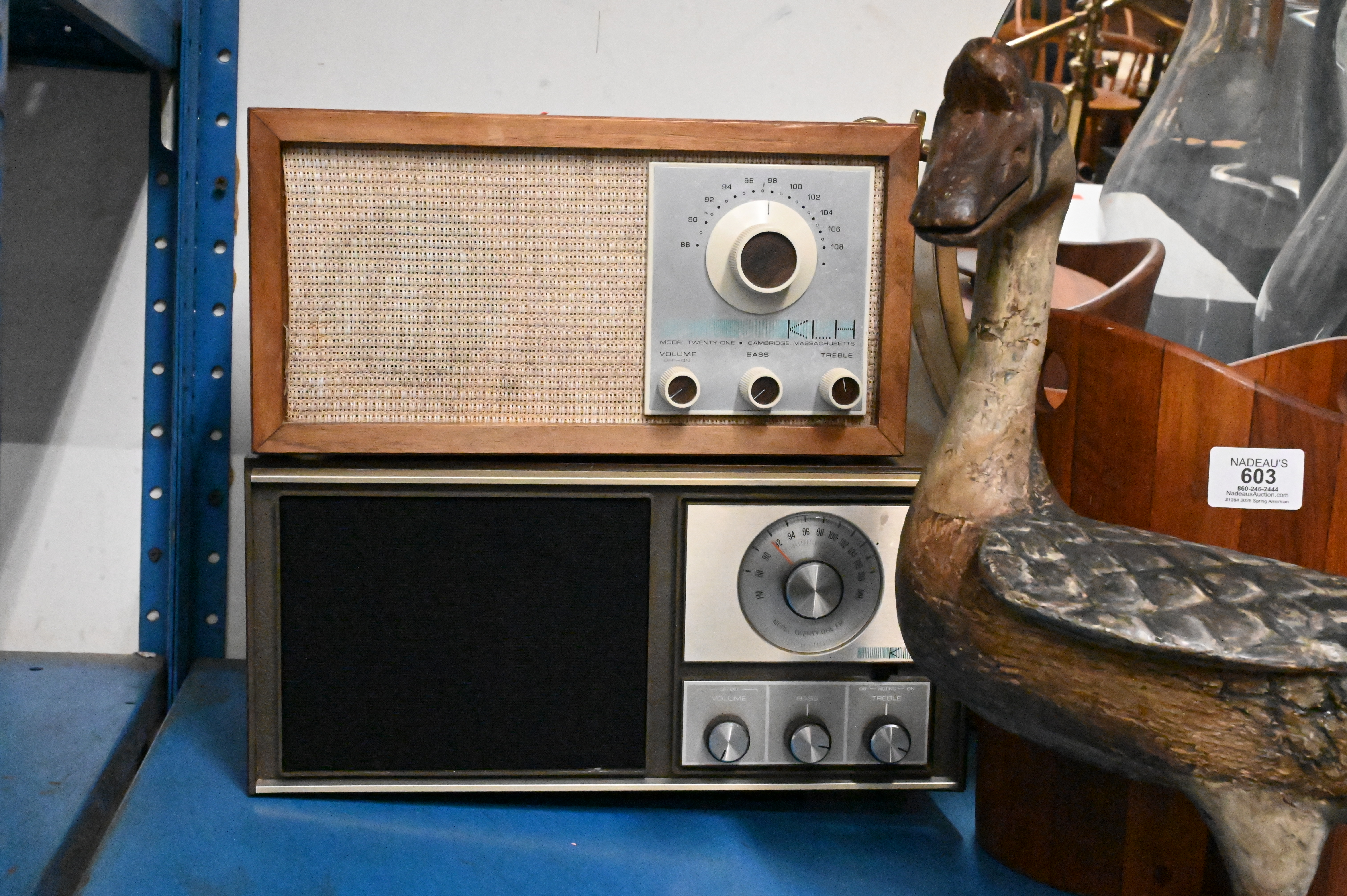 to include a pair of brass candlestick lamps, a pair of hurricane shades, two KLH radios, pair of small blue lamps, and one carved duck