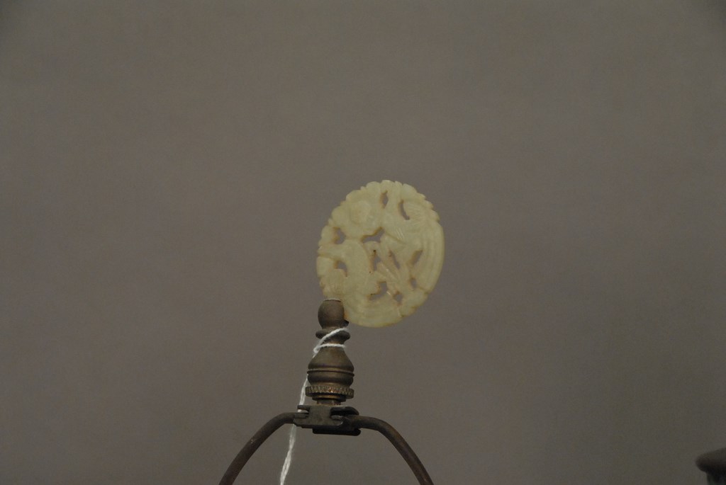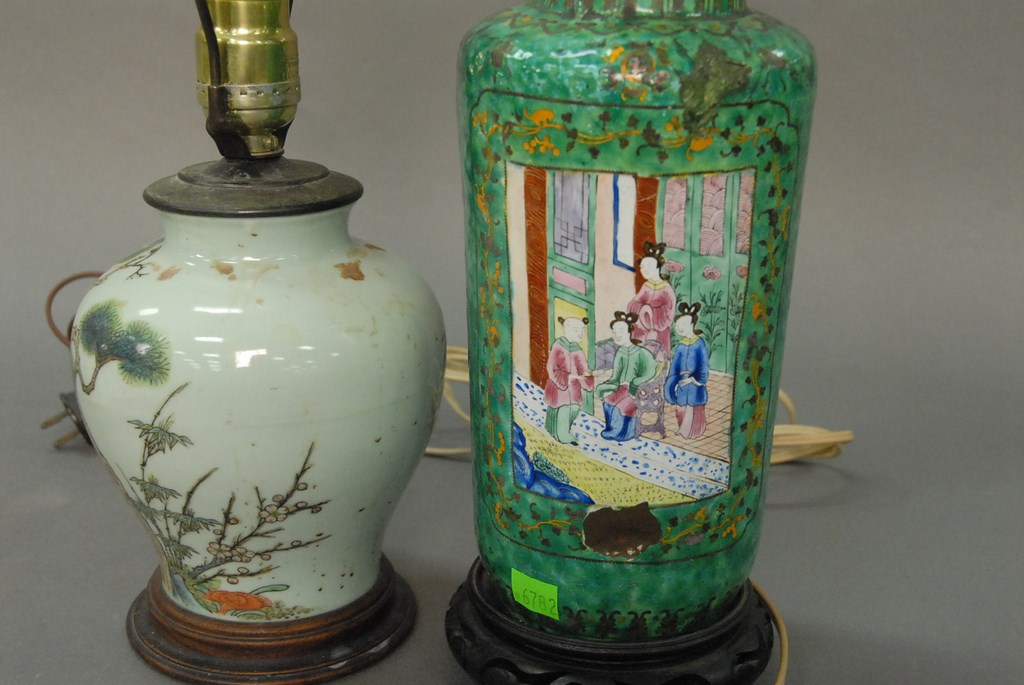 Lot 603: Two Chinese vases made into table lamps, enameled green vase with plaque with figures and porcelain vase with tree and birds.