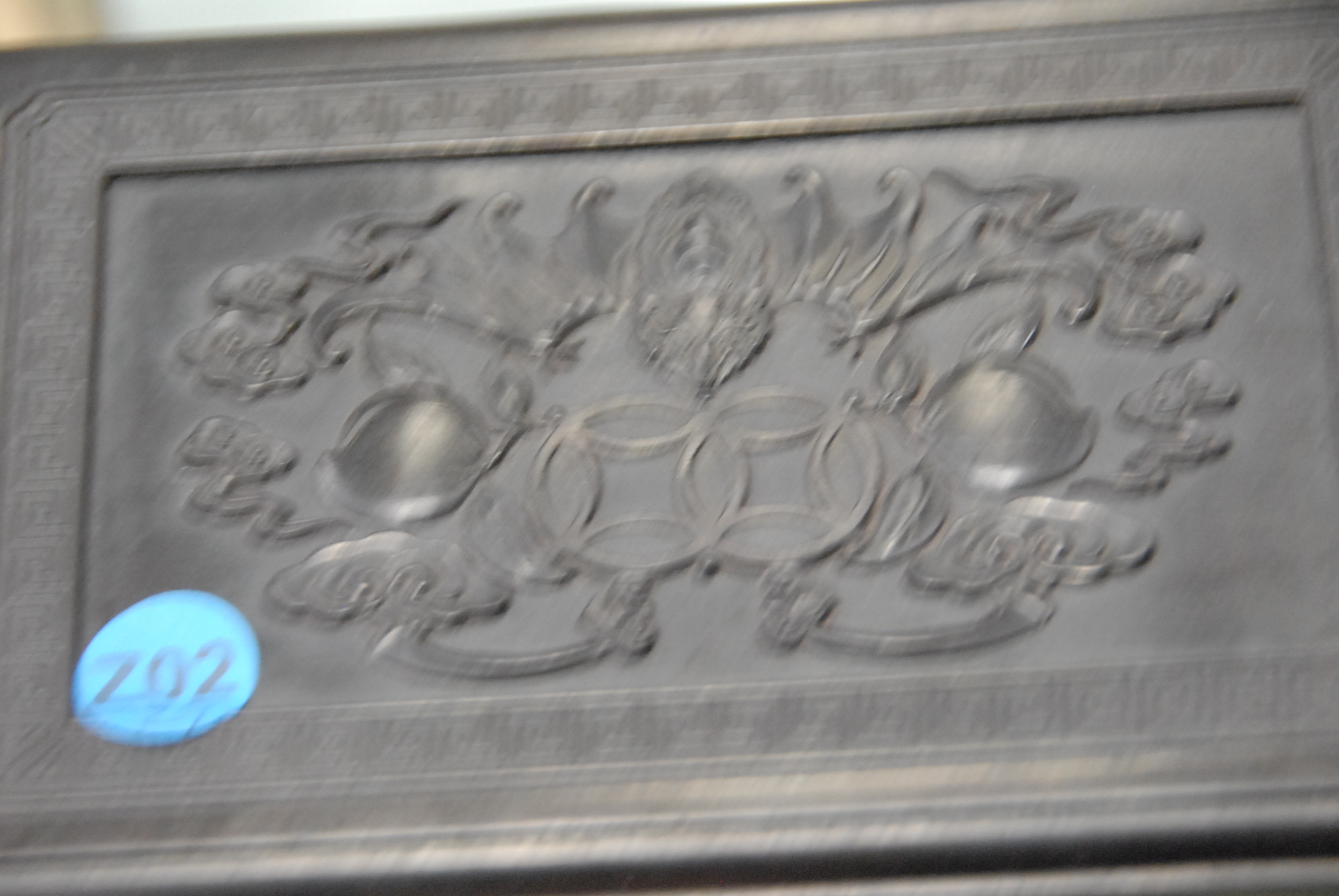 Chinese hardwood hinged box decorated with bats, contains five blank steatite chops and a pair of ivory Janus heads, 20th century.