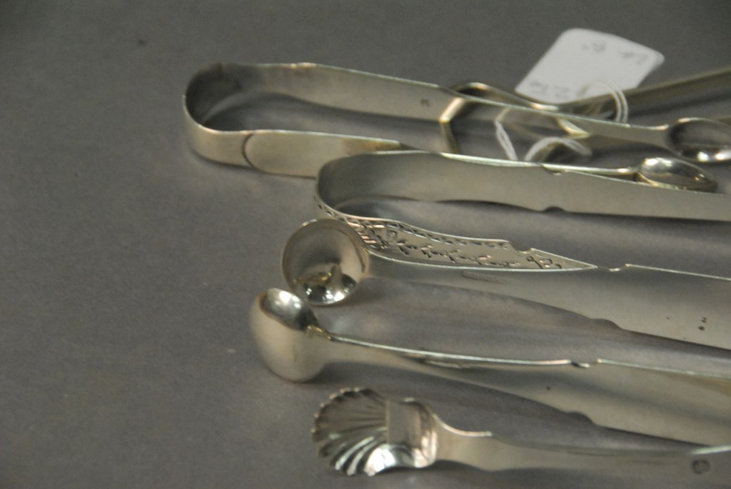 Group of nine sterling and coin silver tongs. lg. 5in. – 8in. 13.2 t oz.