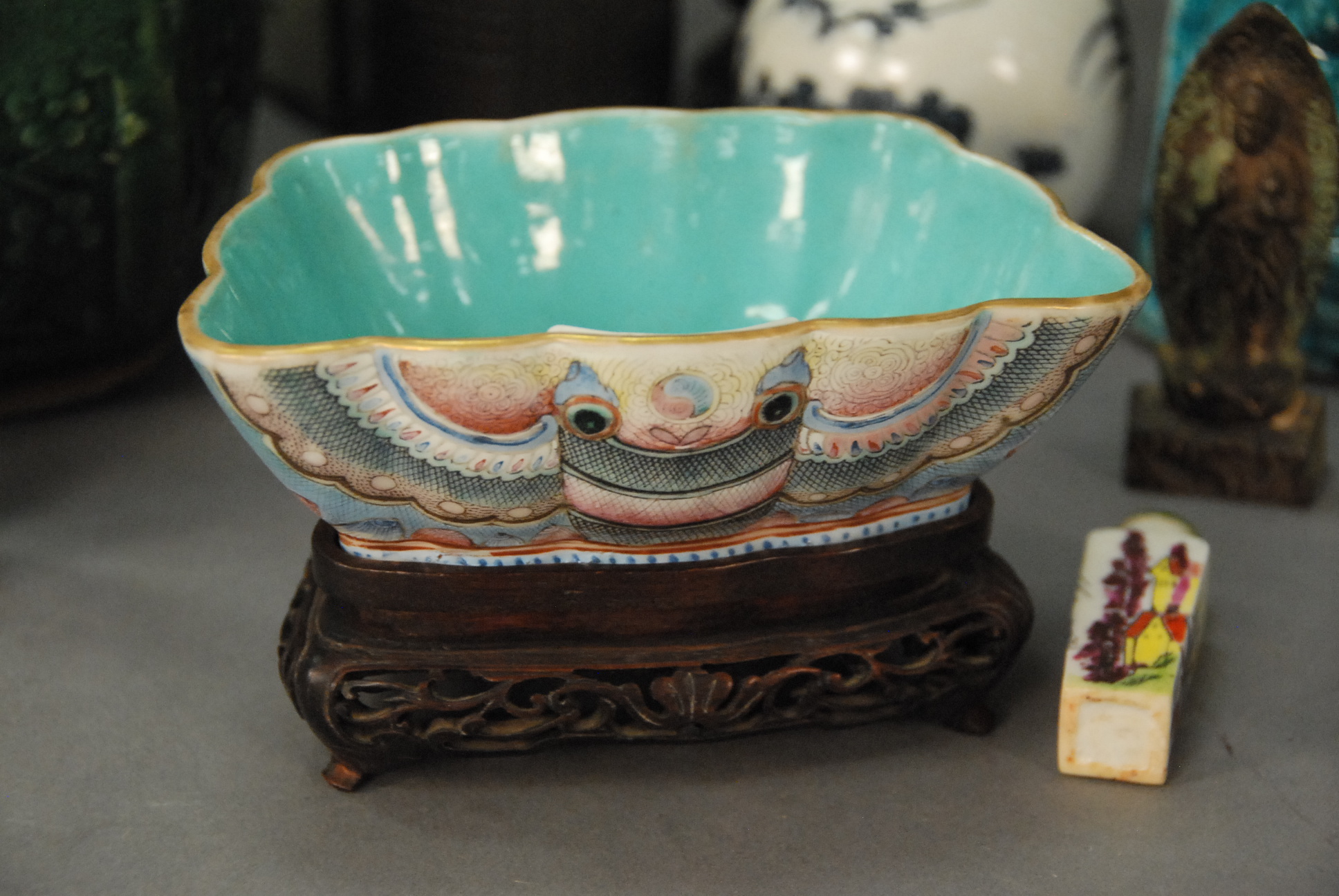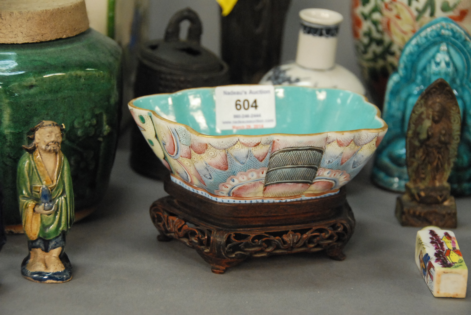Lot 604: Two box lots of Asian items to include foo dog, scallop edge bowl, ginger jars, two snuff bottles, clay figure, pair of blue and white bottles, etc.