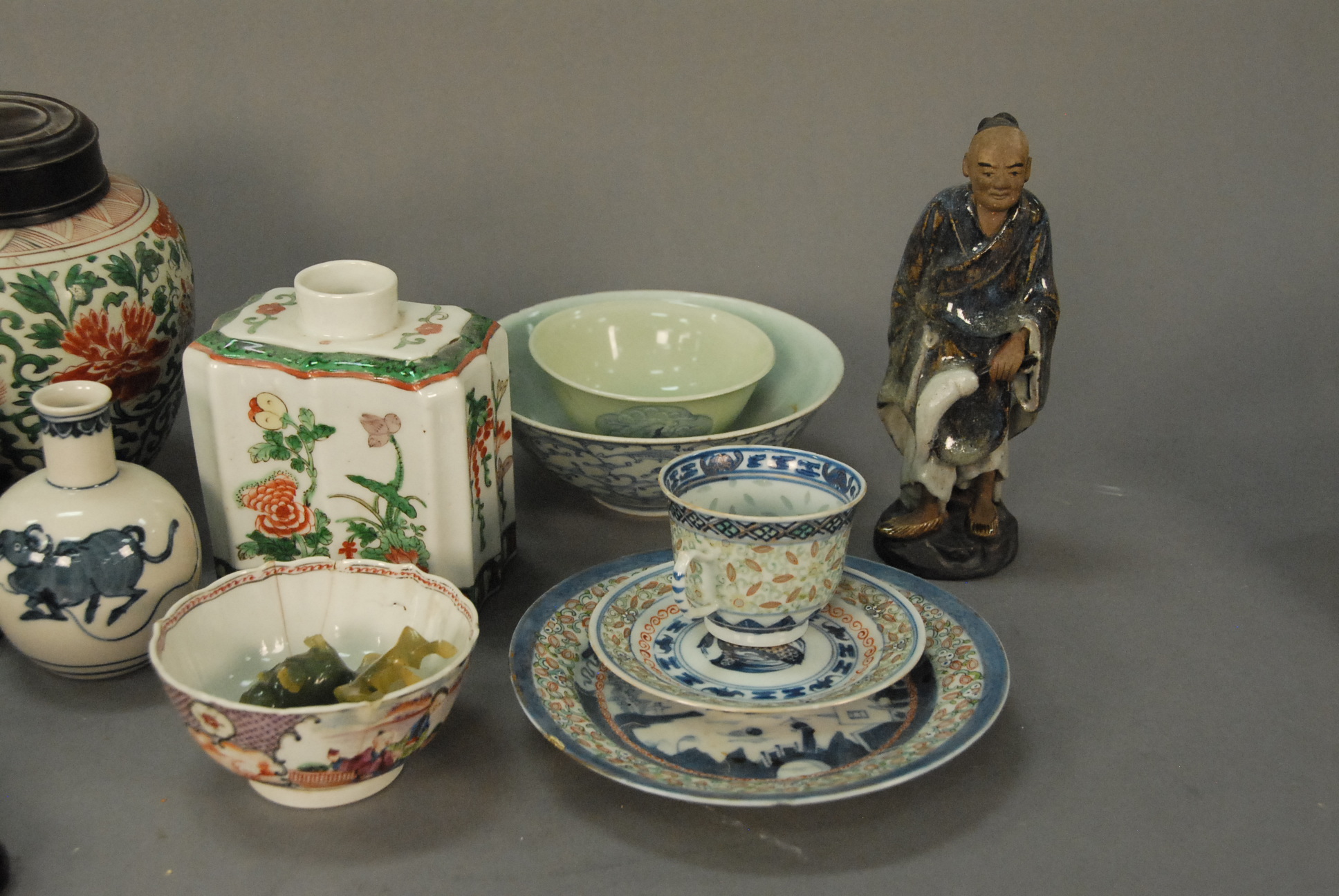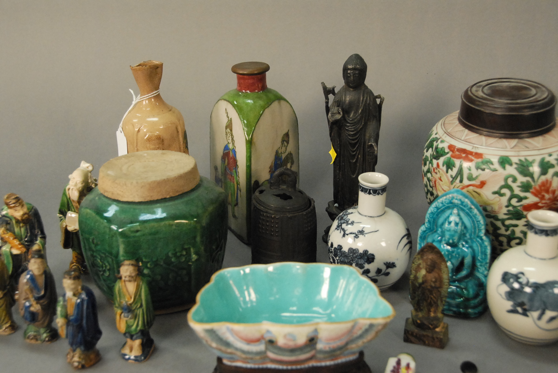 Two box lots of Asian items to include foo dog, scallop edge bowl, ginger jars, two snuff bottles, clay figure, pair of blue and white bottles, etc.