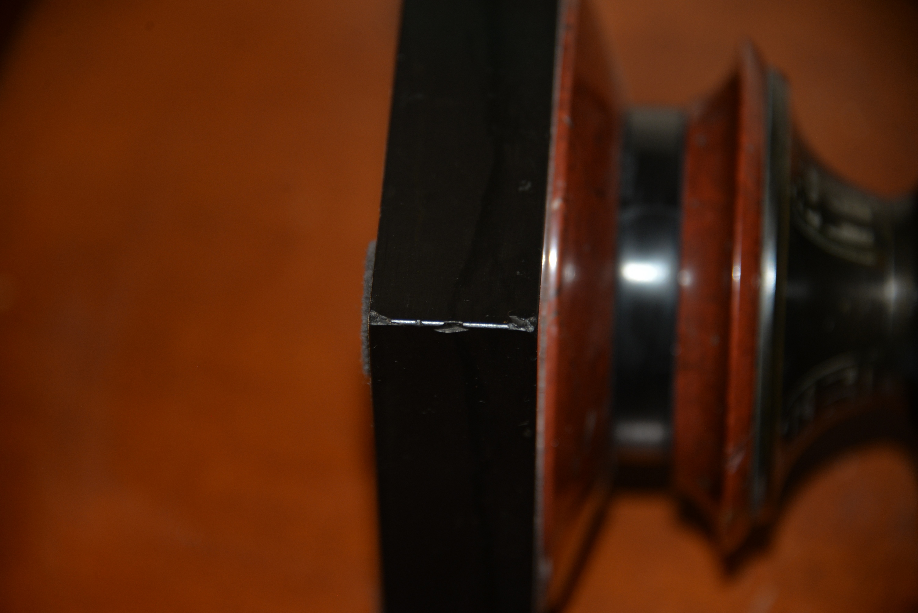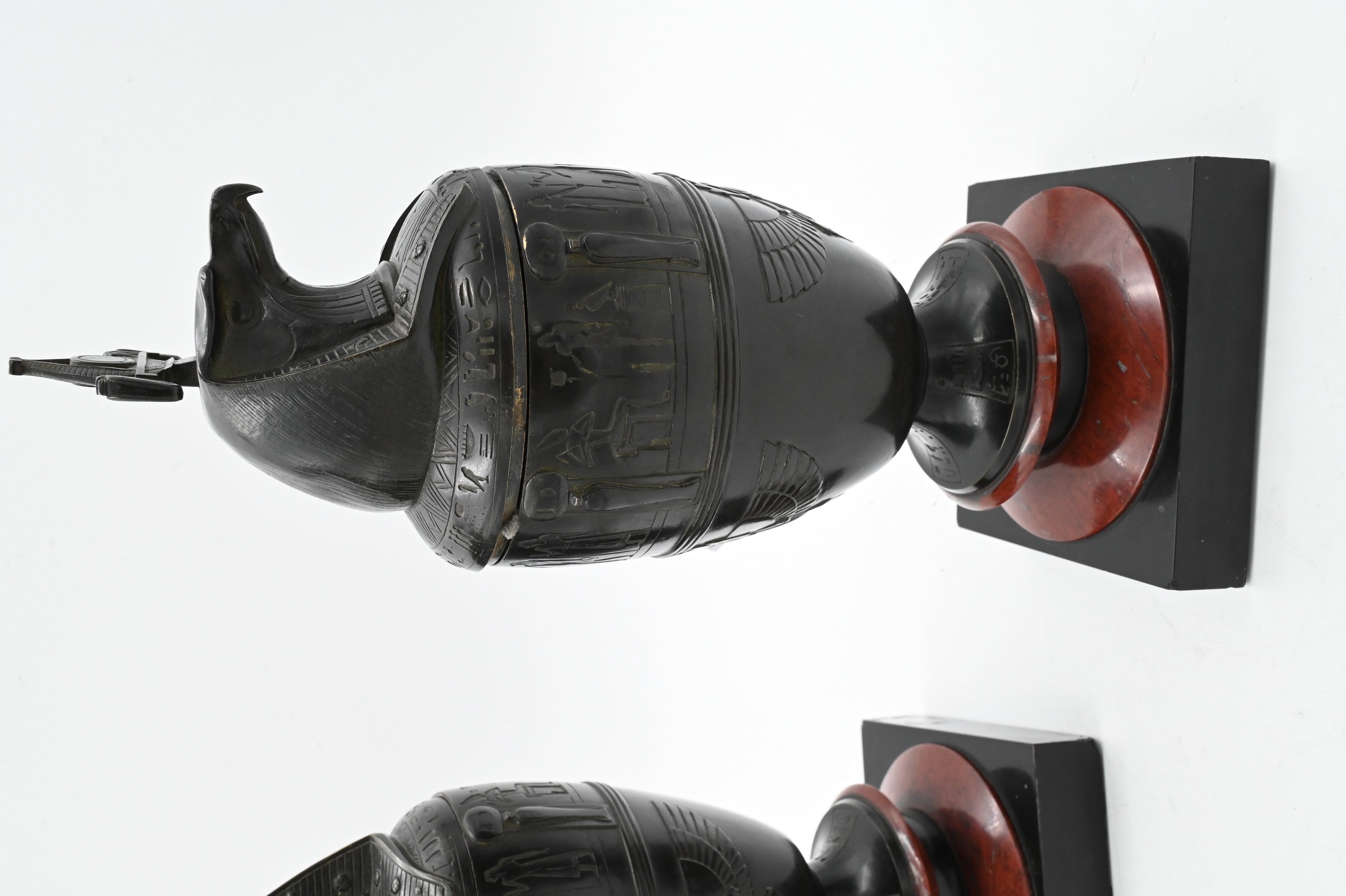 in the form of canopic vases, atop fine black lacquered wood and red marble bases, having falcon’s headed effigy of Qebehsenuef