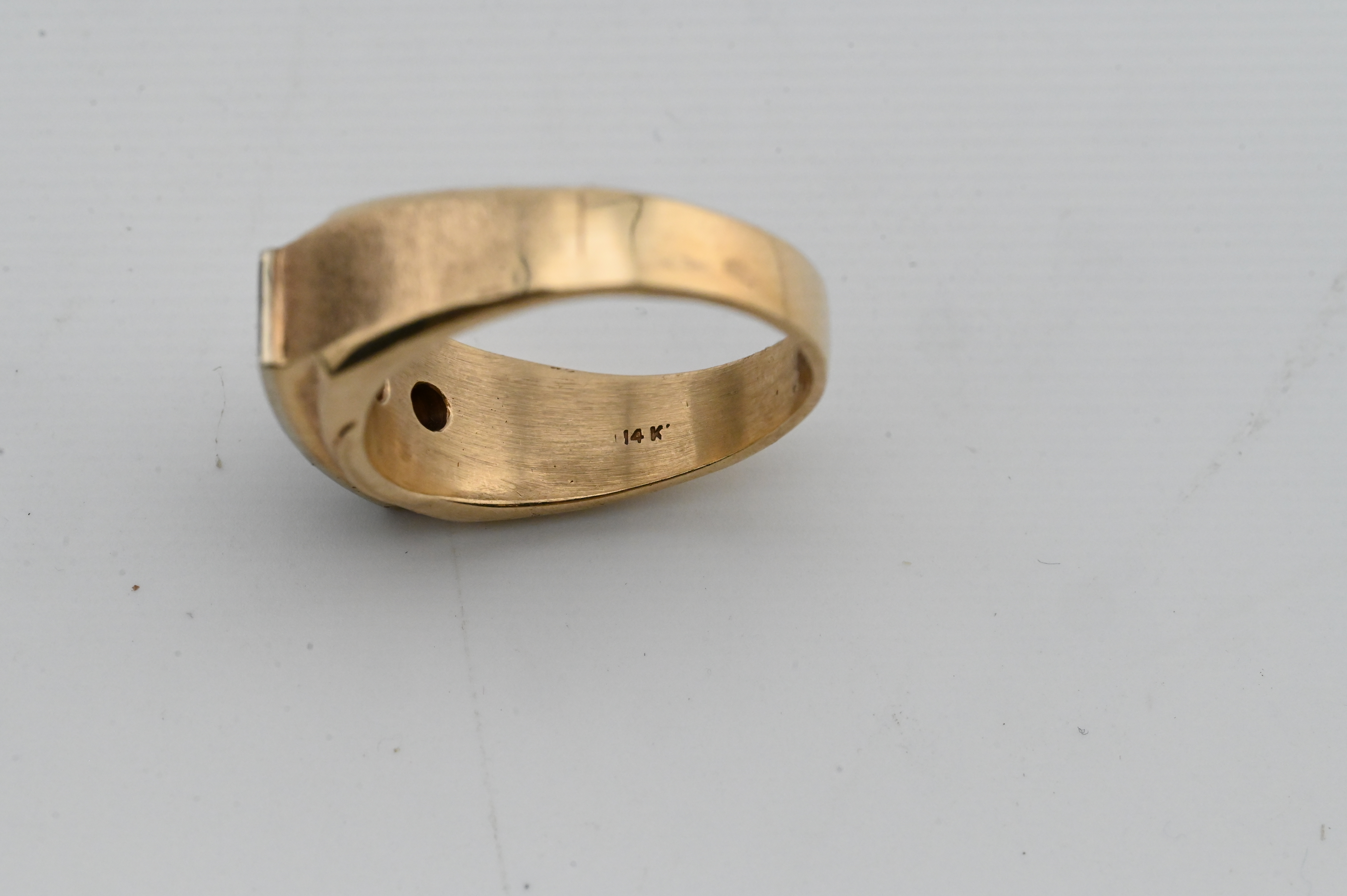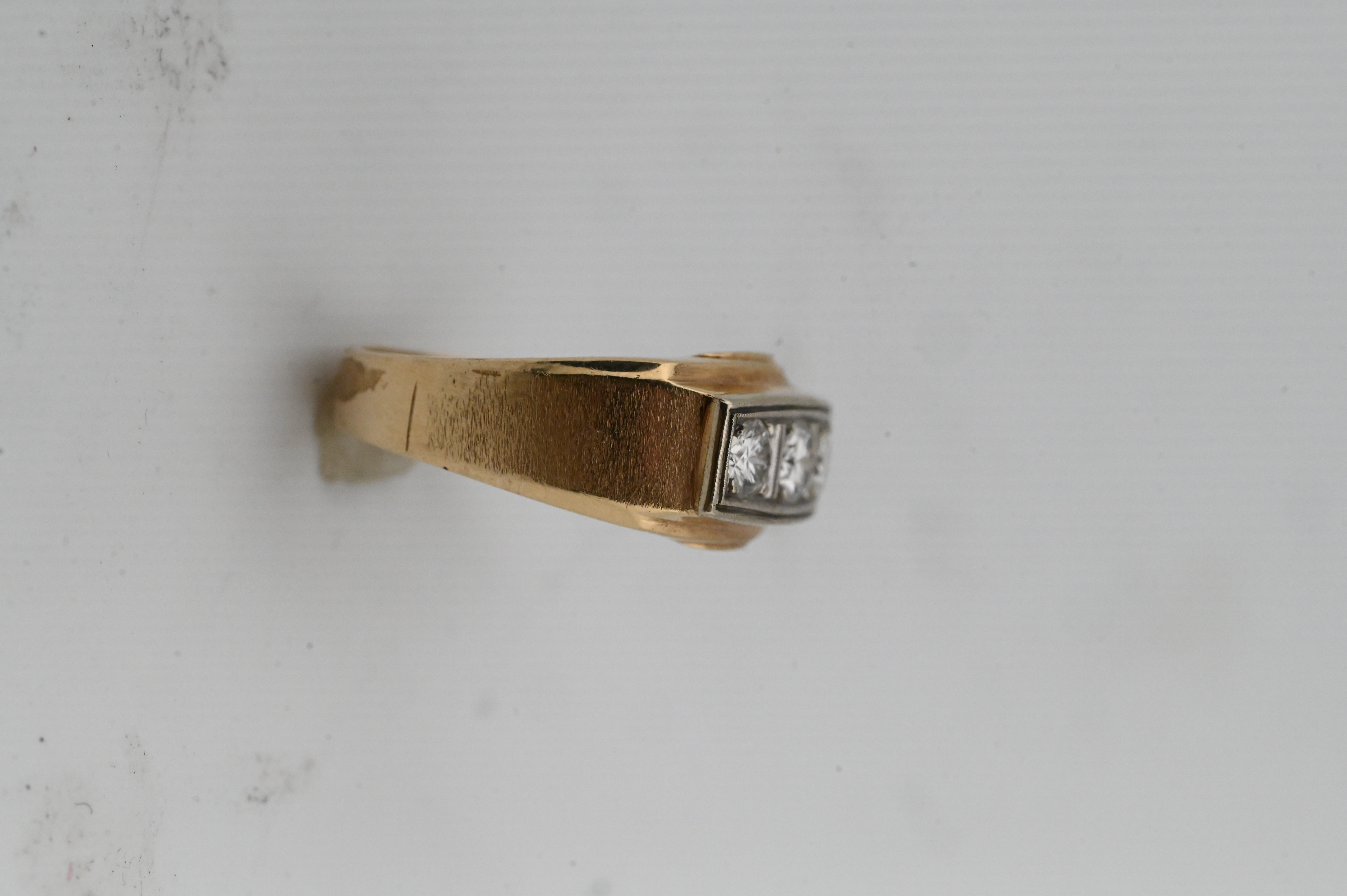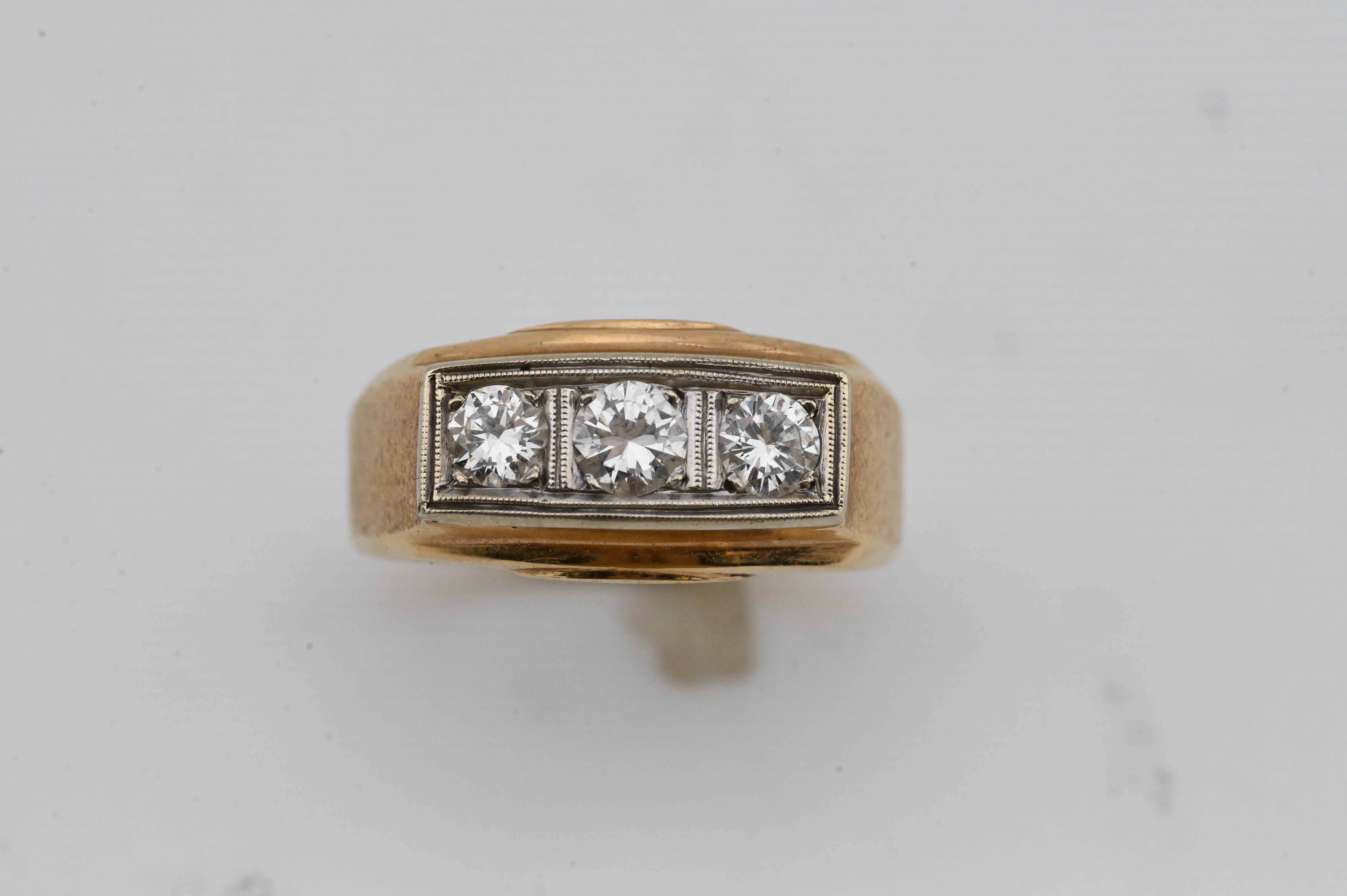 Handsome wide-band 14k yellow gold ring set with three round brilliant-cut diamonds, each approximately 4.6mm in diameter. Diamonds are bezel-set in a rectangular panel with stepped shoulders and a finely brushed finish to the band, size: 11 1/2, total weight: 15.9g