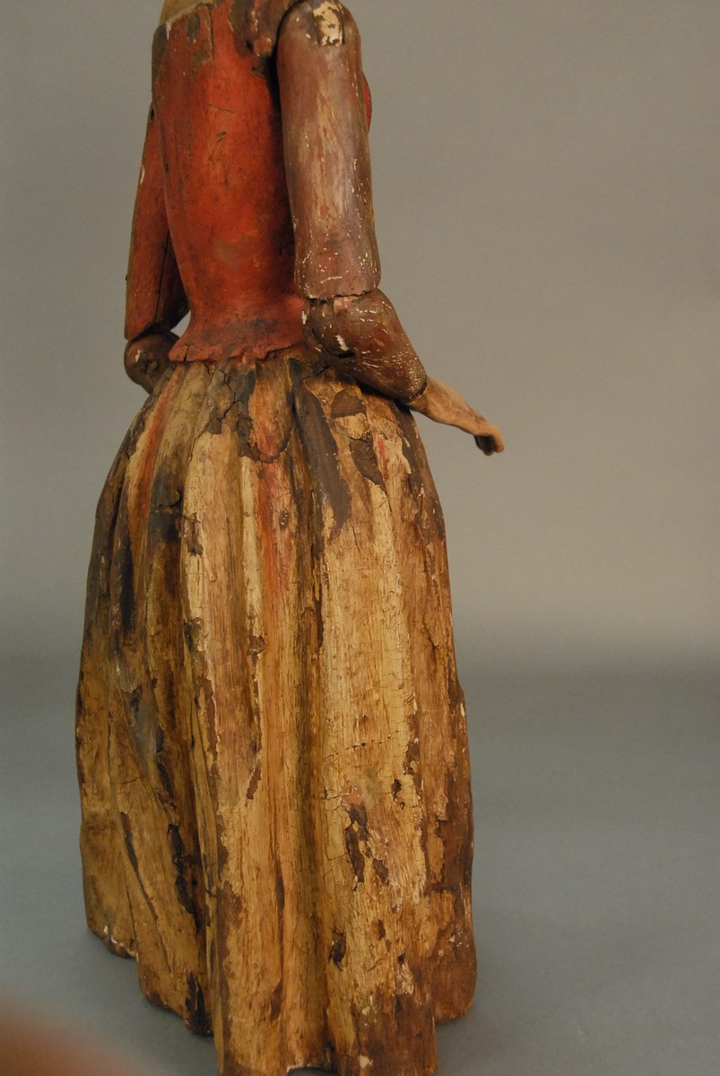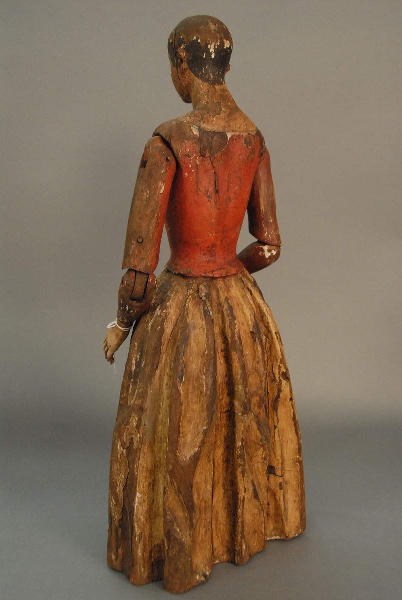 Lot 606: Carved wood Spanish Colonial polychrome and gesso Santos figure of a woman with jointed arms and hands. ht. 25 1/4 in.