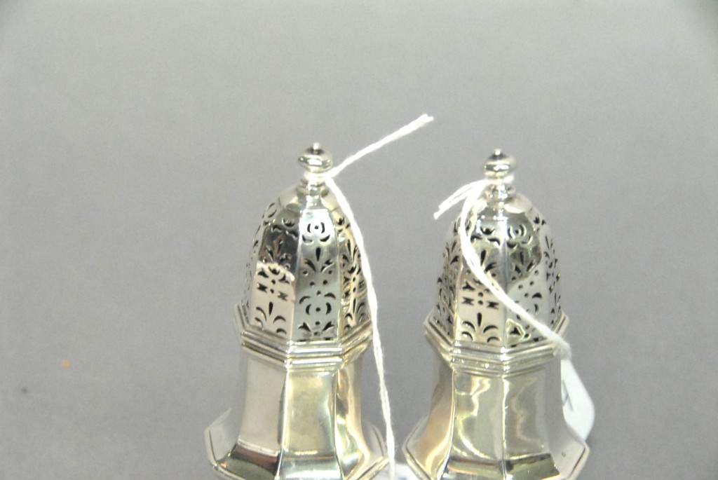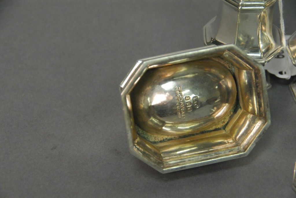 Lot 607: Crichton lot with pair of open salts and pair of pepper shakers marked Crichton Bros N.Y. London. – ht. 4in. 11.4 t oz.