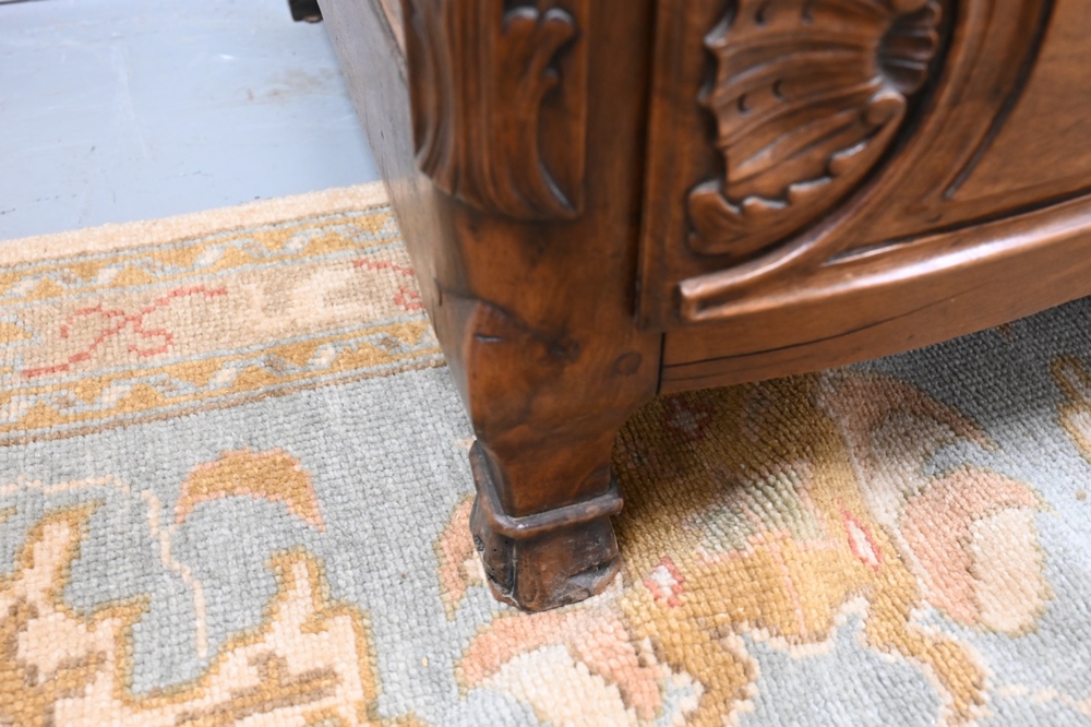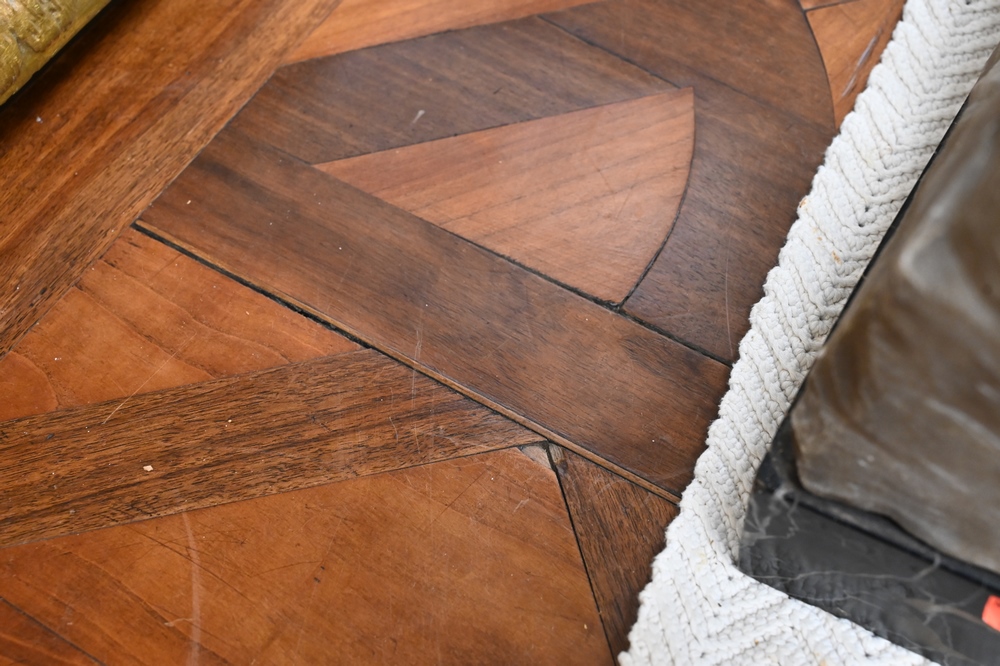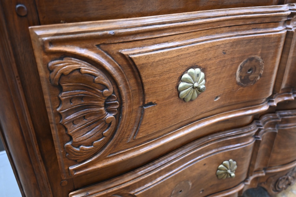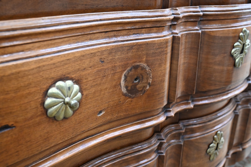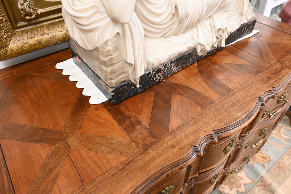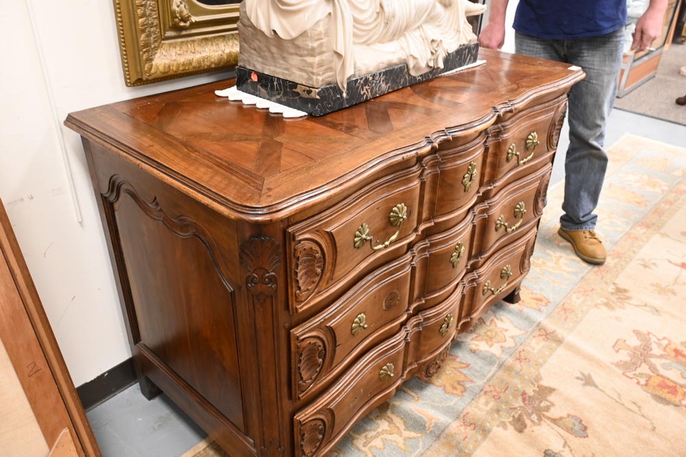 Lot 607: Louis XV Provincial Commode, having three drawers and wood inlaid top, 18th century, height 35 inches, top 26″ x 53″.