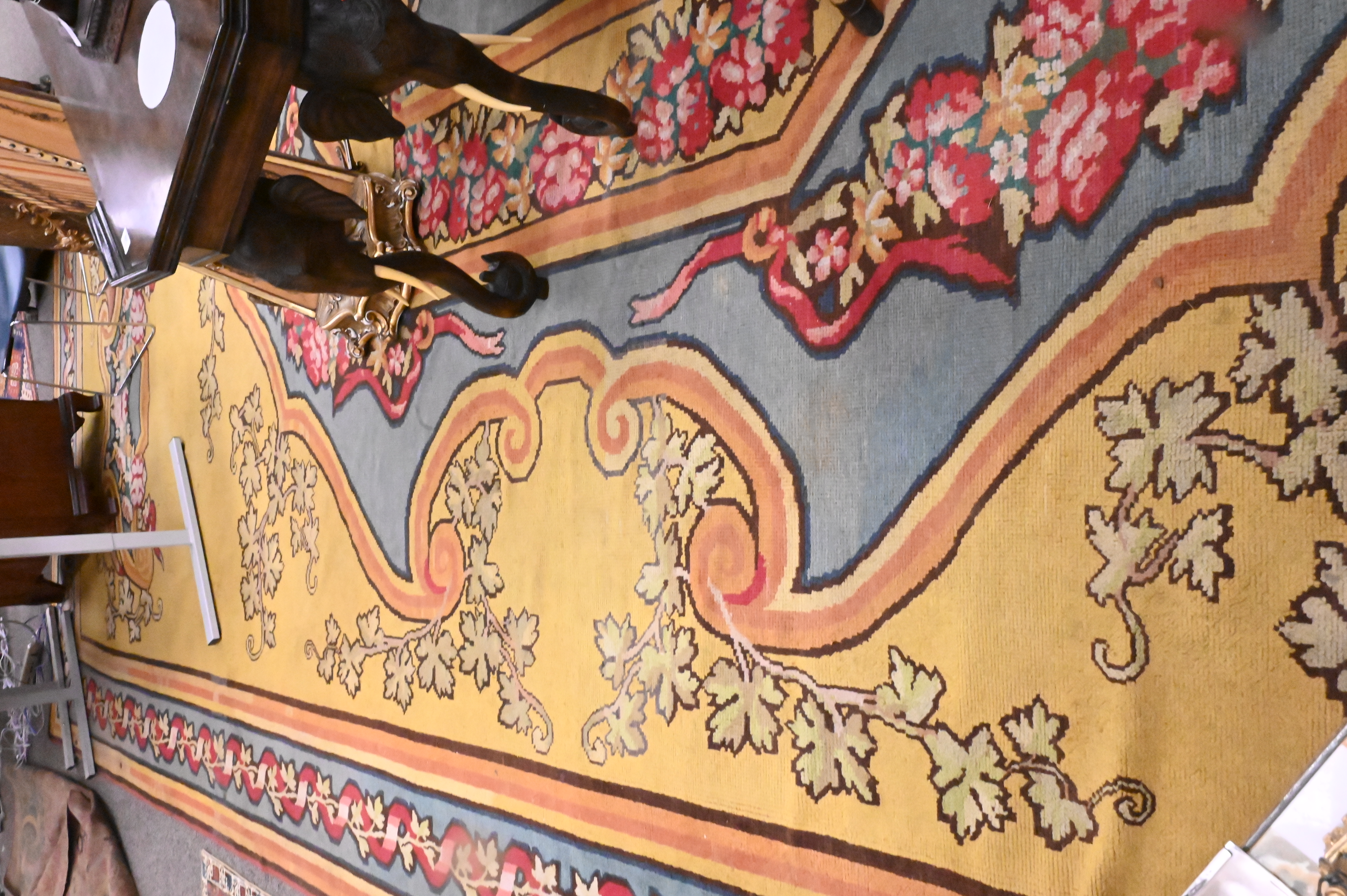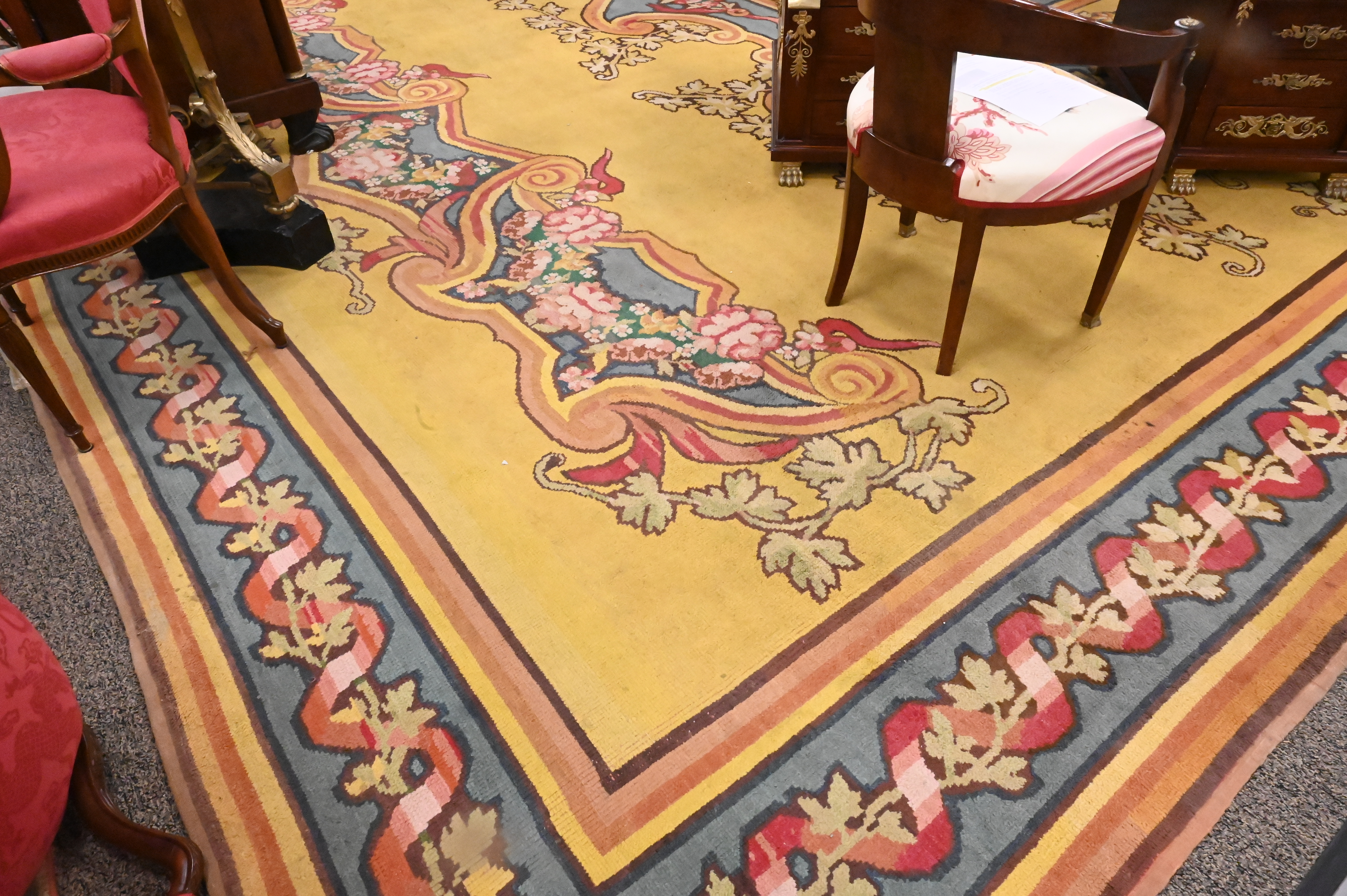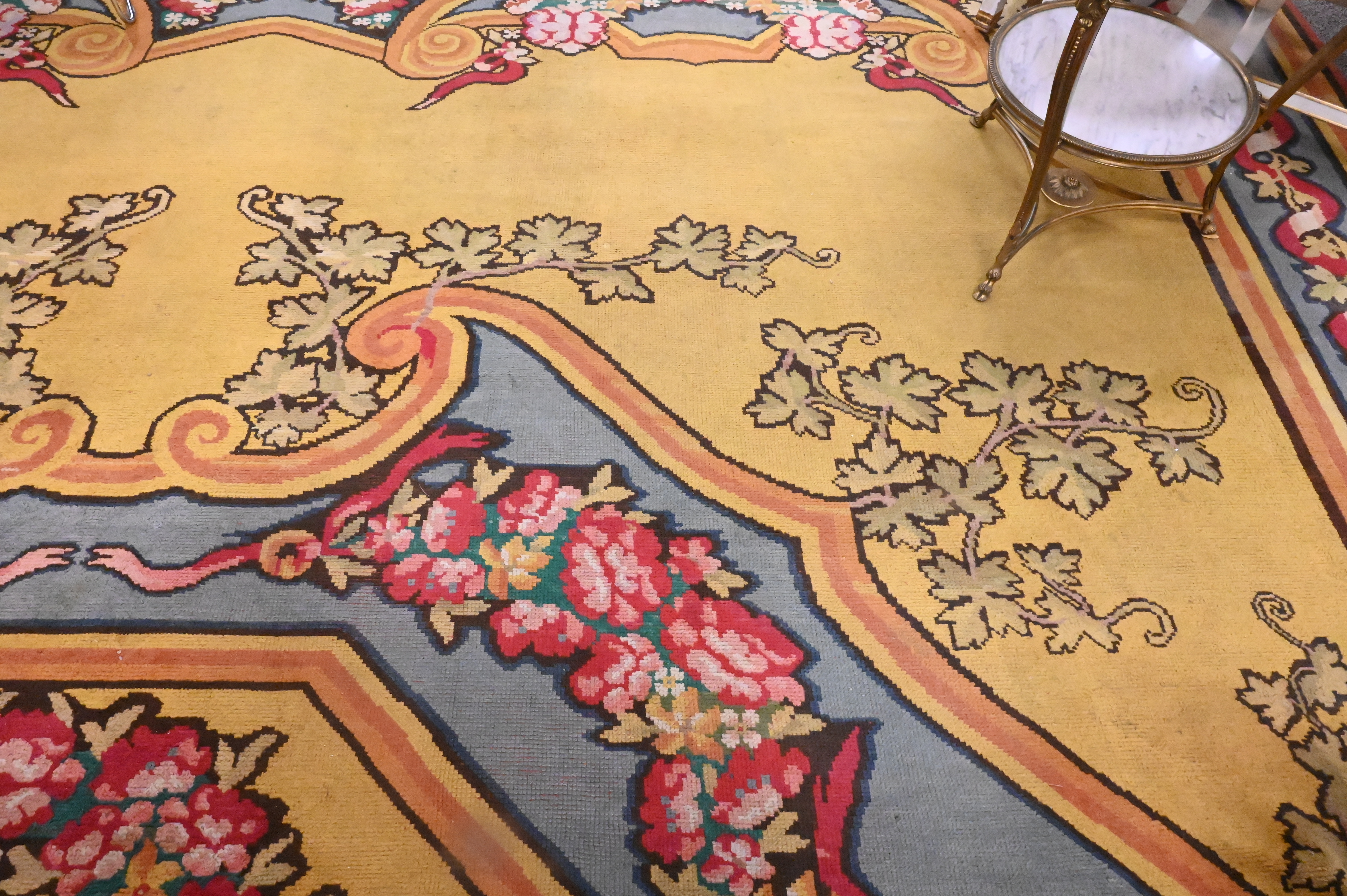 having a yellow field with floral garlands, filled cartouches and stepwork within a ribbon and vinery border, 19th century