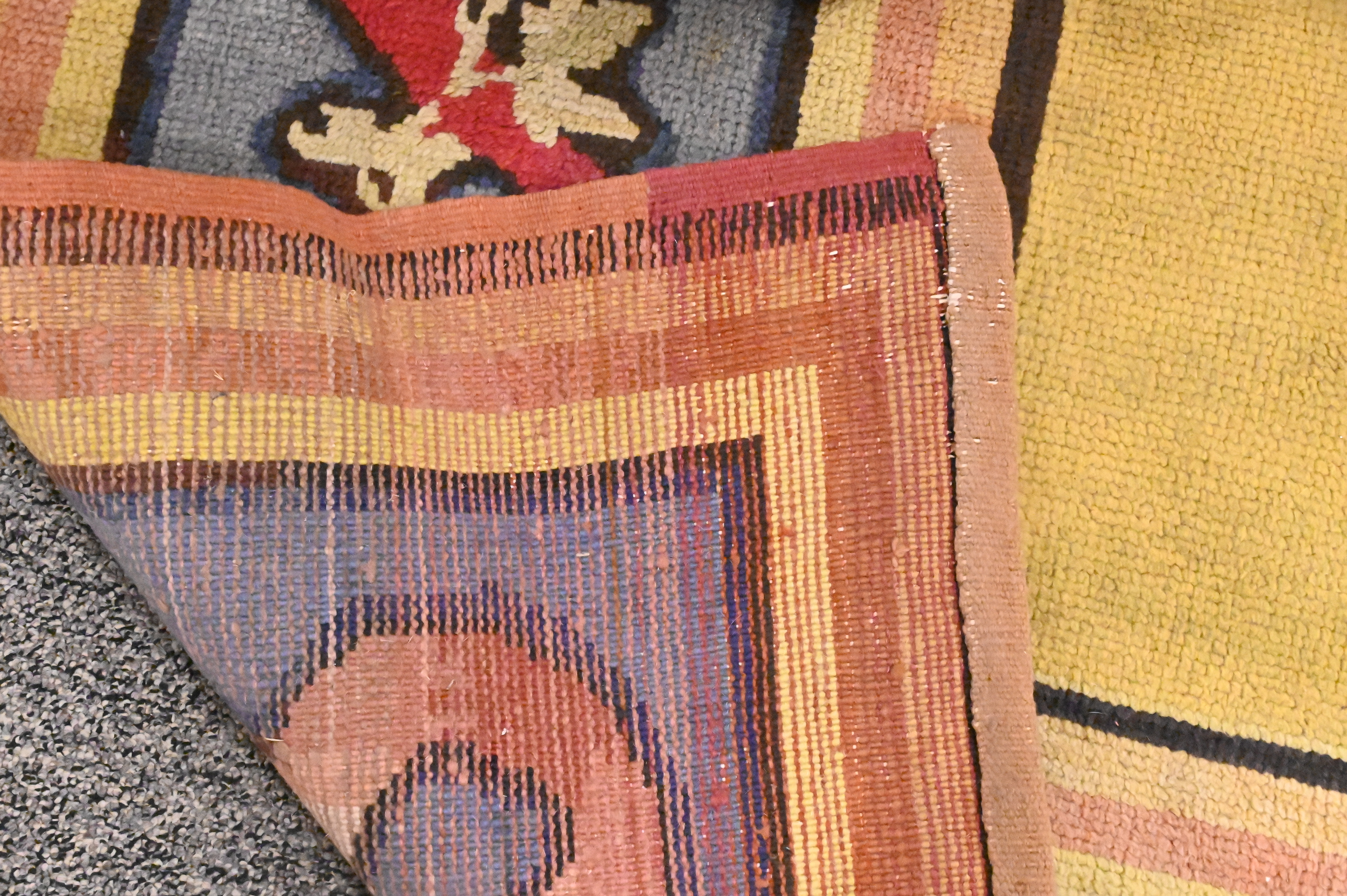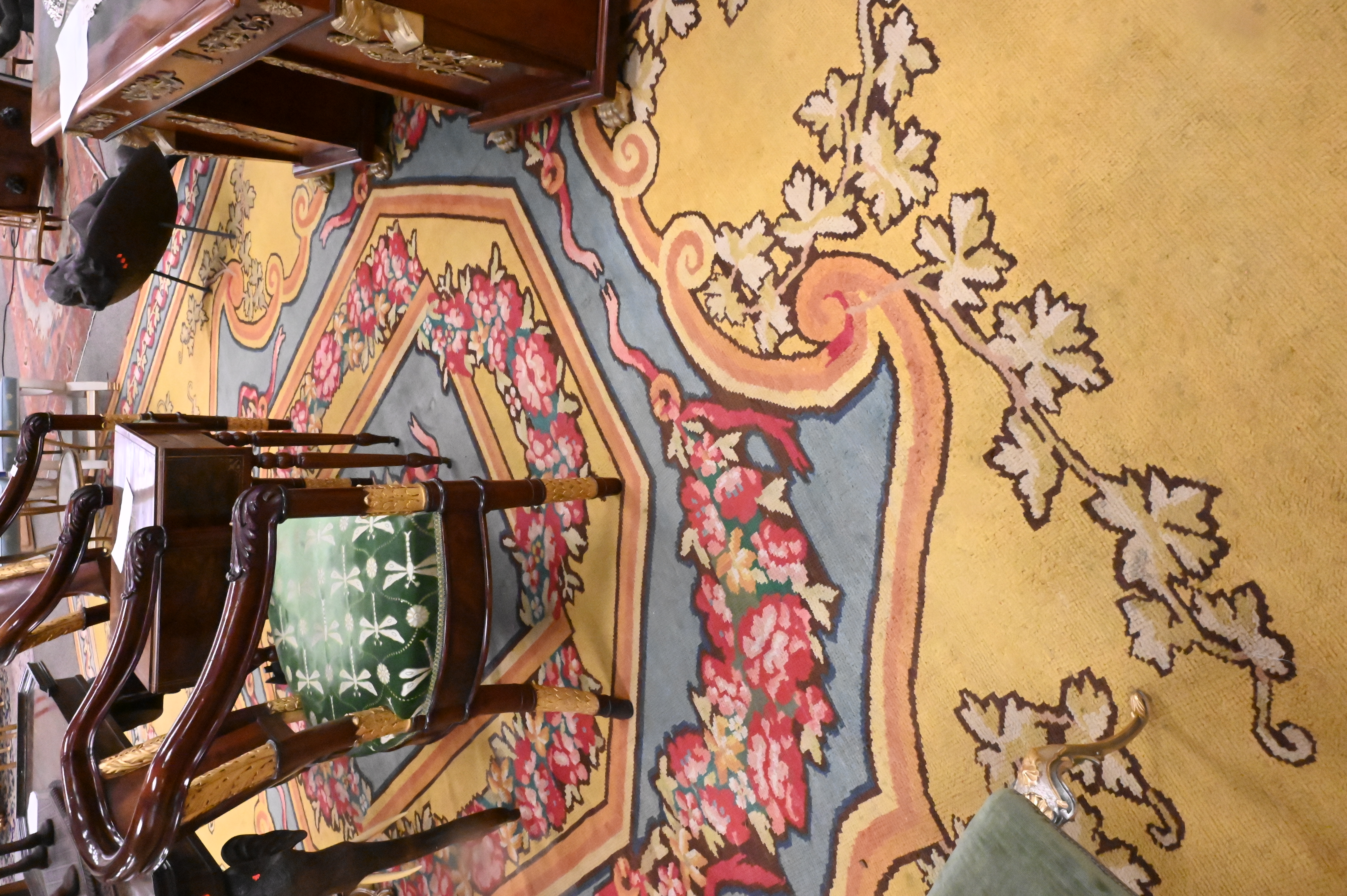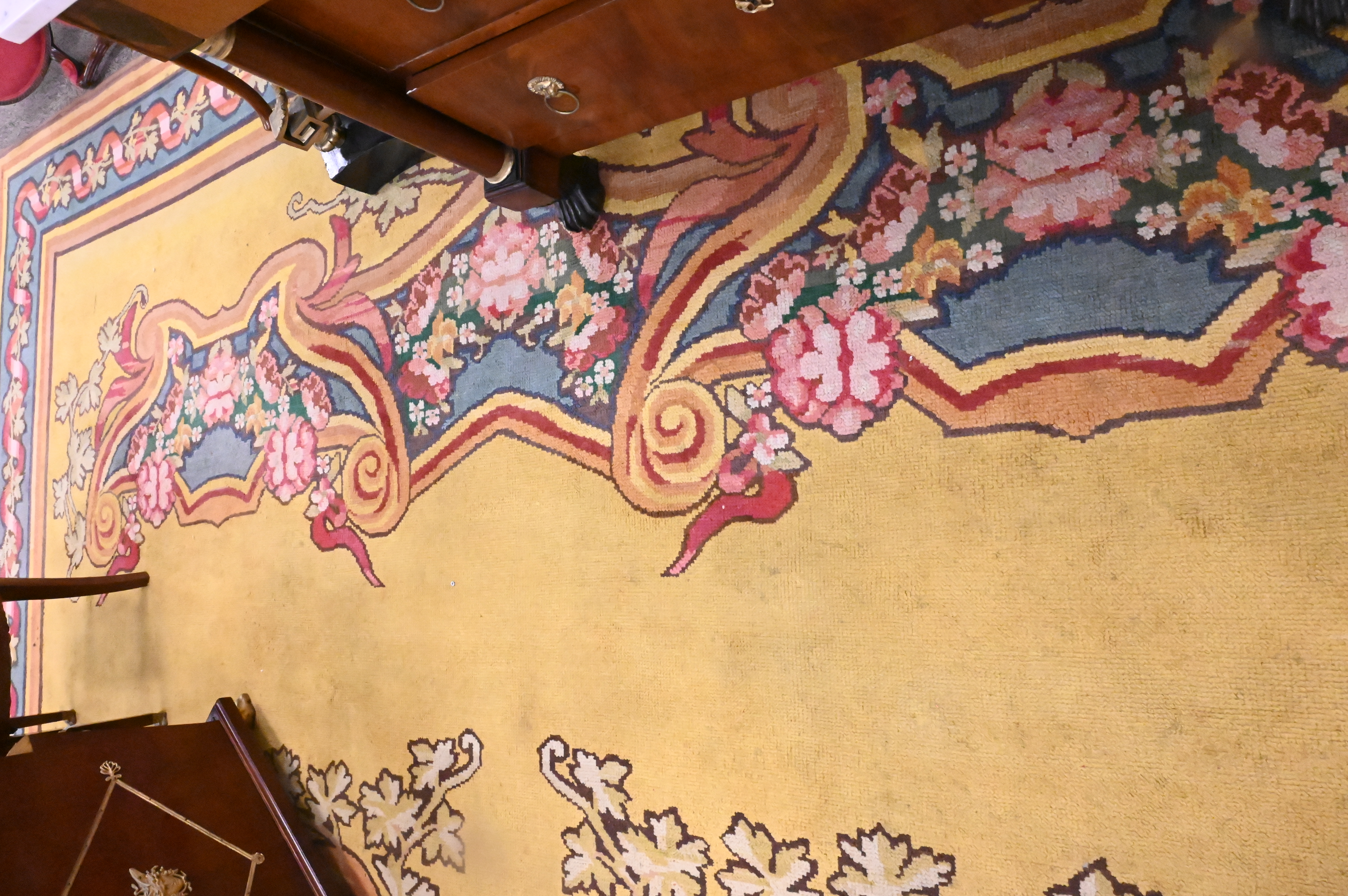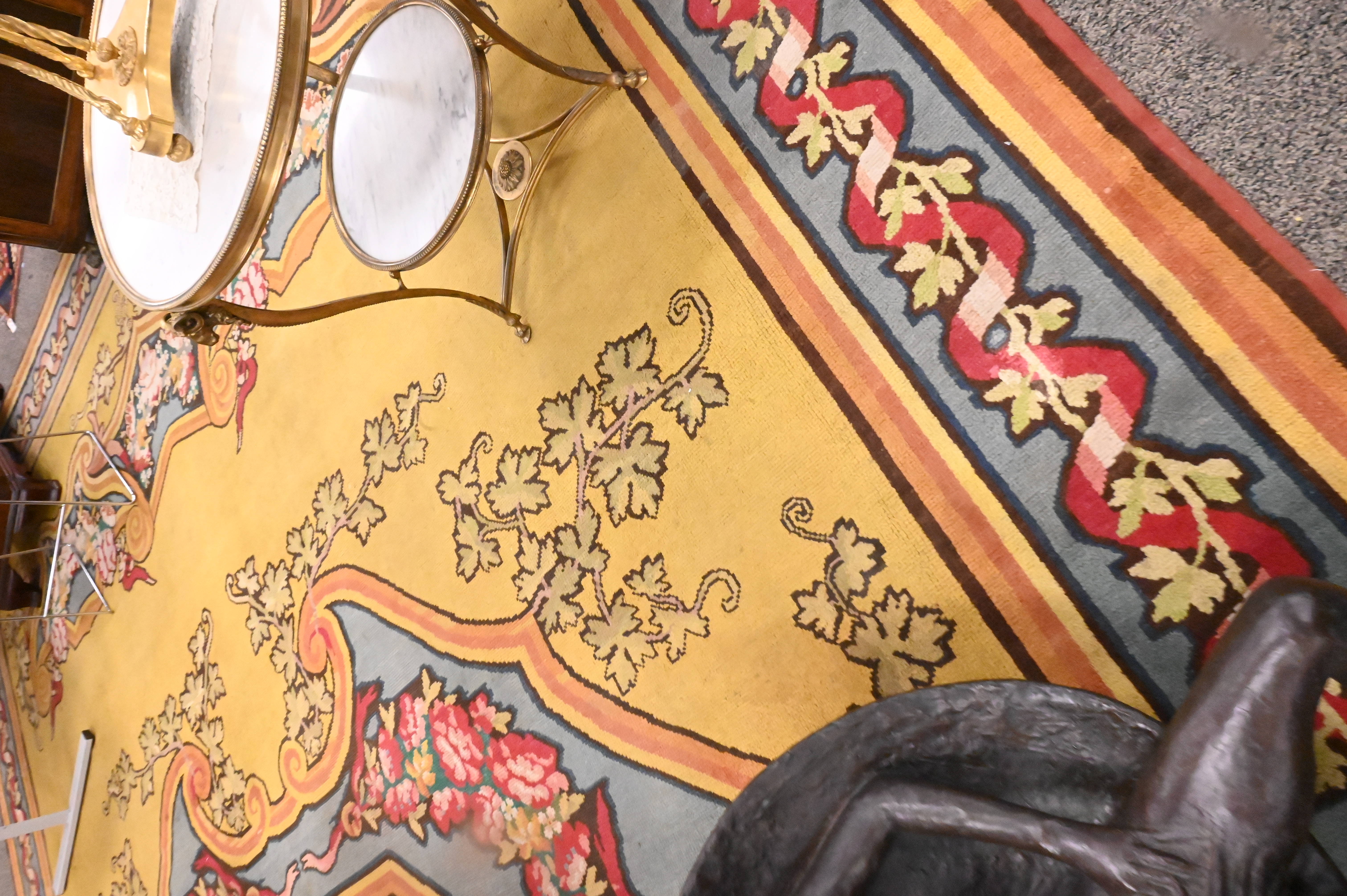 having a yellow field with floral garlands, filled cartouches and stepwork within a ribbon and vinery border, 19th century