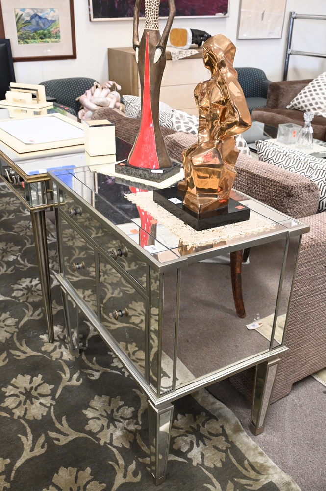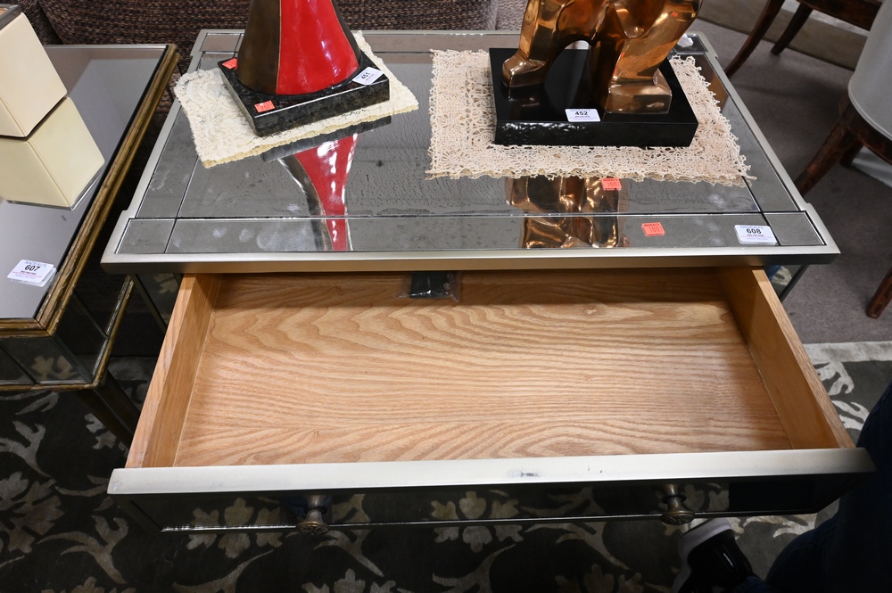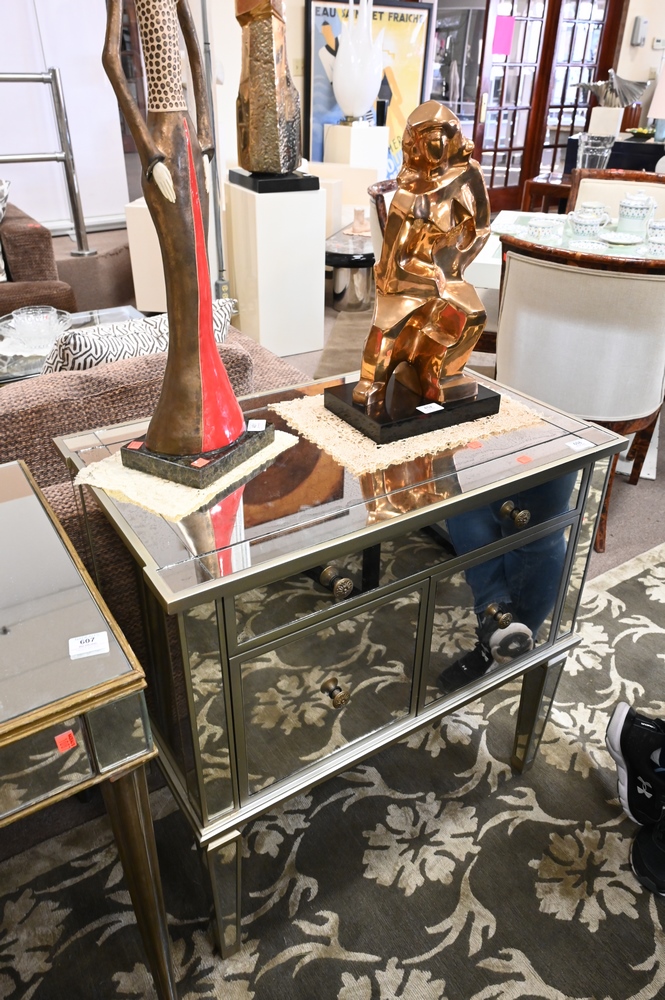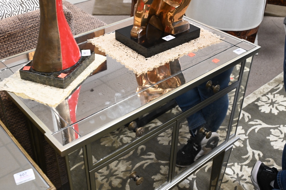 Lot 608: Contemporary Mirrored Cabinet, having one long drawer over two drawers set on square tapered legs, height 30.5 inches, top length 30 inches.