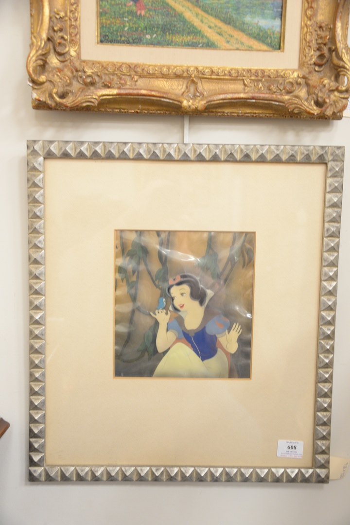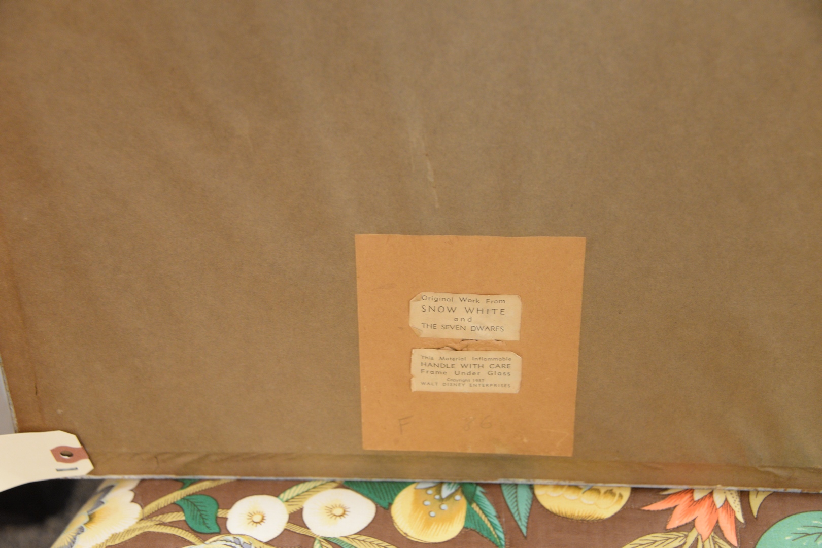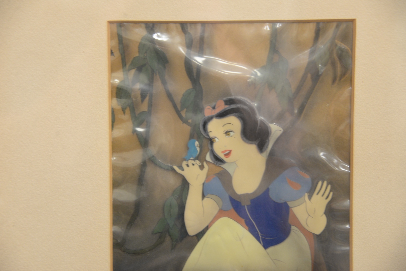Lot 608: Disney Snow White and the Seven Dwarfs Production Cel scene of Snow White with a bird in the forest 8 1/2 x 8 1/2 Provenance: Wil…