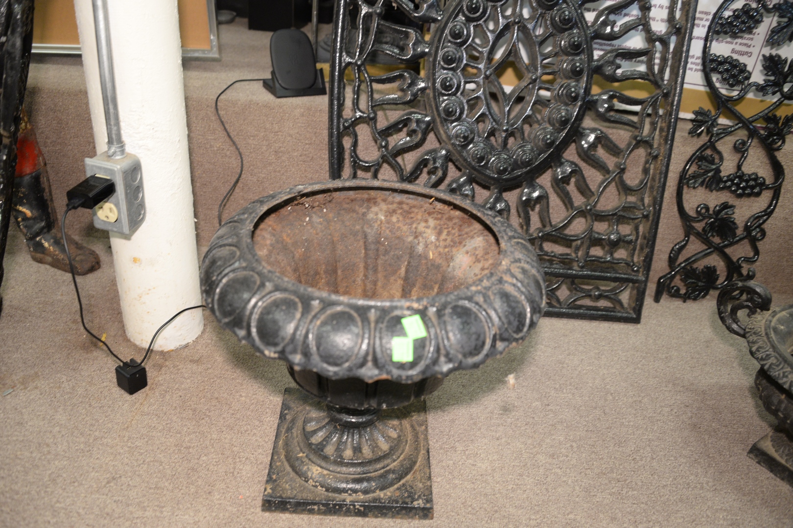 Lot 608: Five Piece Victorian Iron Lot to include three panel window grate and one small urn 19th Century 23 x 33 Provenance: The Estate o…