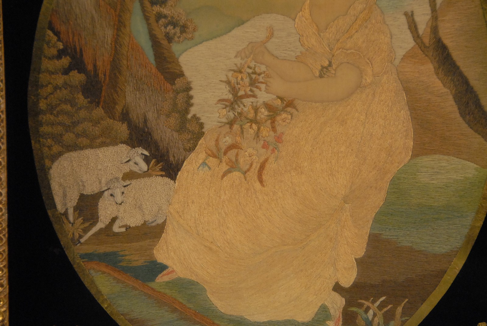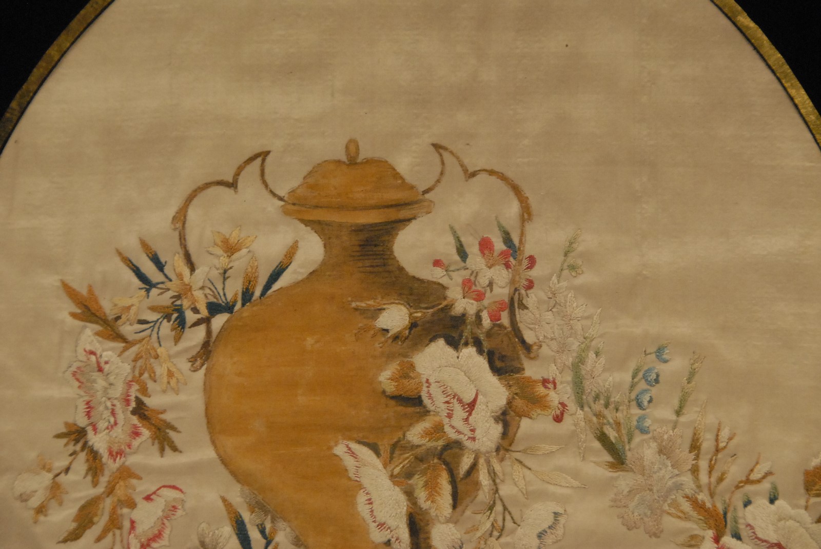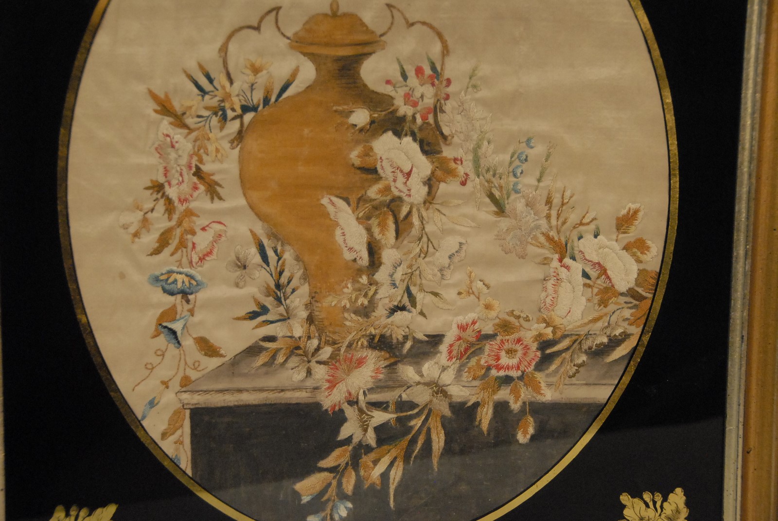 Lot 608: Two oil on silk embroideries one depicting Little Bo Peep sitting down and the other of urn with flowers. 14 x 11 1/2 and 15 1/2 x 13 1/2